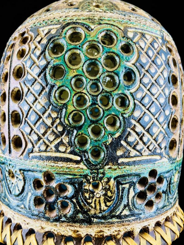 Grape bunches and flower motifs are incorporated into the ceramic, which give a beautiful effect when the lamp lights up.