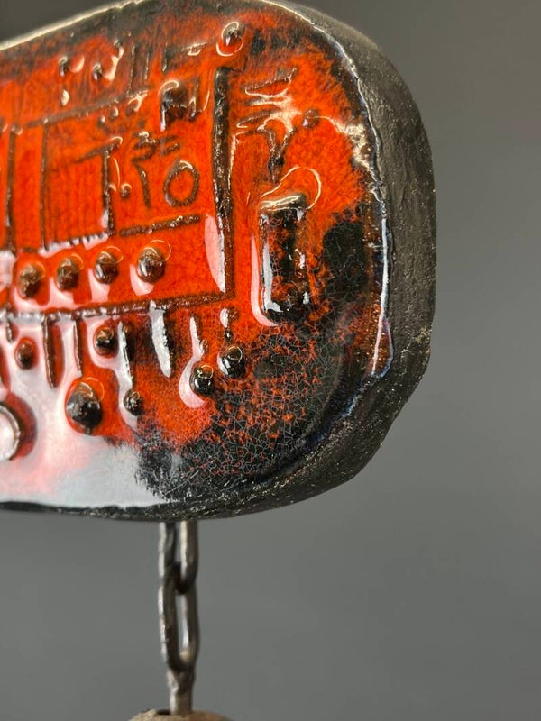 Constructed of five amulets, matte and high-gloss glaze, an exceptional piece held together by wrought iron chains and large ceramic beads. Top amulet is marked.