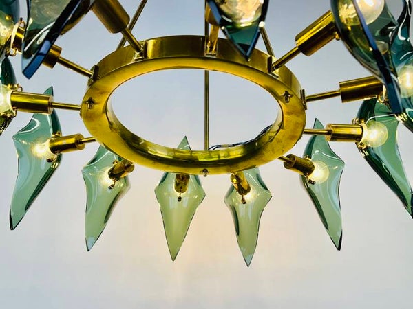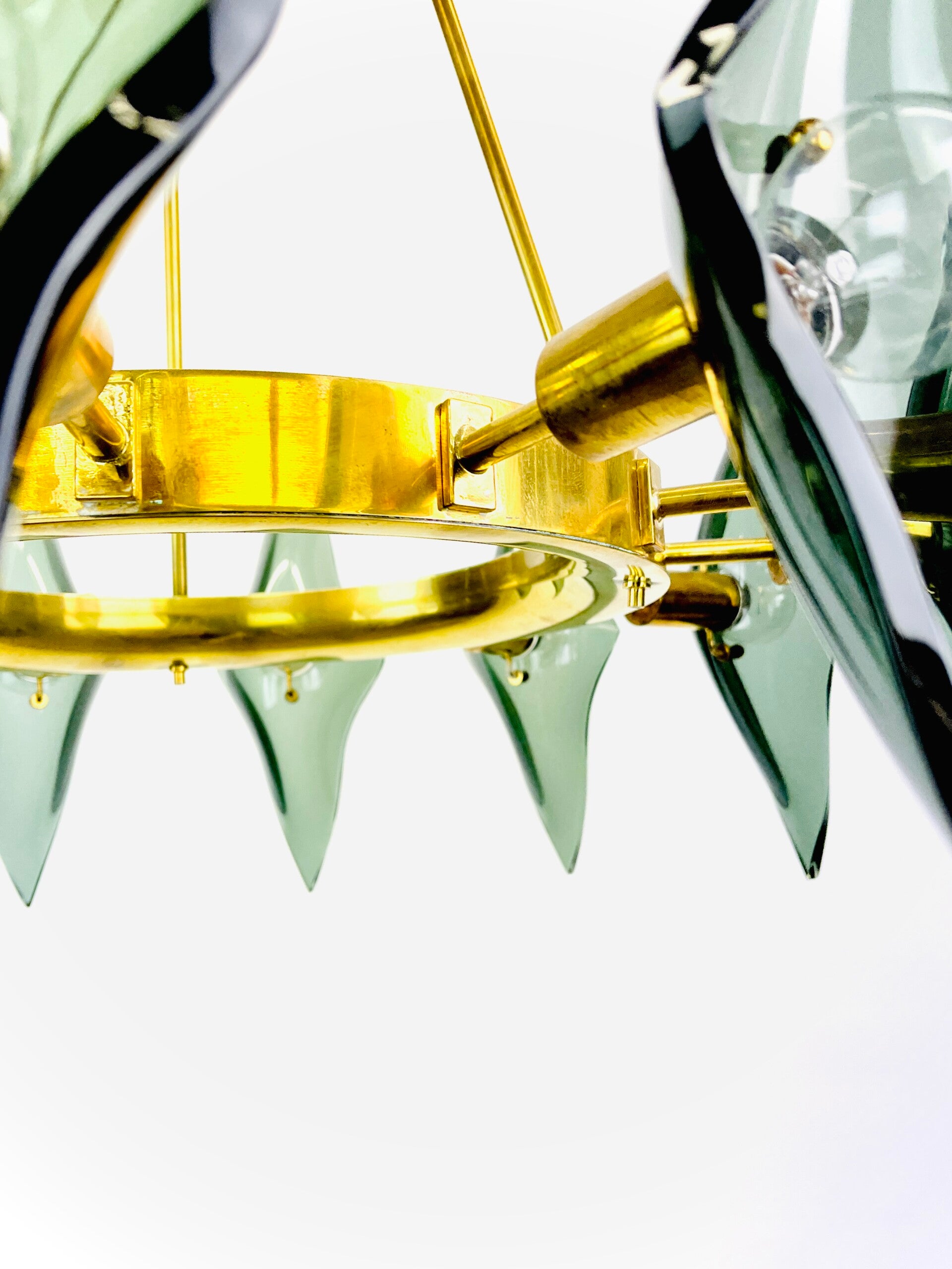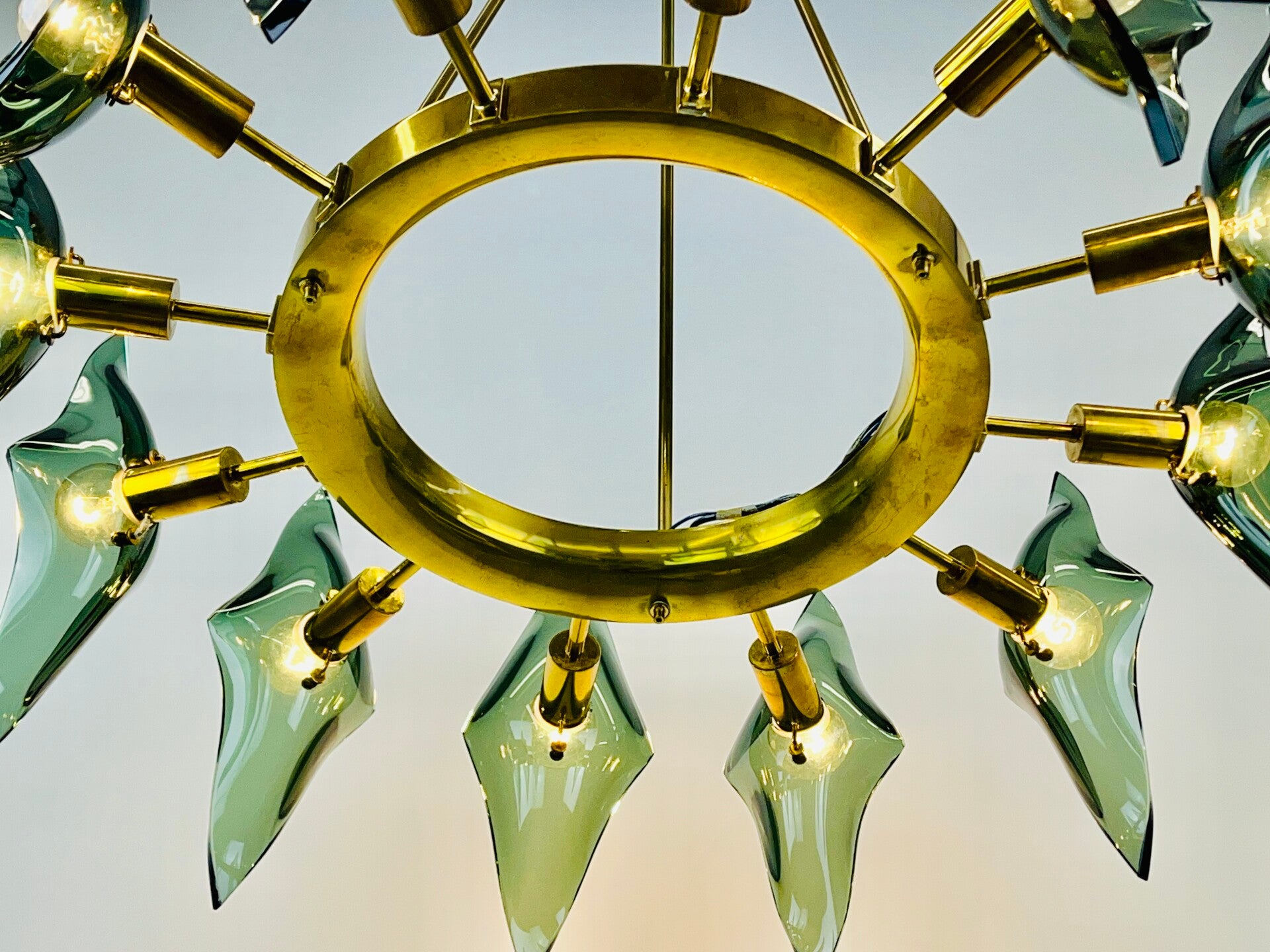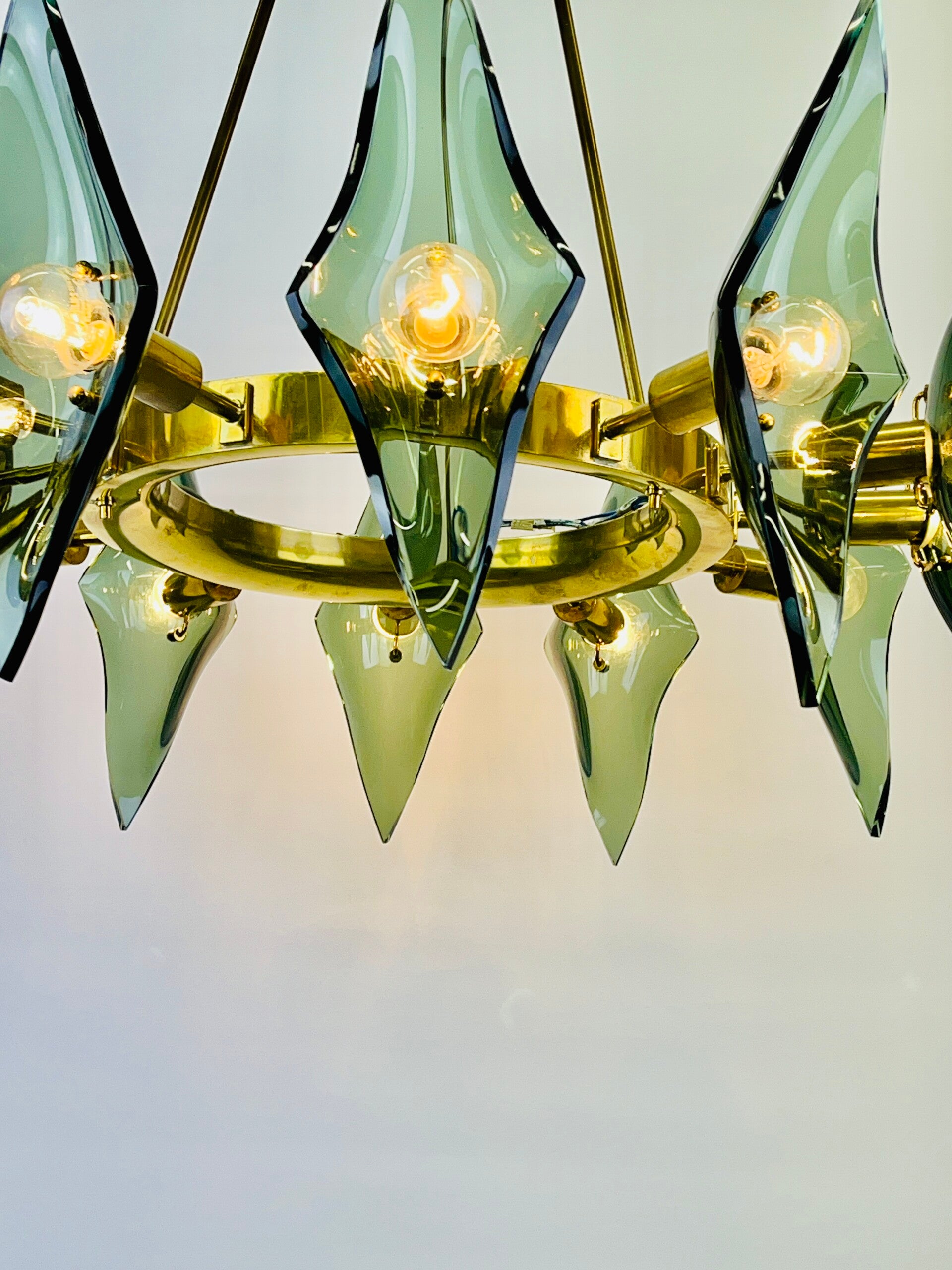 A sturdy rounded base ring made of solid brass that holds no less than 12 light points, each light point is provided with a cut diamond of thick green glass.
