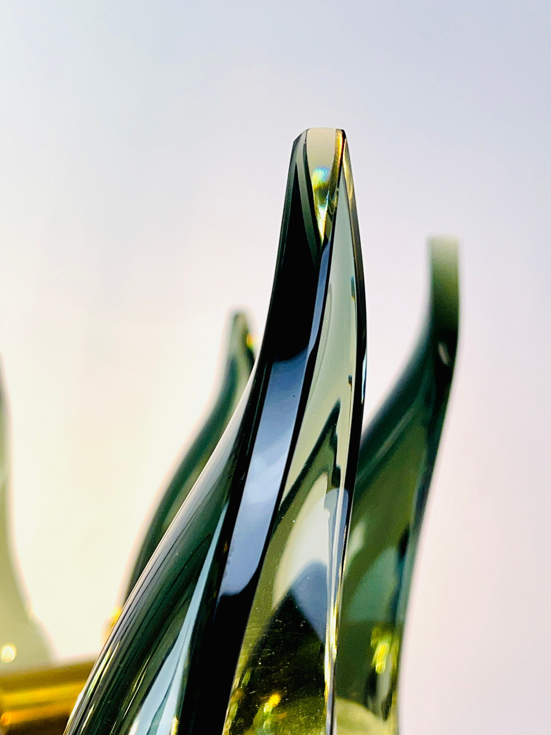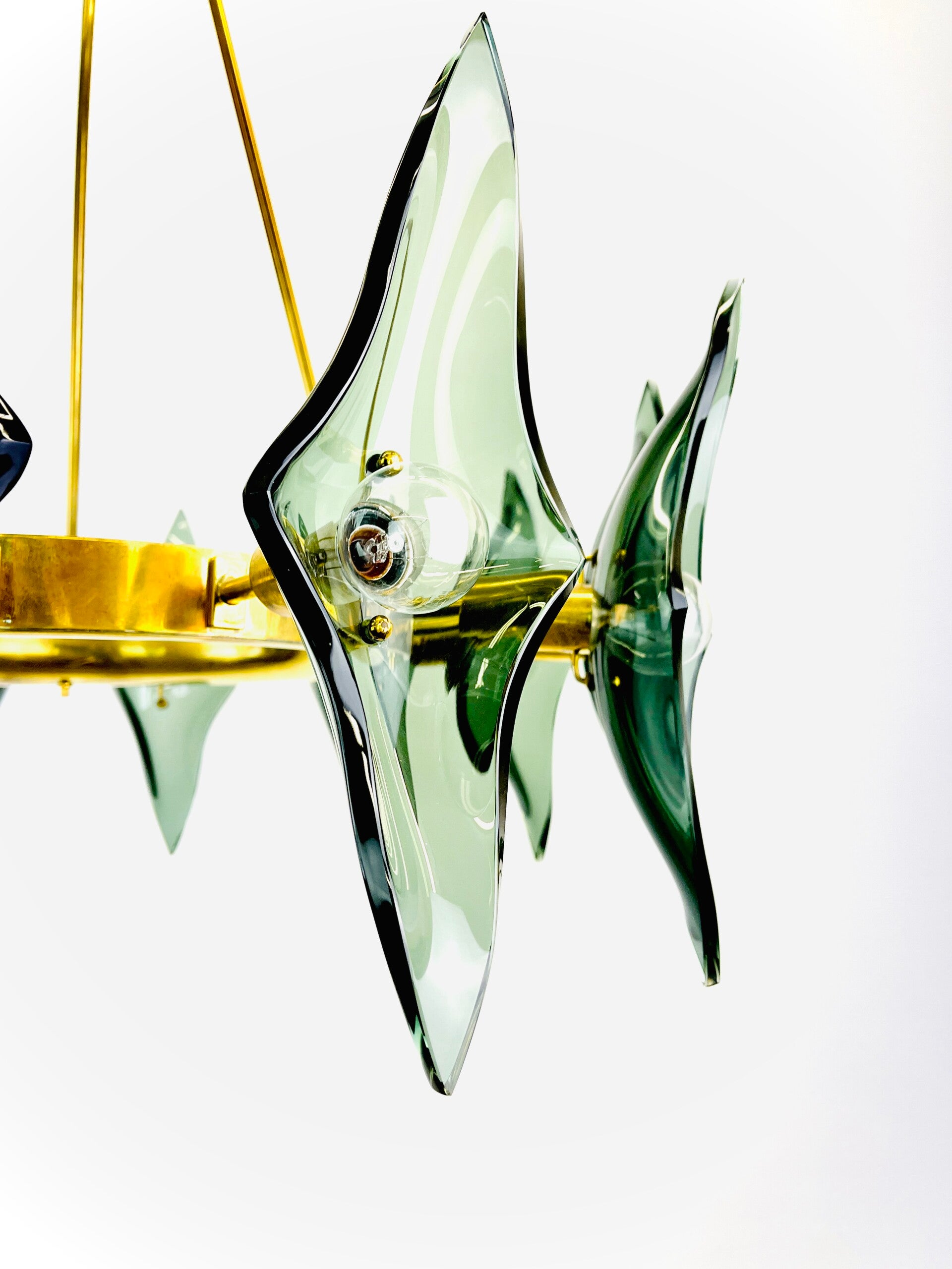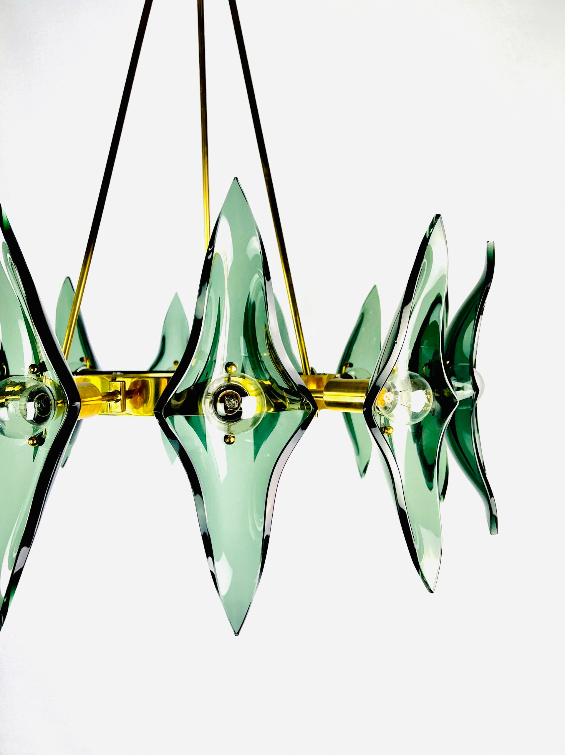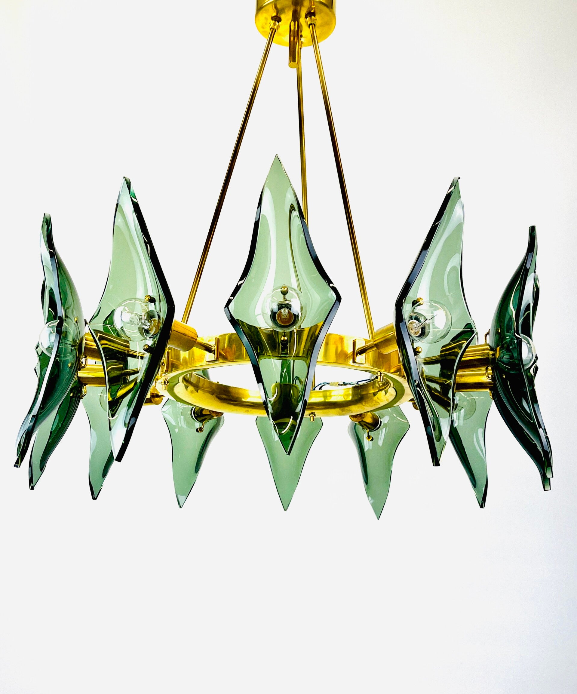 A sturdy rounded base ring made of solid brass that holds no less than 12 light points, each light point is provided with a cut diamond of thick green glass.