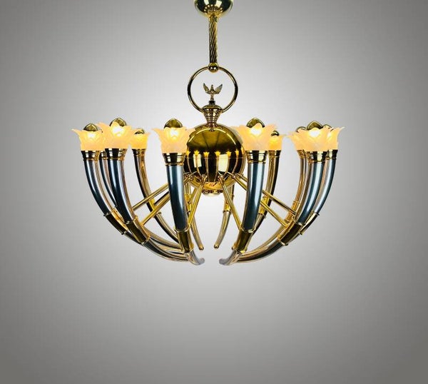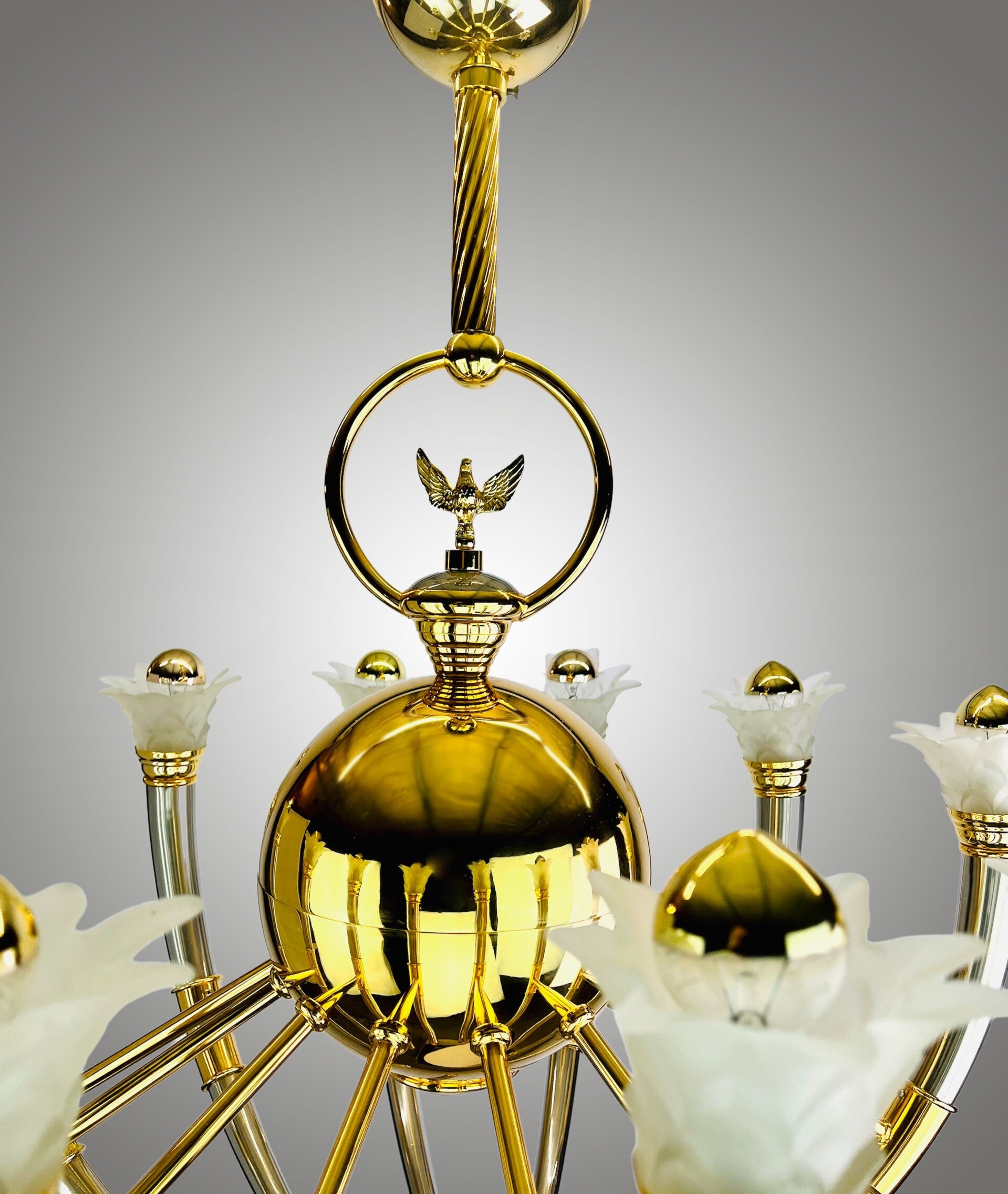 The chandelier feels and looks very luxurious, it is finished with 12 torches in satin nickel, other parts are in gold plated brass.