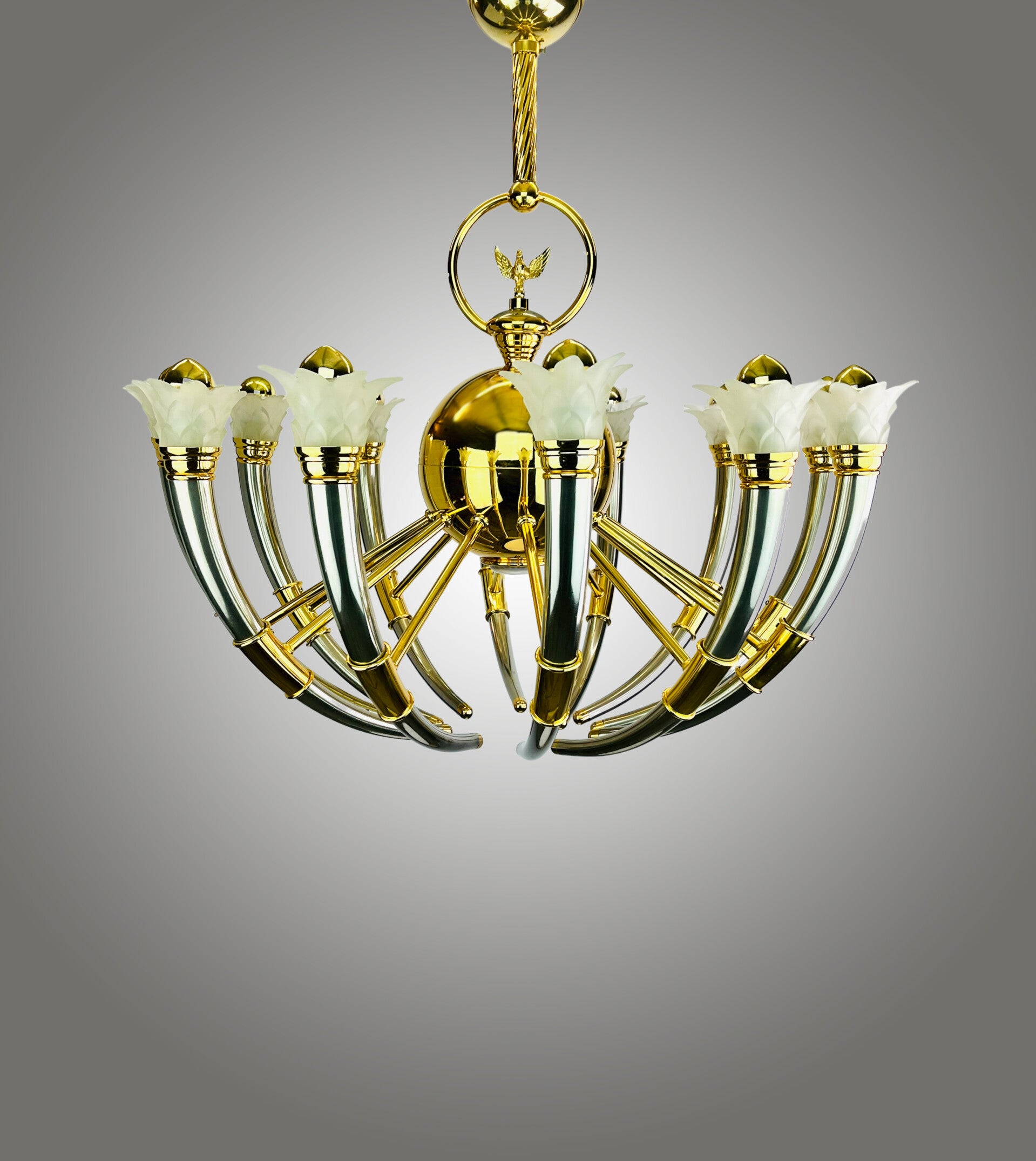 In addition to the 12 satin-finished torches, the chandelier has a 13th center of light in the gilded sphere, which shines downwards.