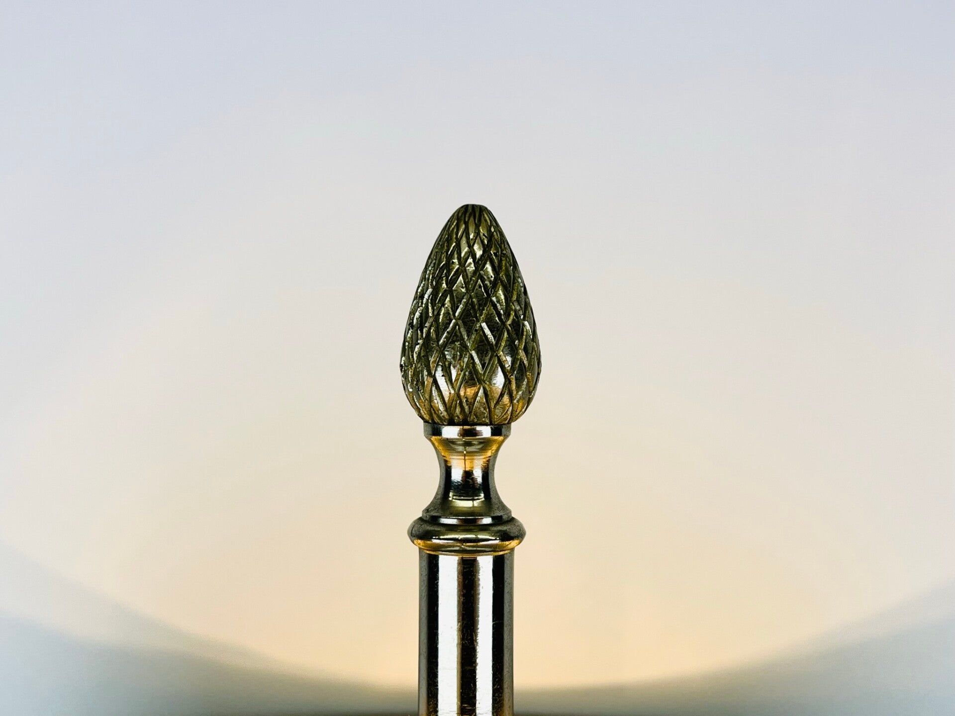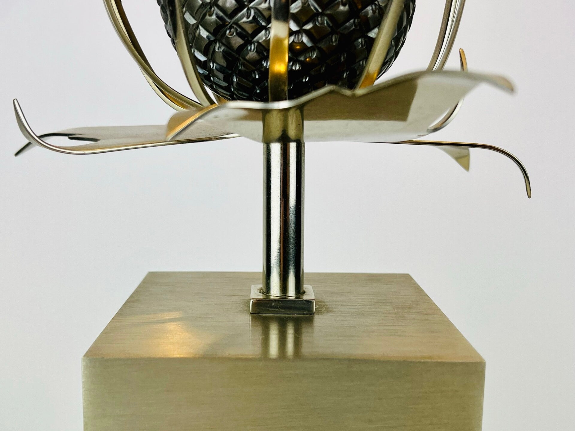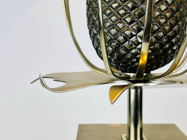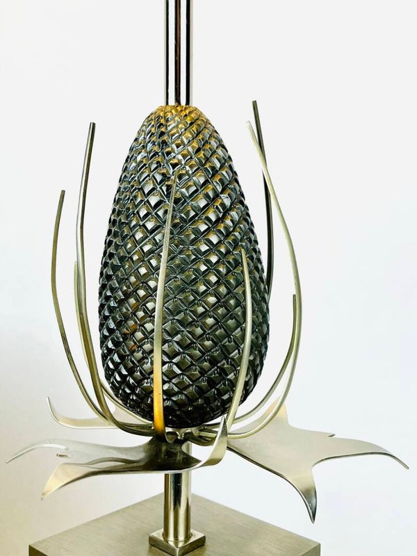 The lamp carries its original lampshade made of brushed steel, which is held together by a finely detailed pine cone.
