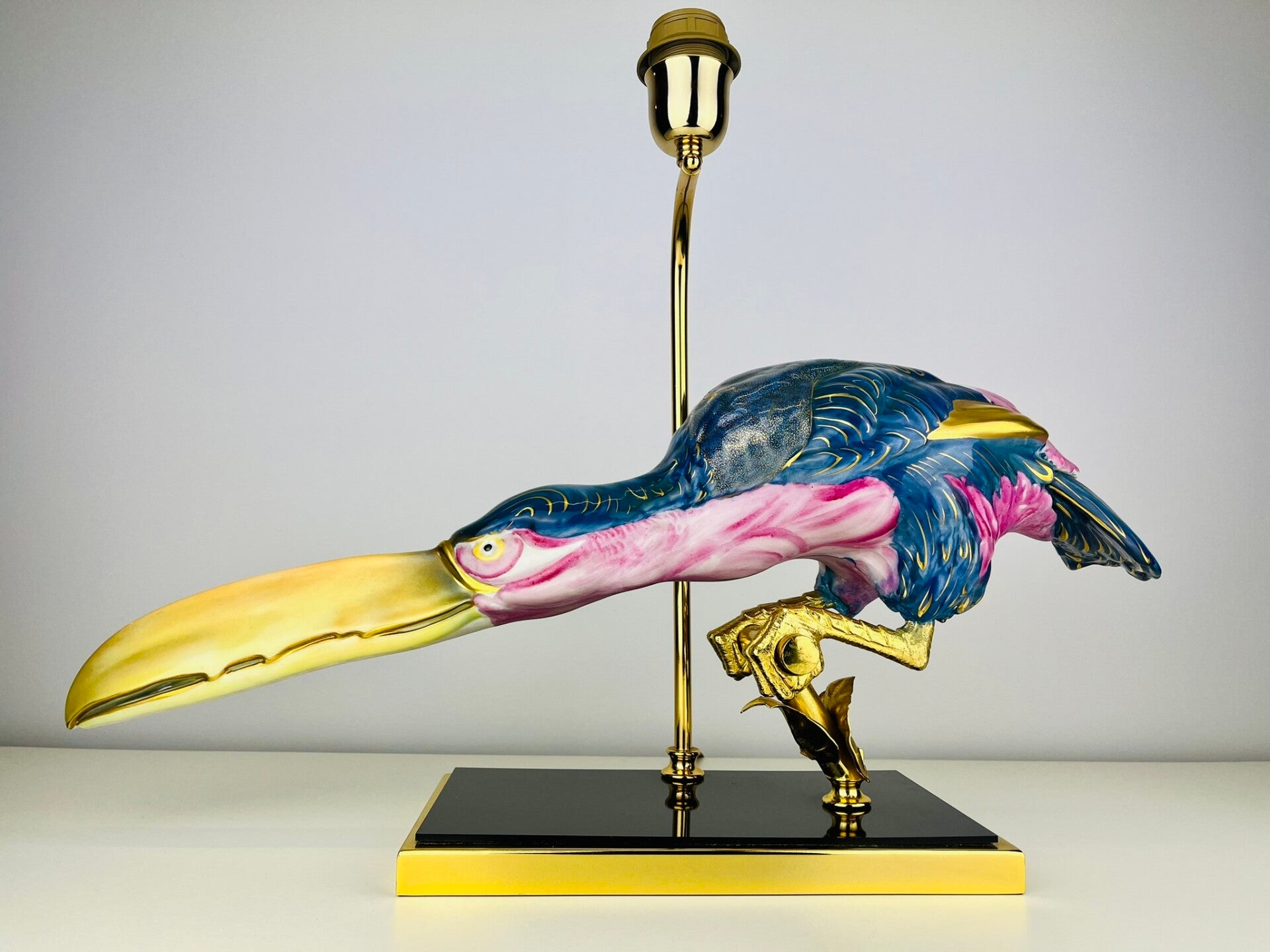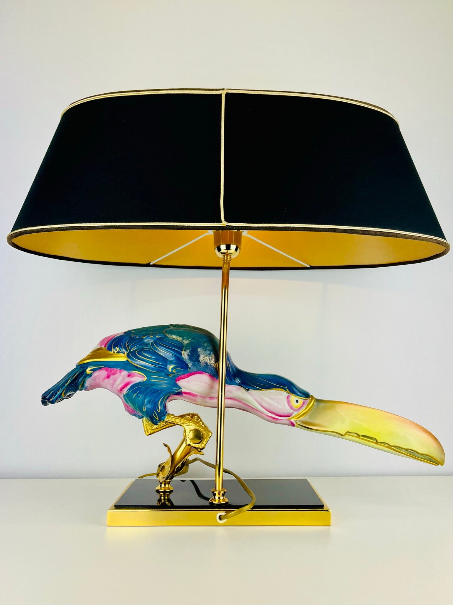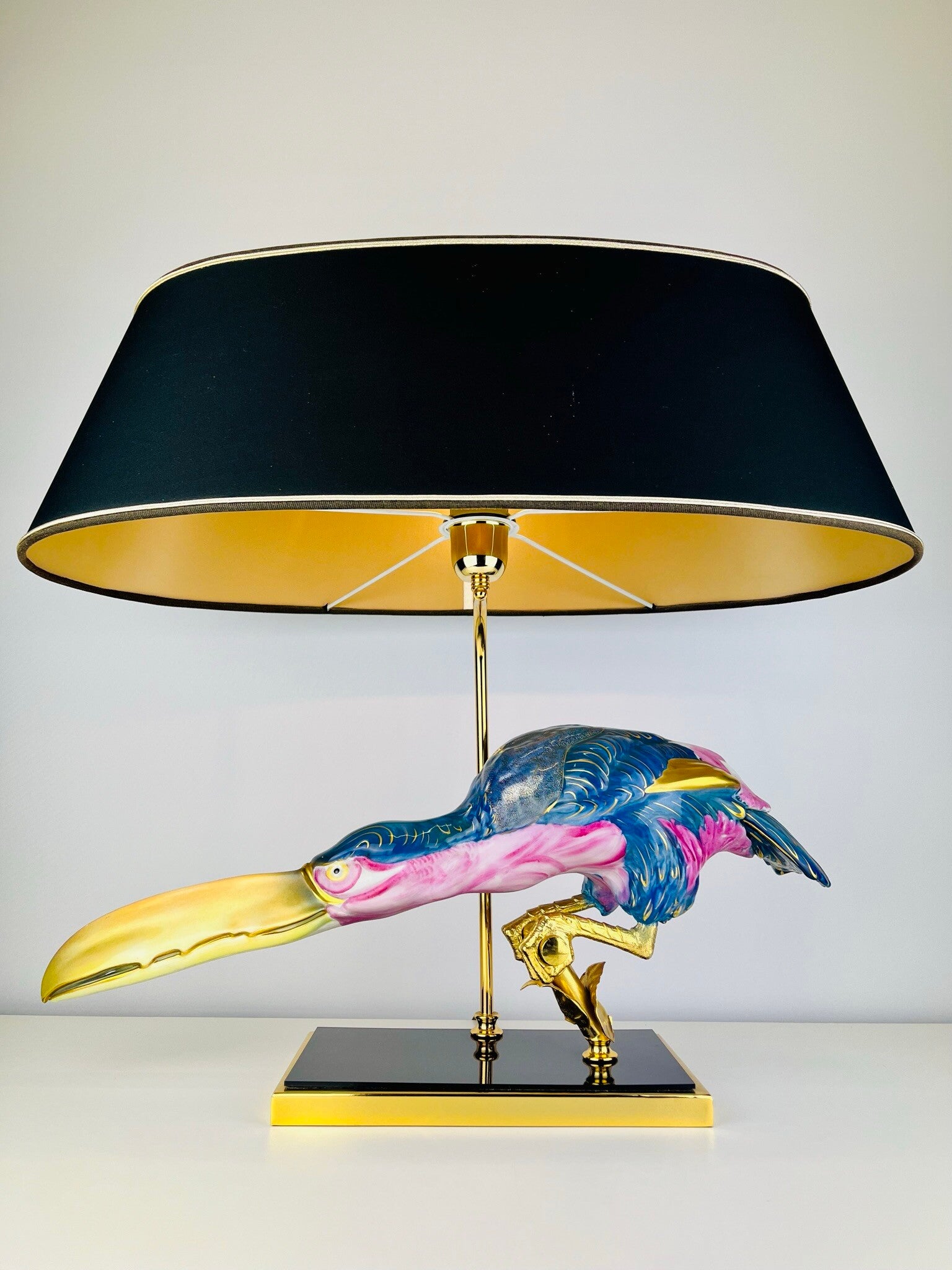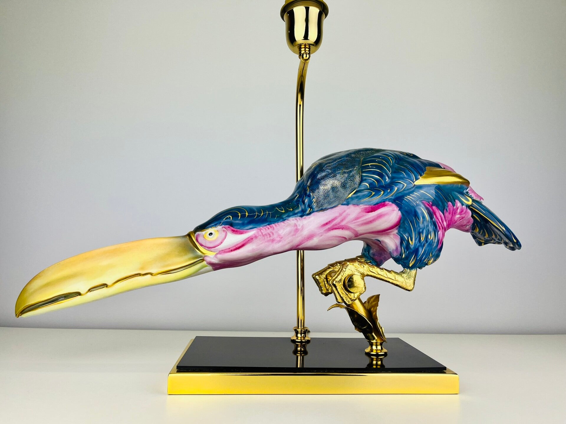 Large porcelain table lamp, glazed toucan in a combination of colorful shades with gold lacquer.
