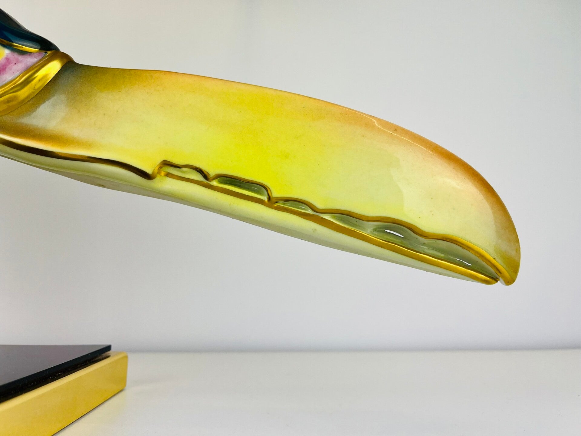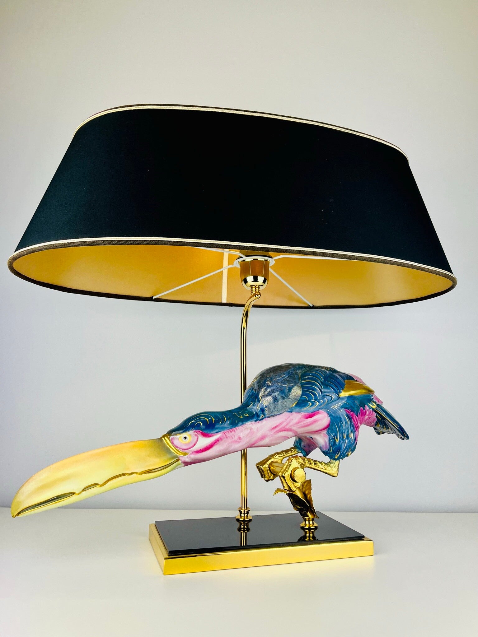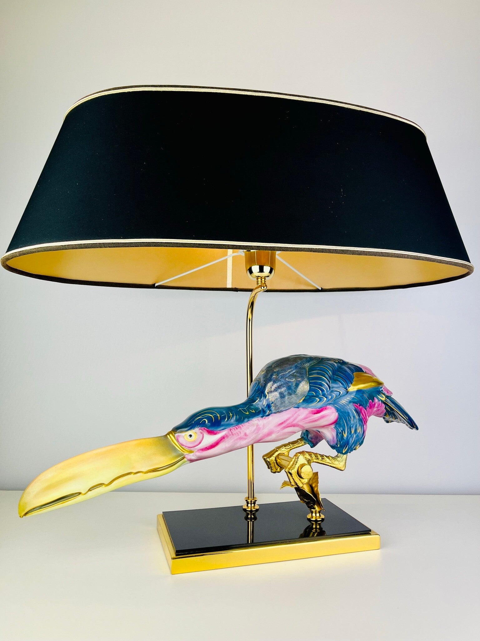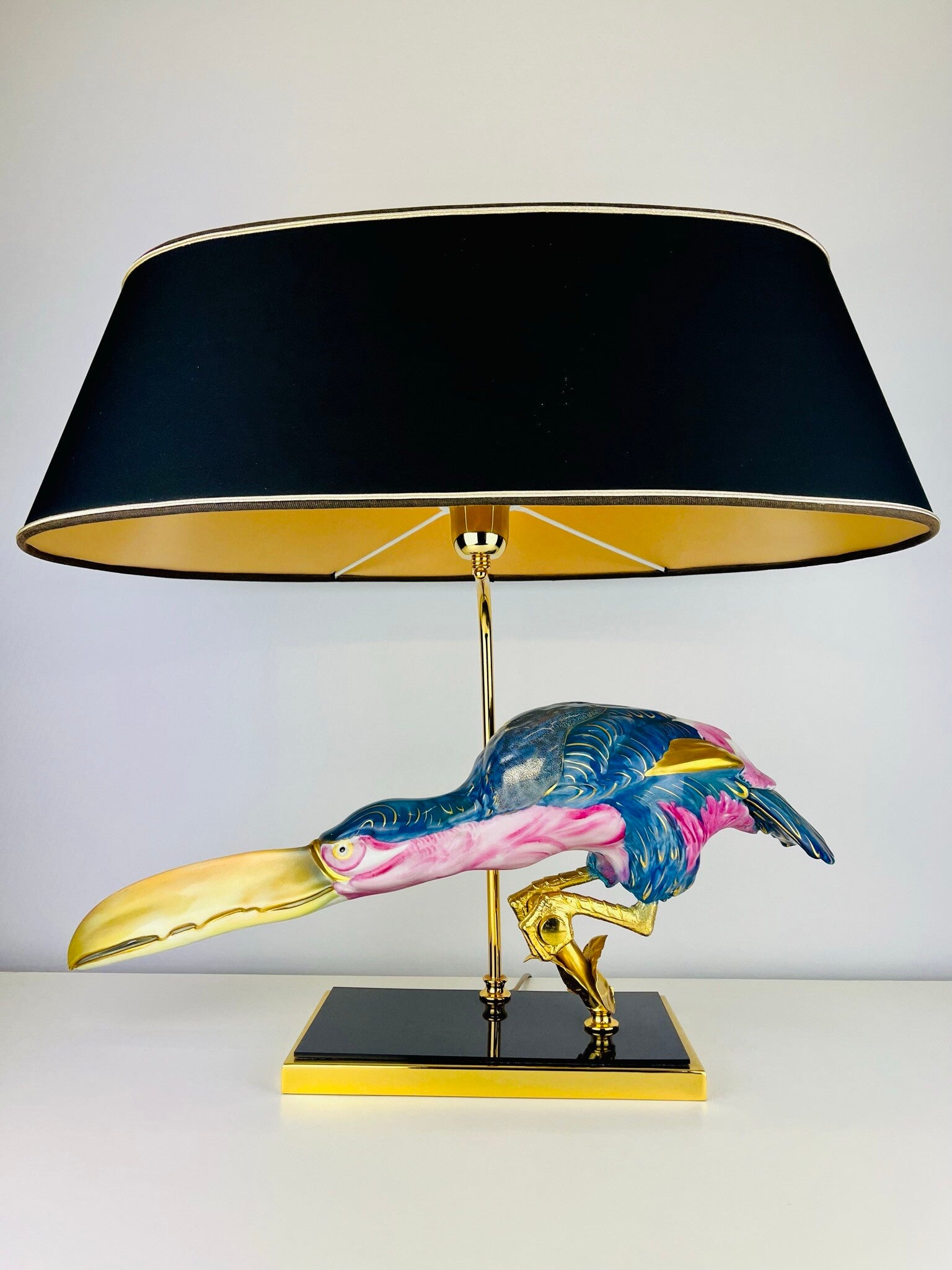 Large porcelain table lamp, glazed toucan in a combination of colorful shades with gold lacquer.