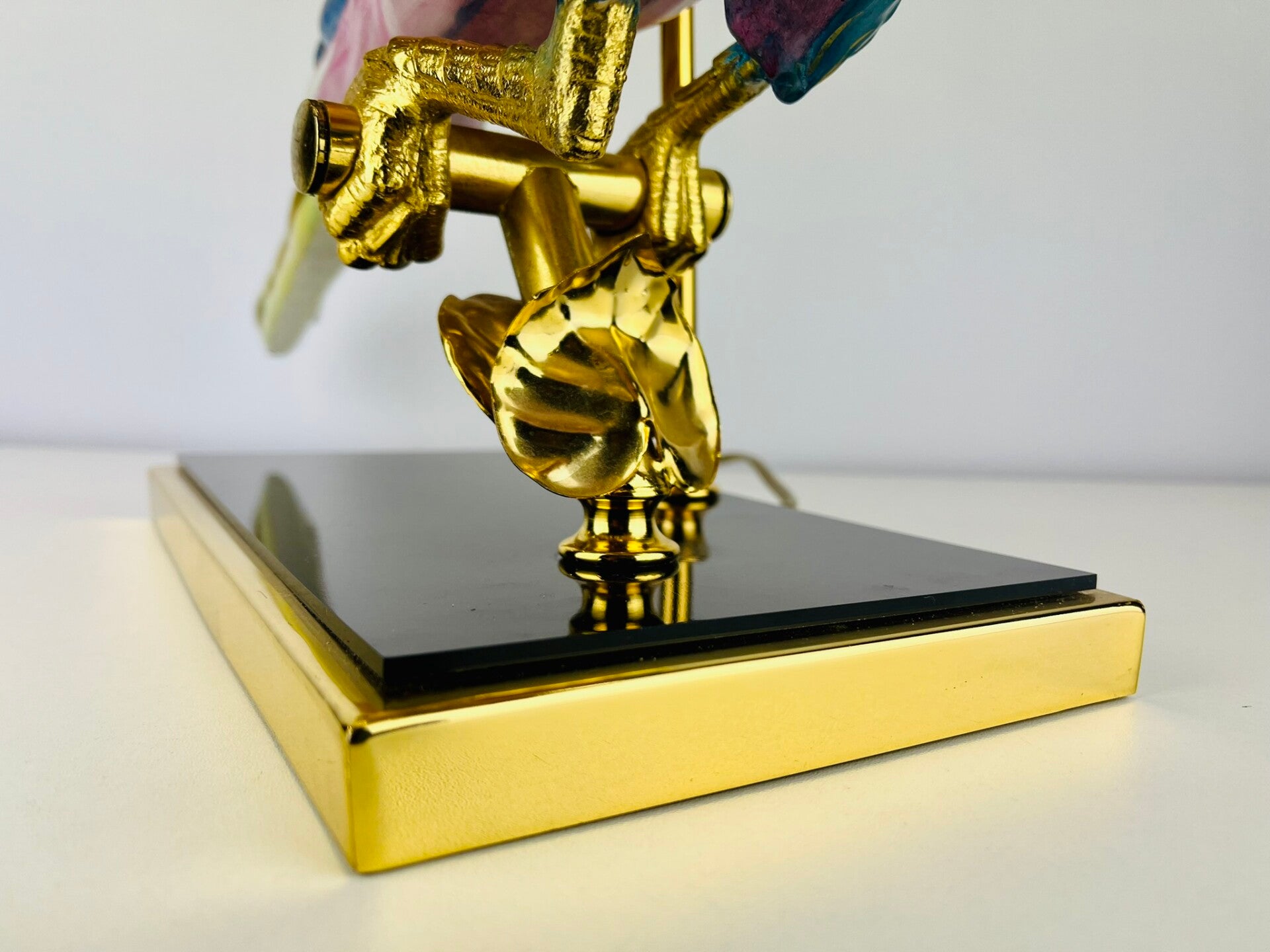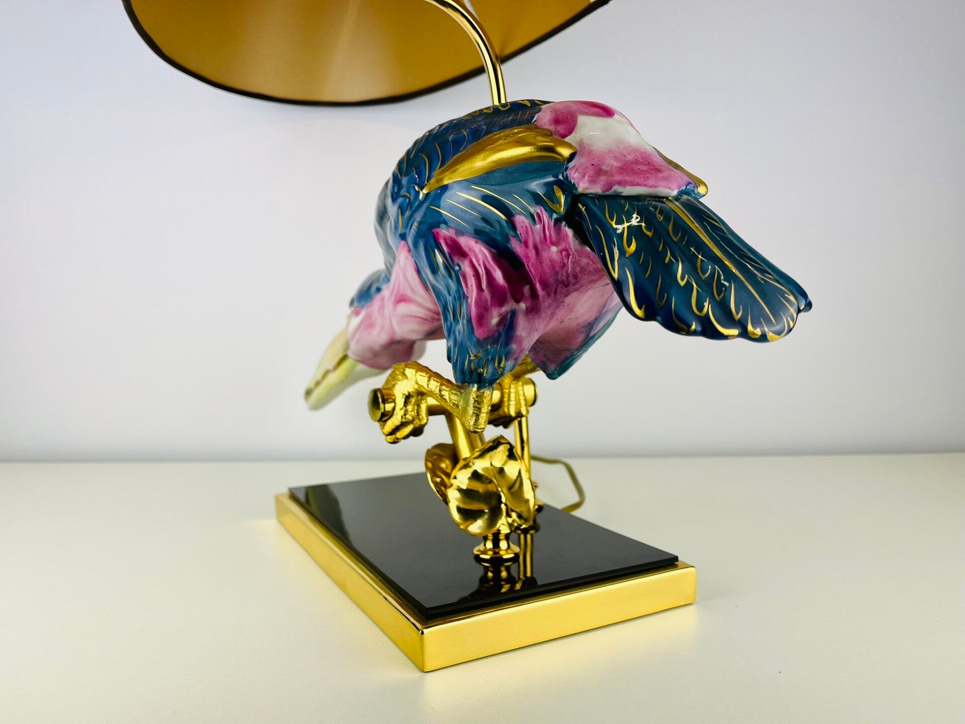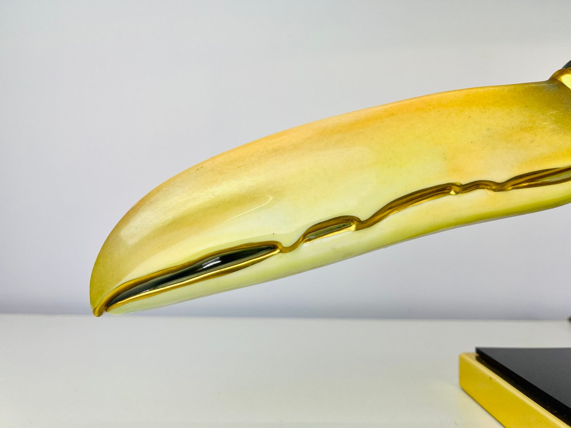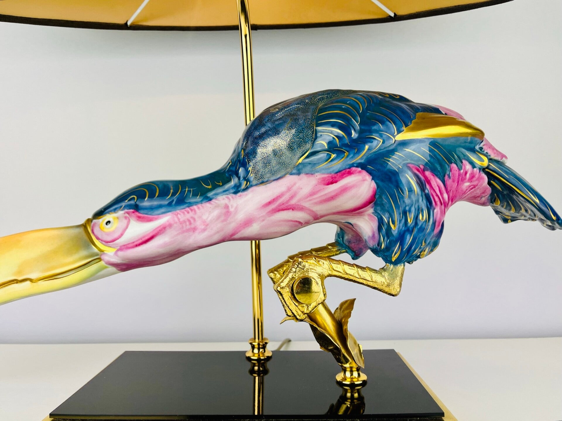 Large porcelain table lamp, glazed toucan in a combination of colorful shades with gold lacquer.