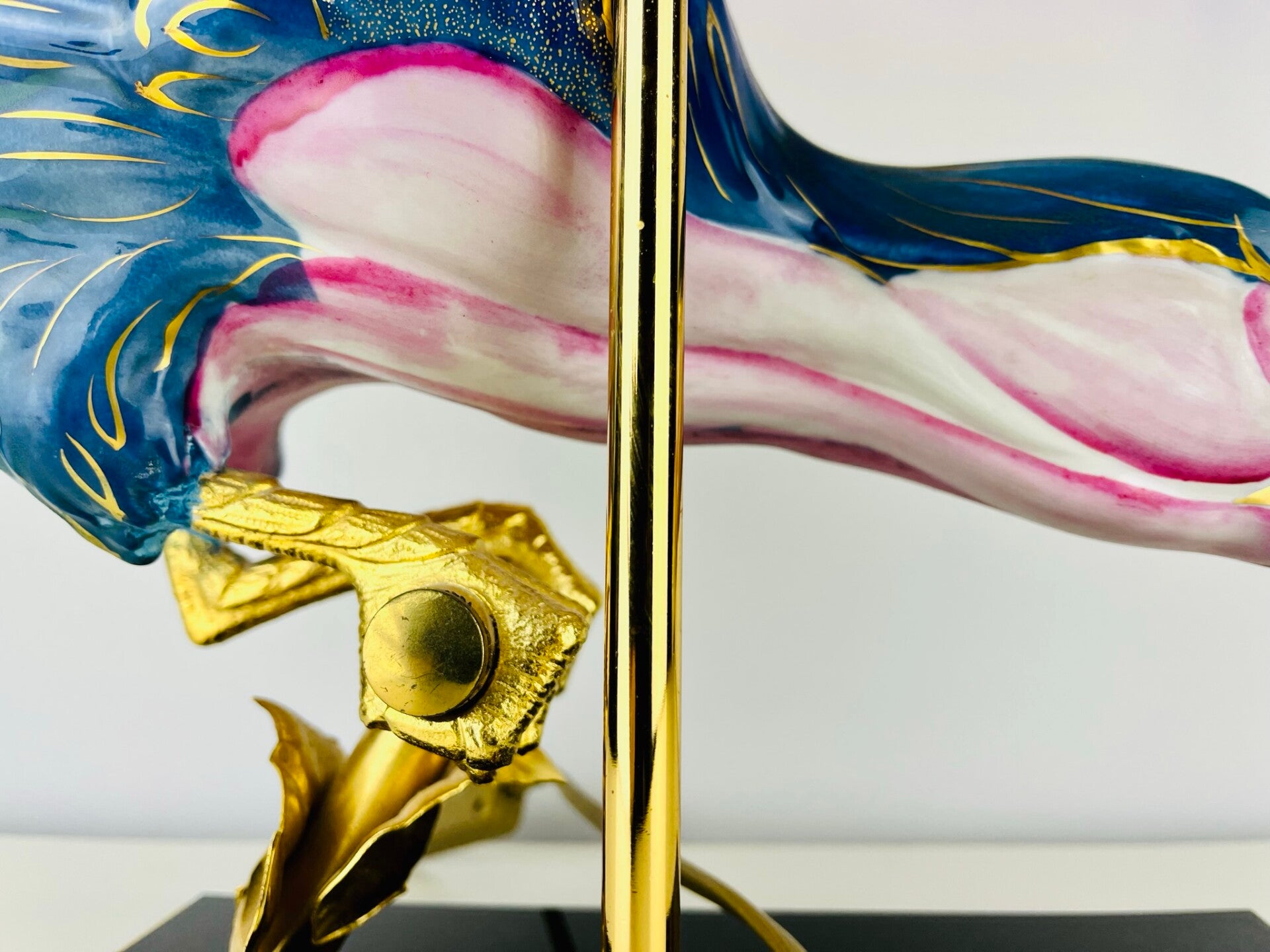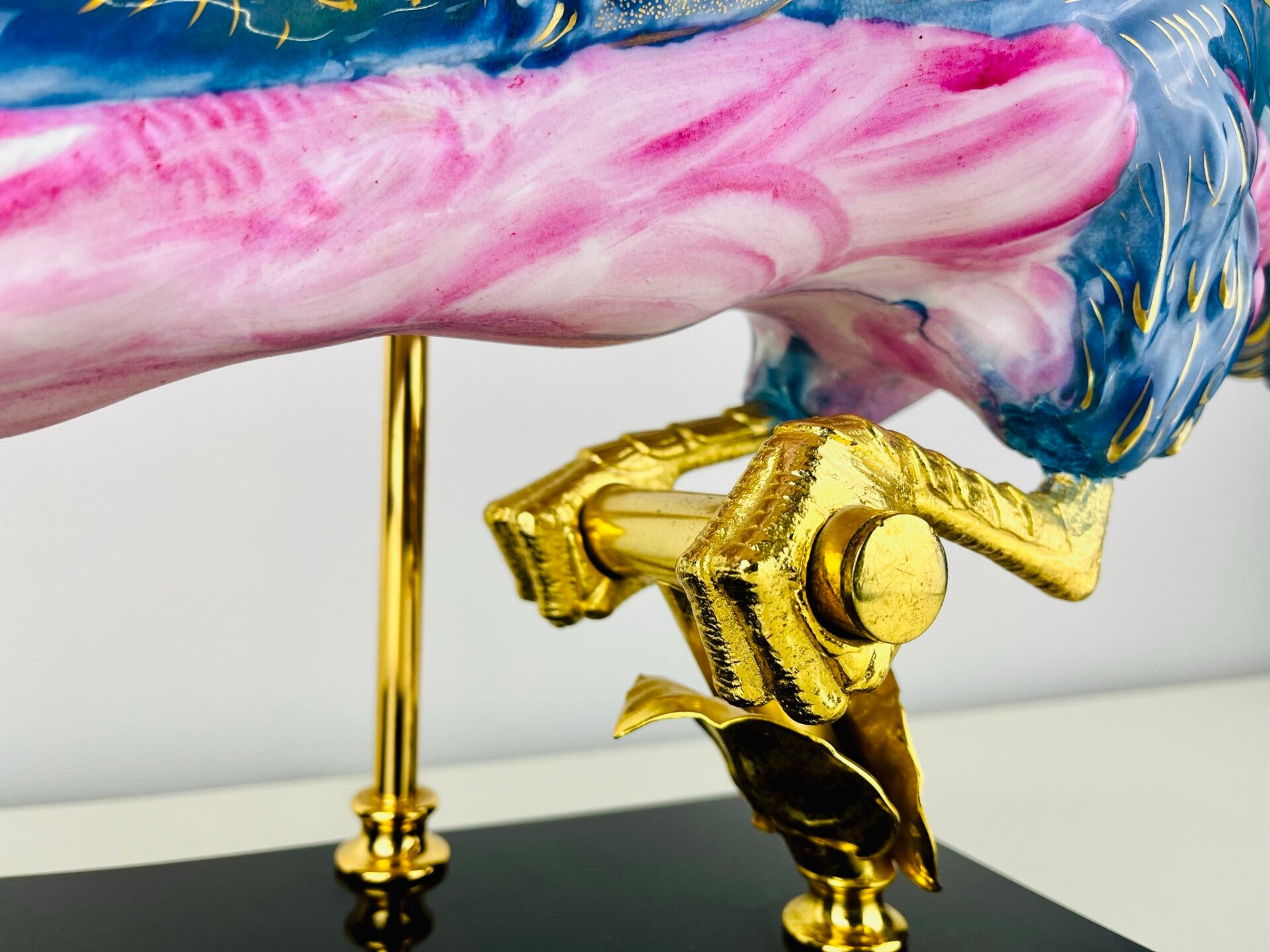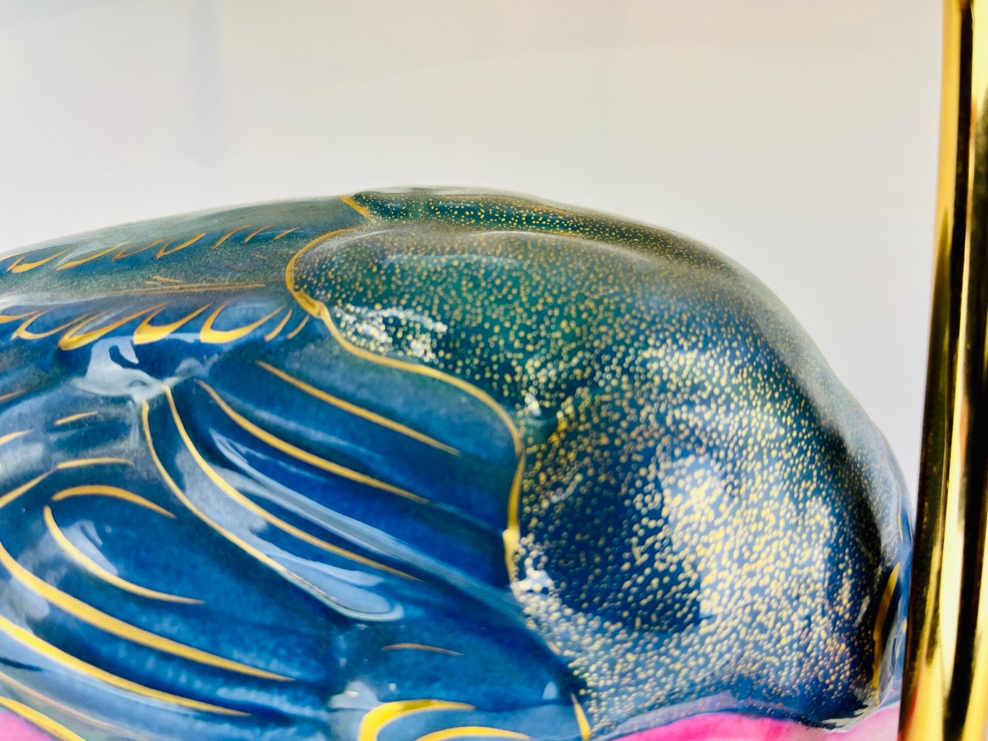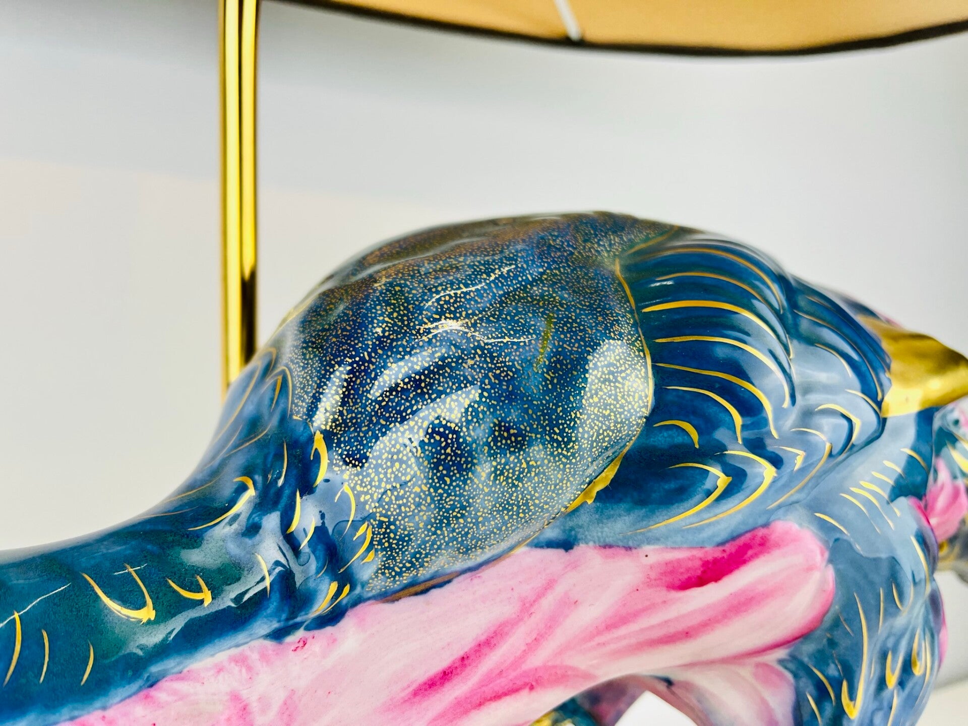 Large porcelain table lamp, glazed toucan in a combination of colorful shades with gold lacquer.