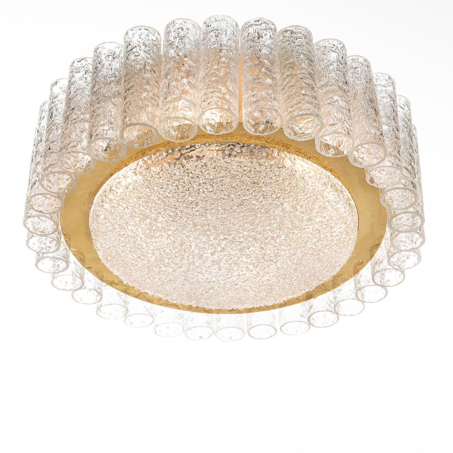 Beautiful ceiling lamp from the 1960s produced by the German Doria Leuchten. The lamp carries 32 glass tubes and has an ice effect. The glass tubes are attached to a white metal frame, in the middle a disc of the same type of glass as the tubes, surrounded by a brass ring.