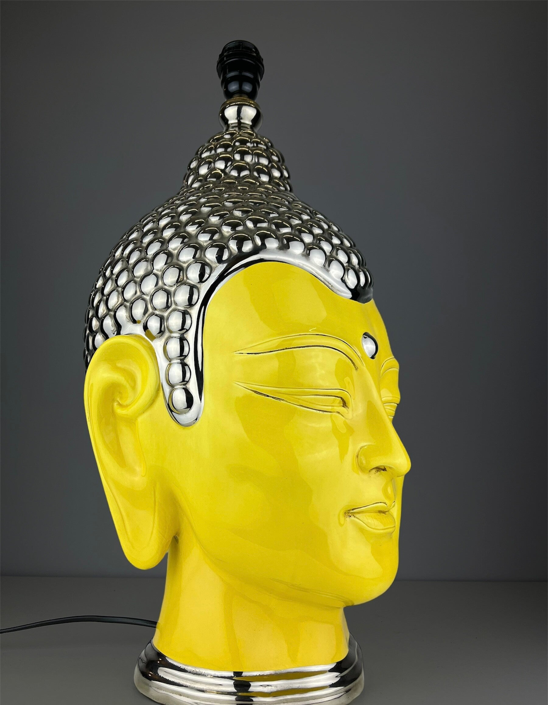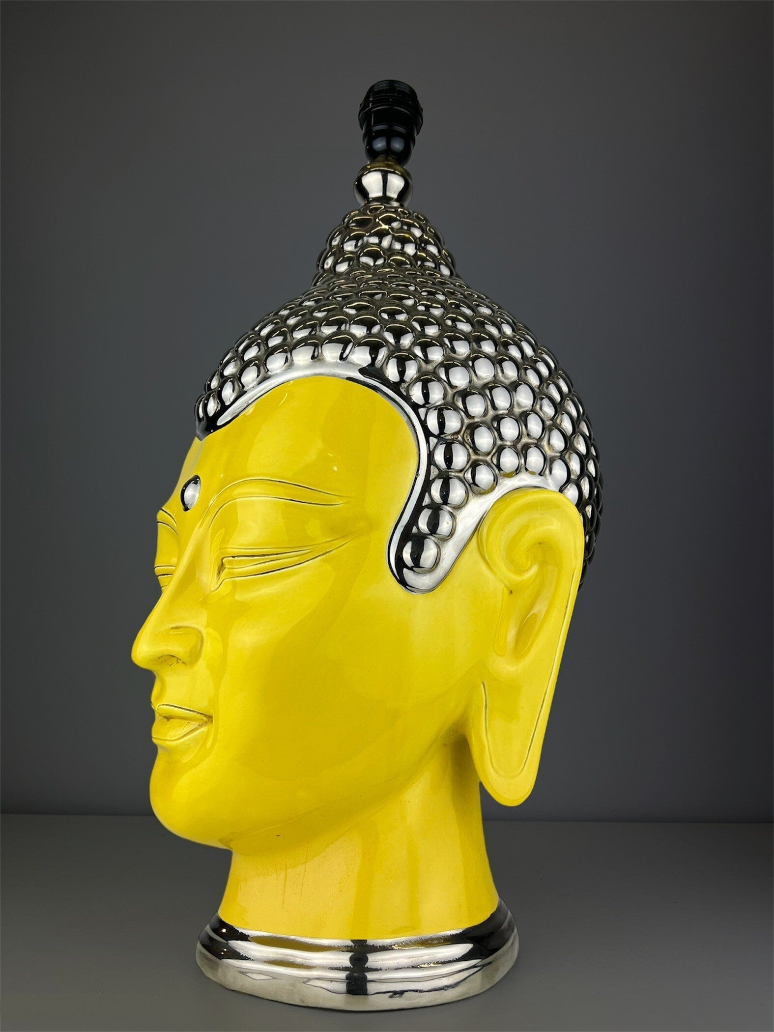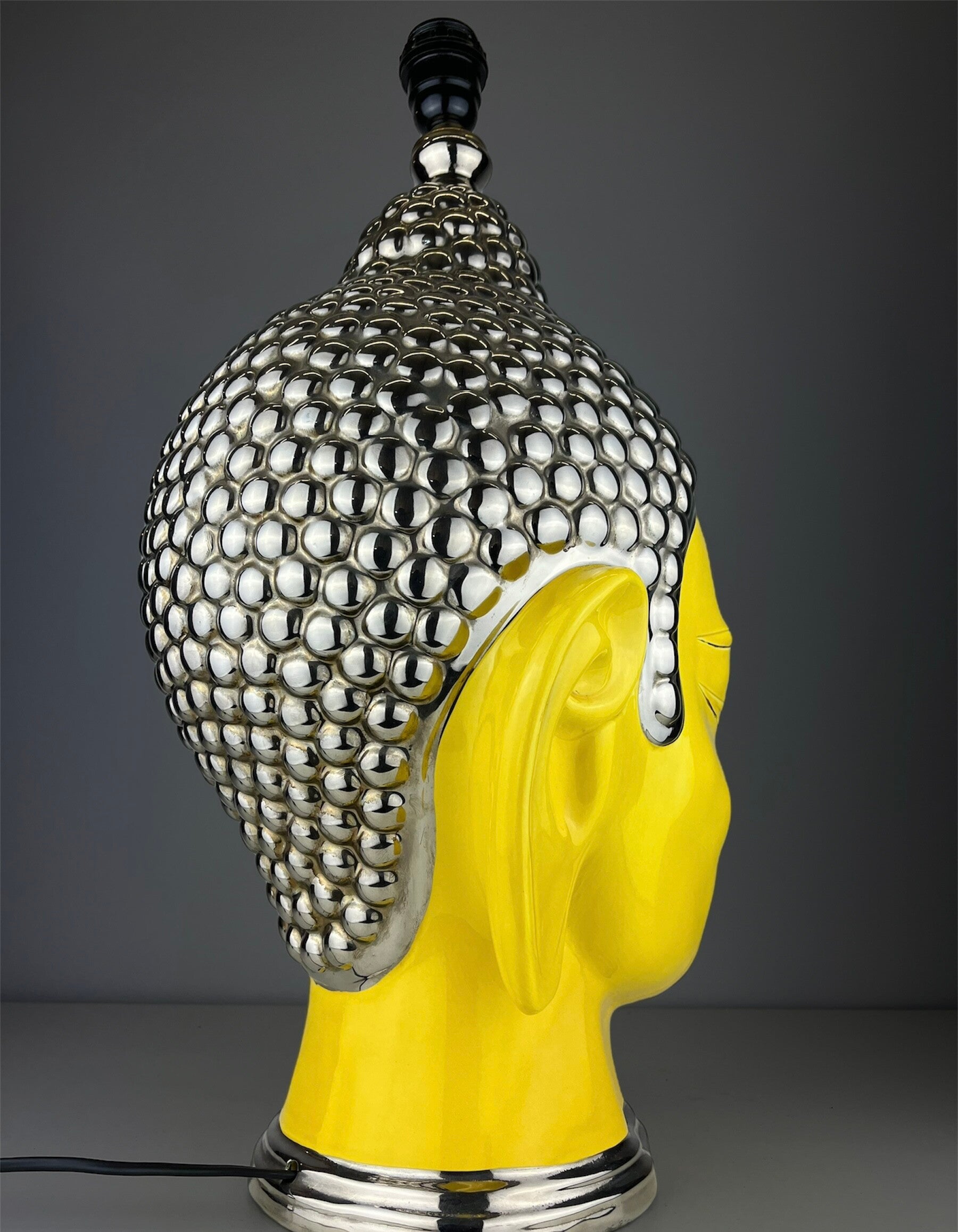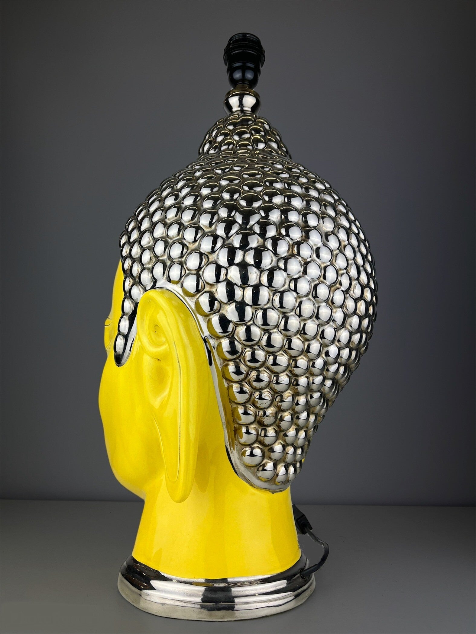 Very large Buddha table lamp made of ceramic, glazed in high shades, beautiful yellow color finished with a silver topping.