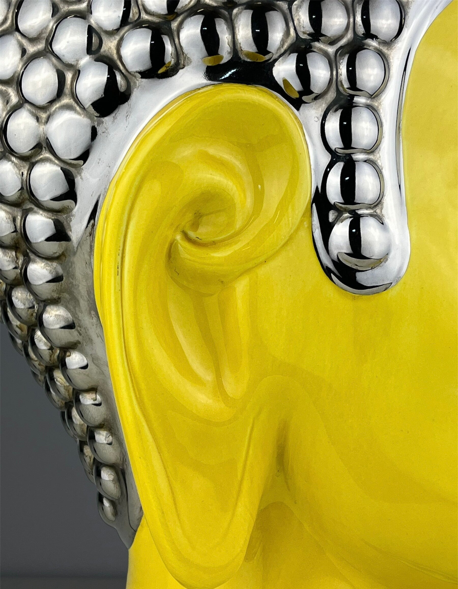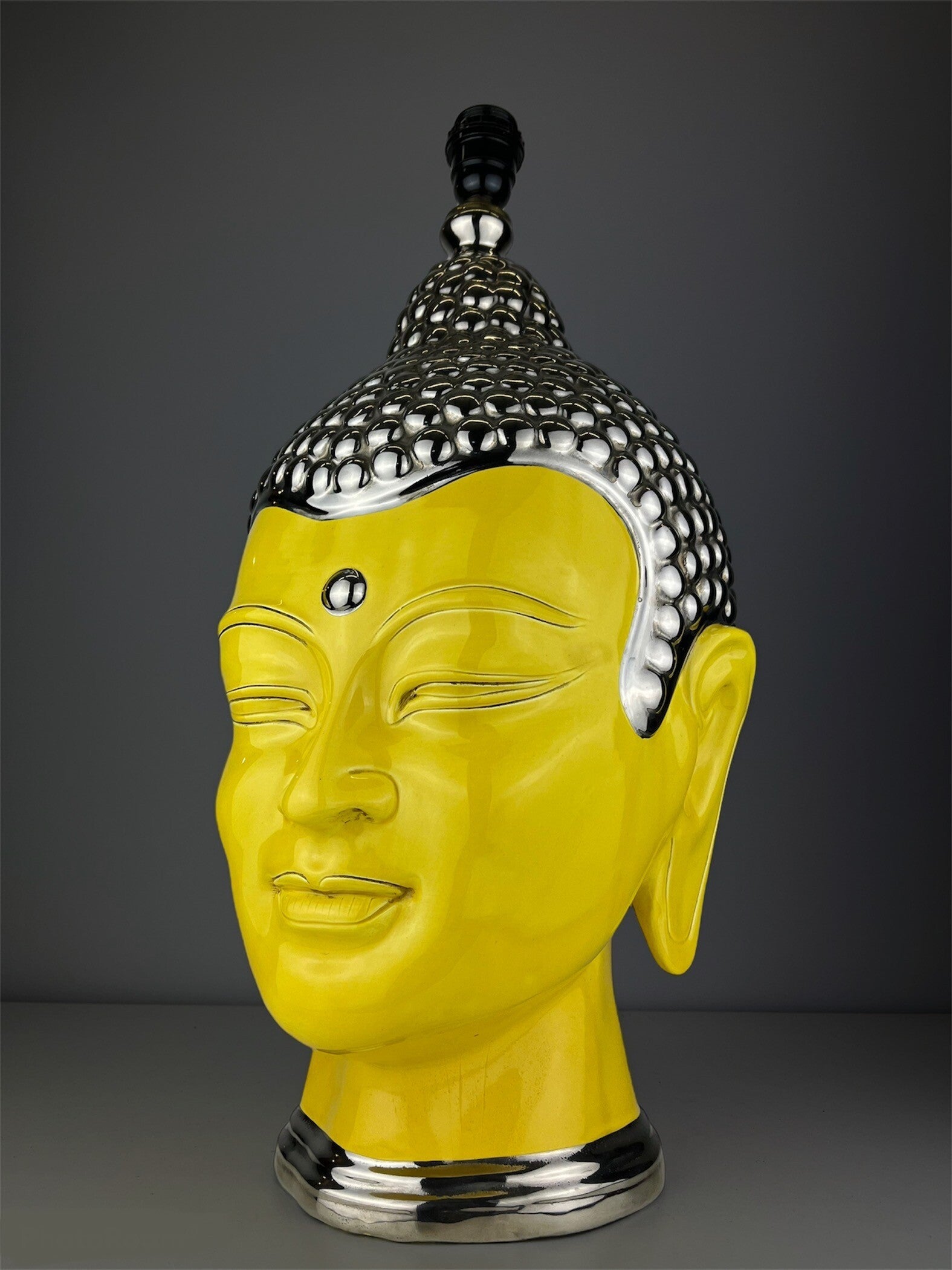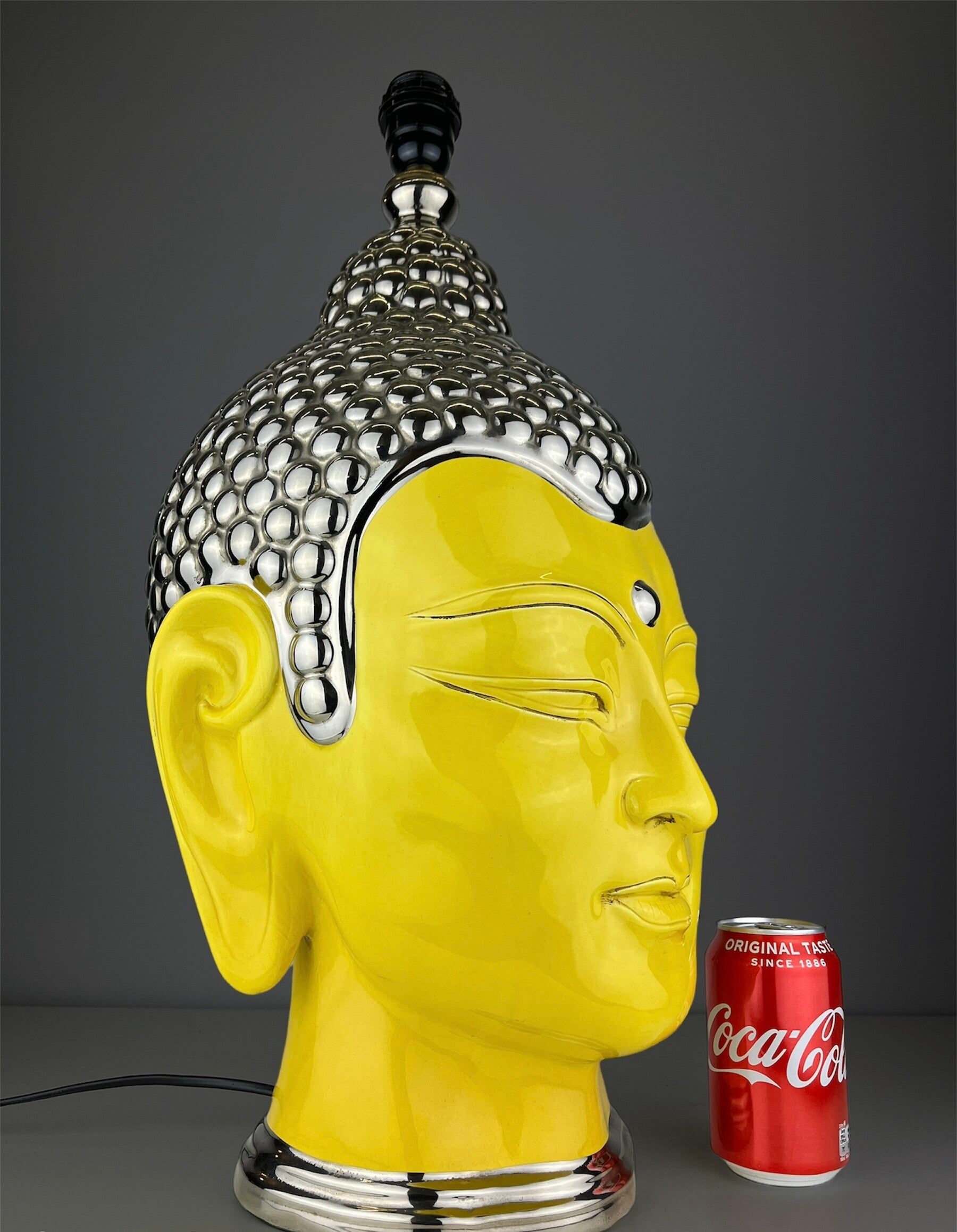 Very large Buddha table lamp made of ceramic, glazed in high shades, beautiful yellow color finished with a silver topping.