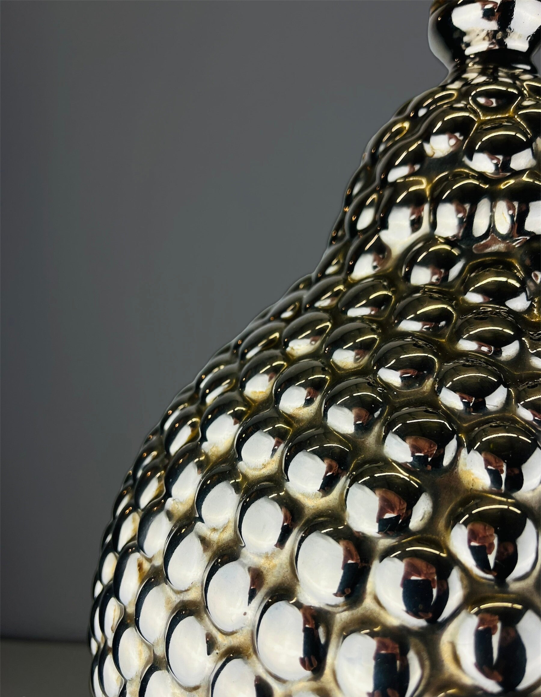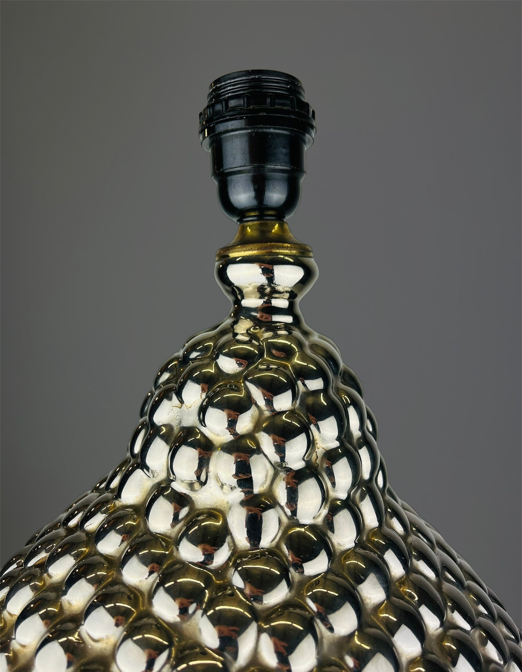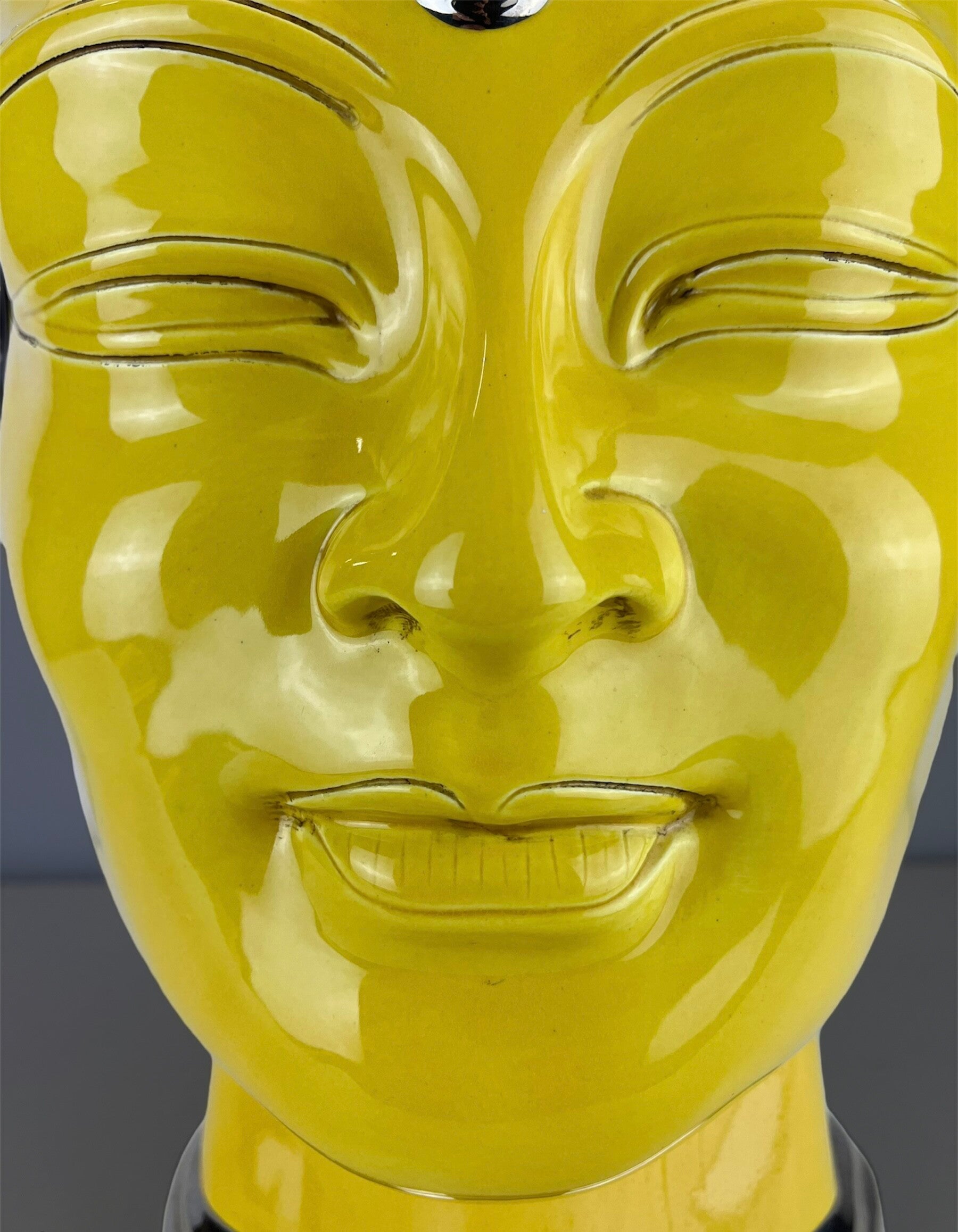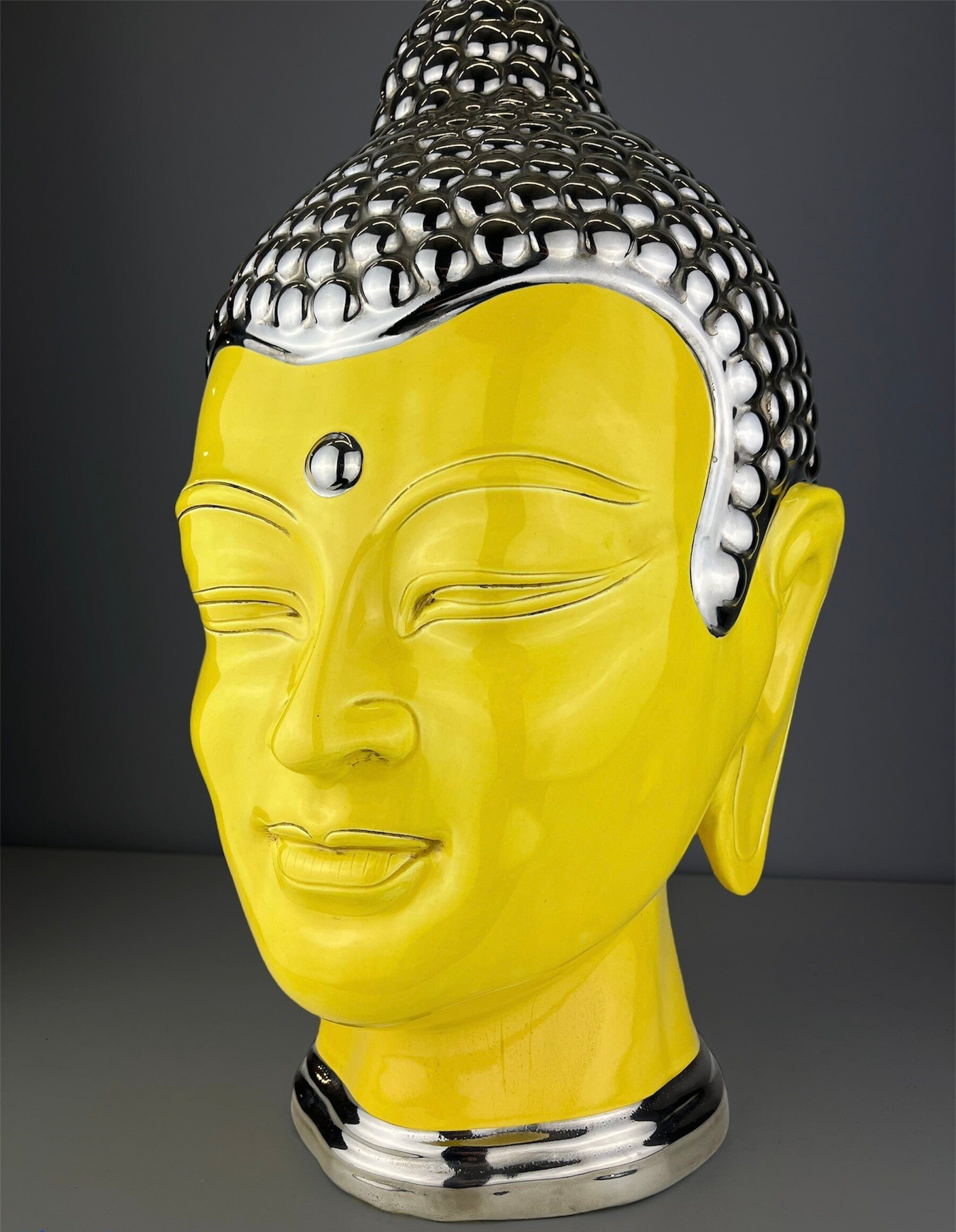 Very large Buddha table lamp made of ceramic, glazed in high shades, beautiful yellow color finished with a silver topping.