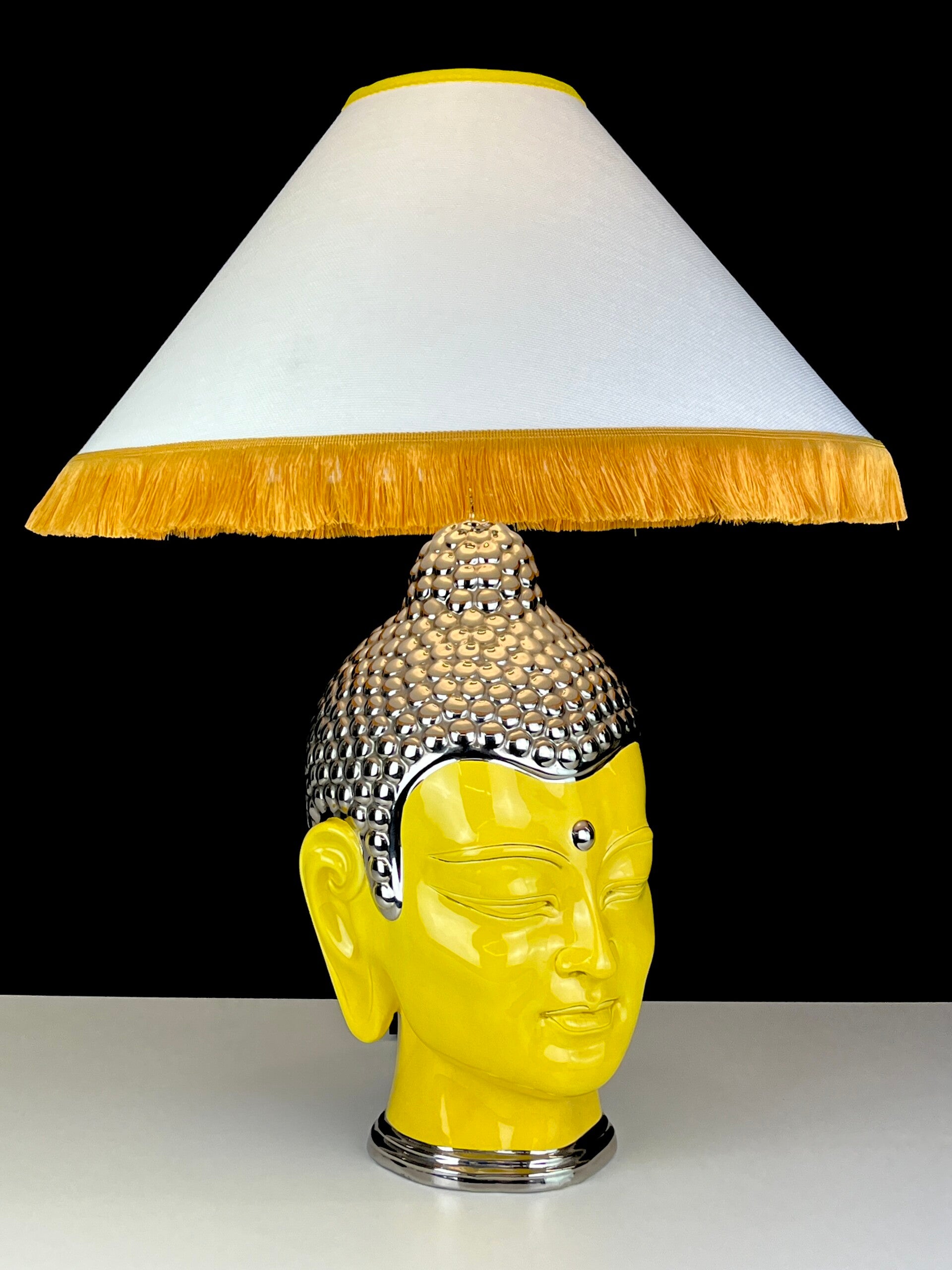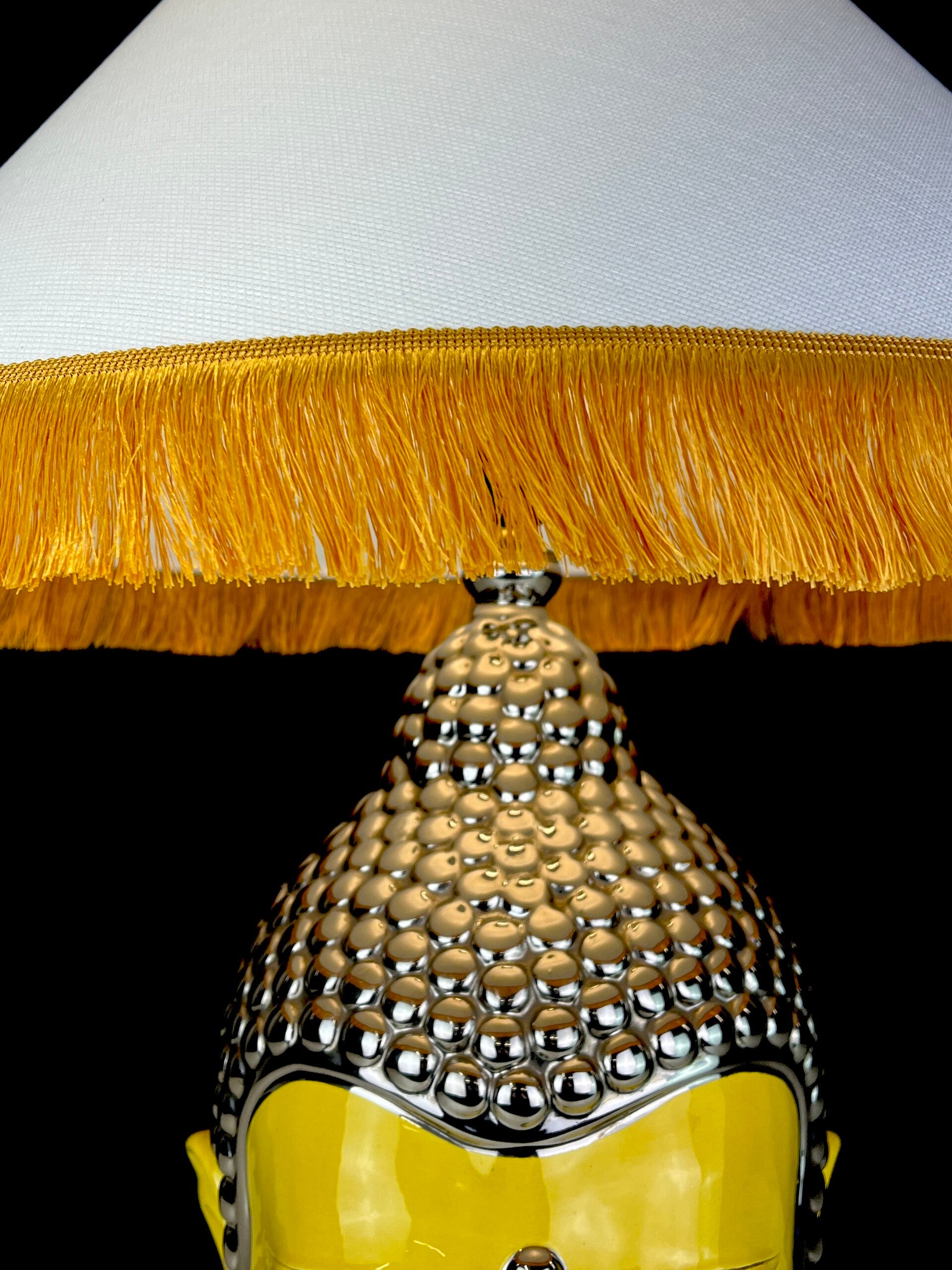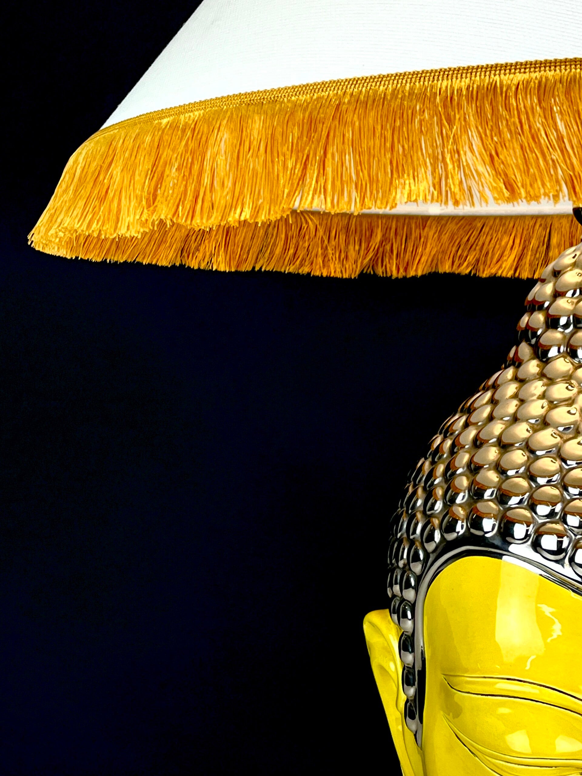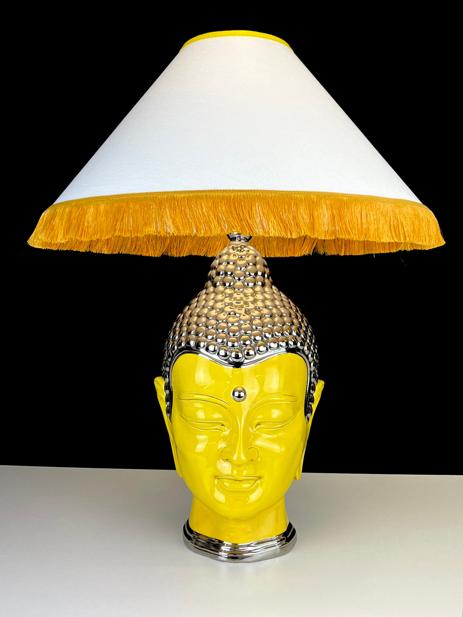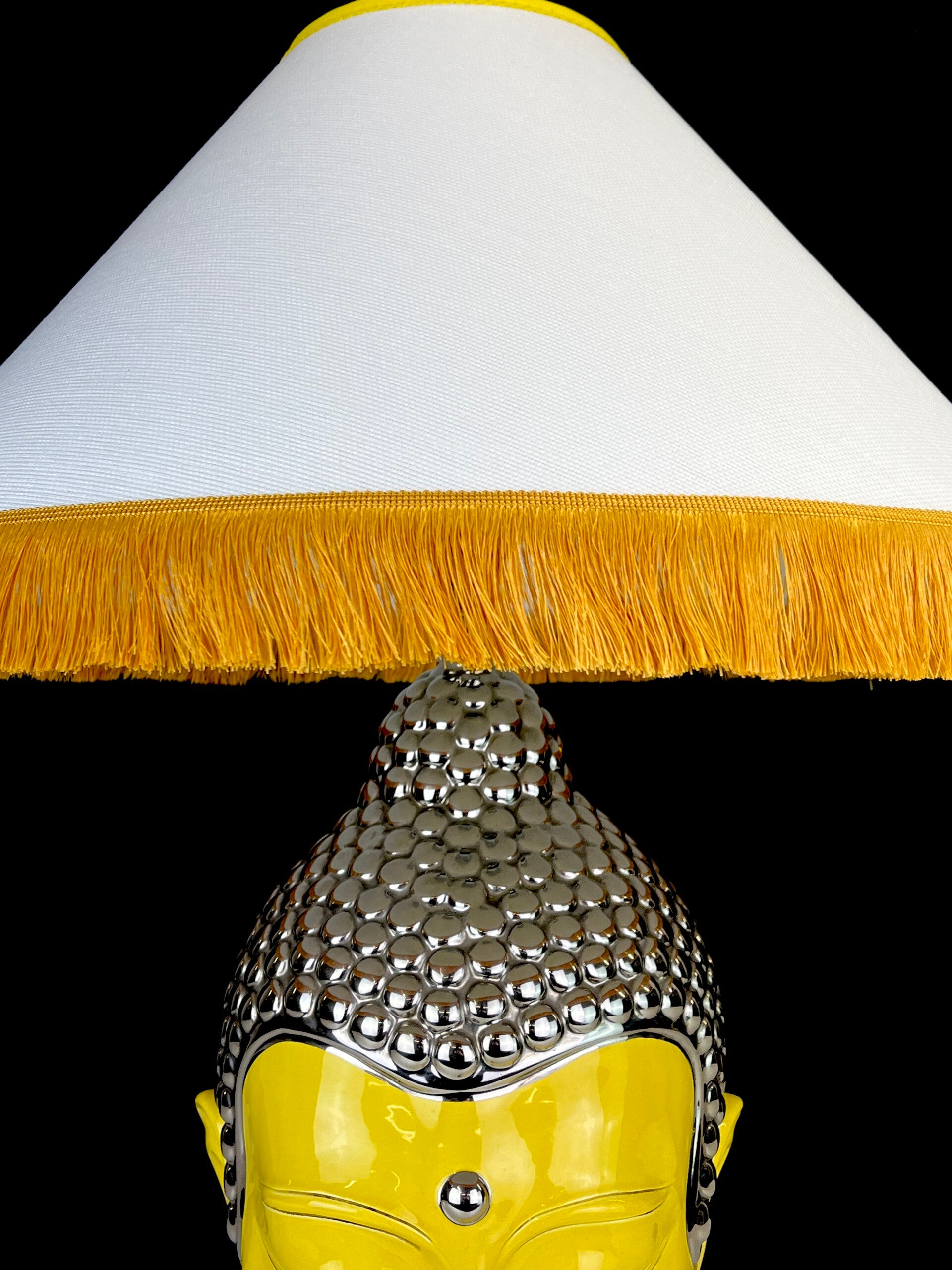 Very large Buddha table lamp made of ceramic, glazed in high shades, beautiful yellow color finished with a silver topping.