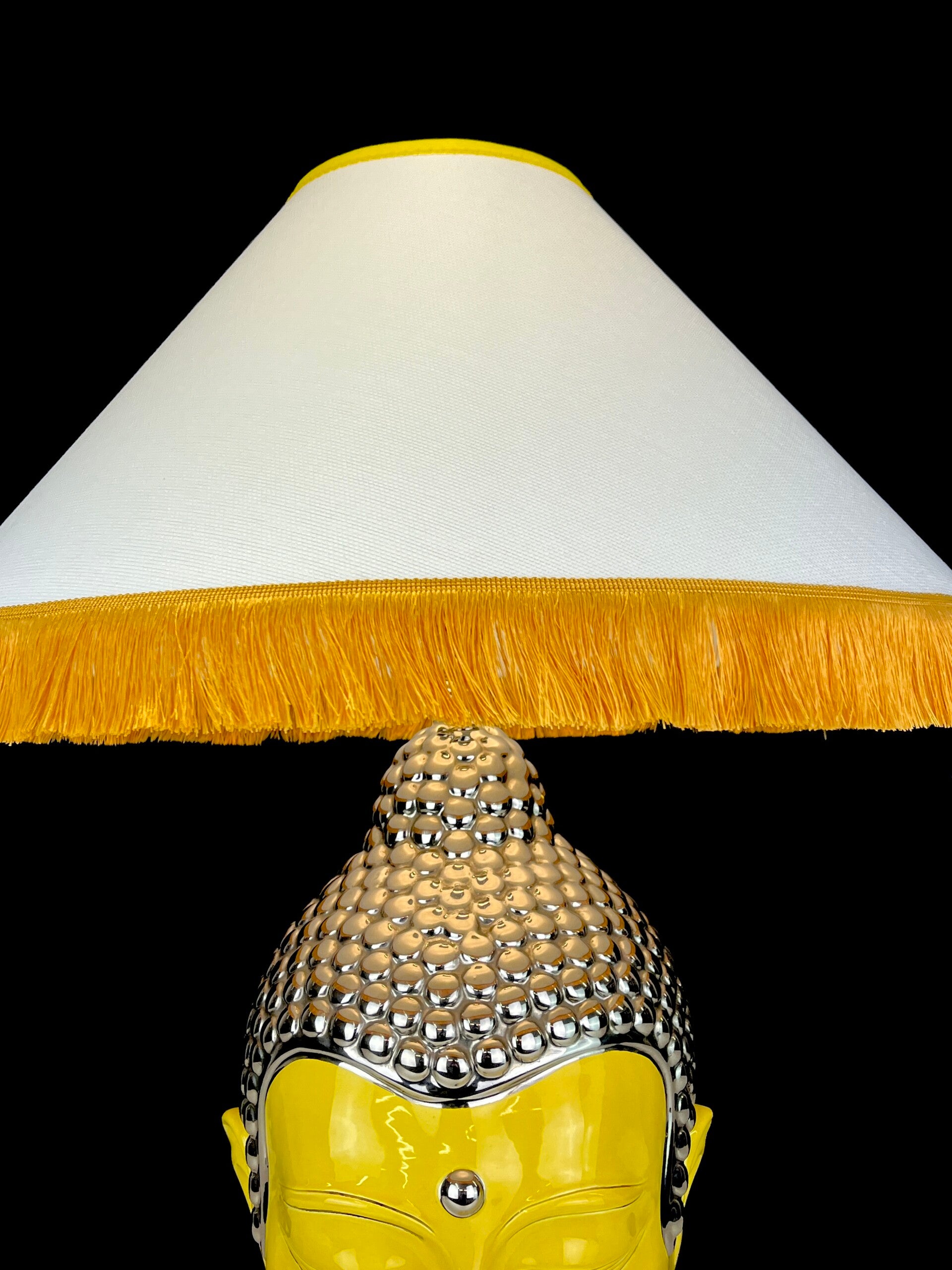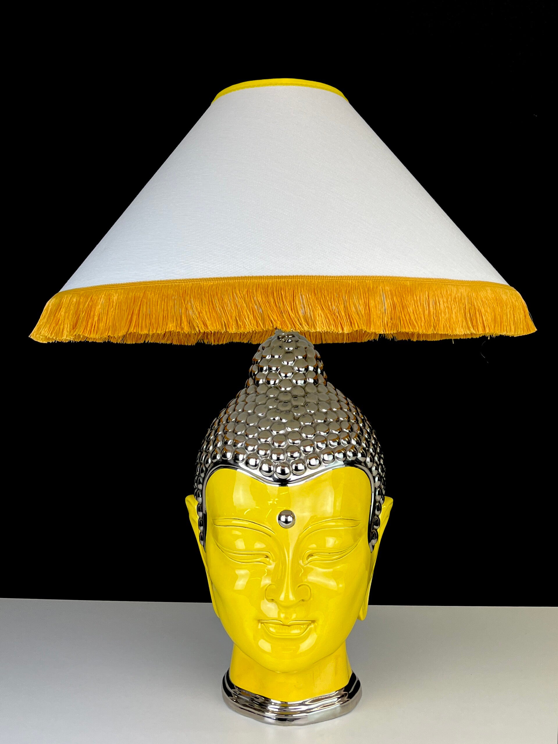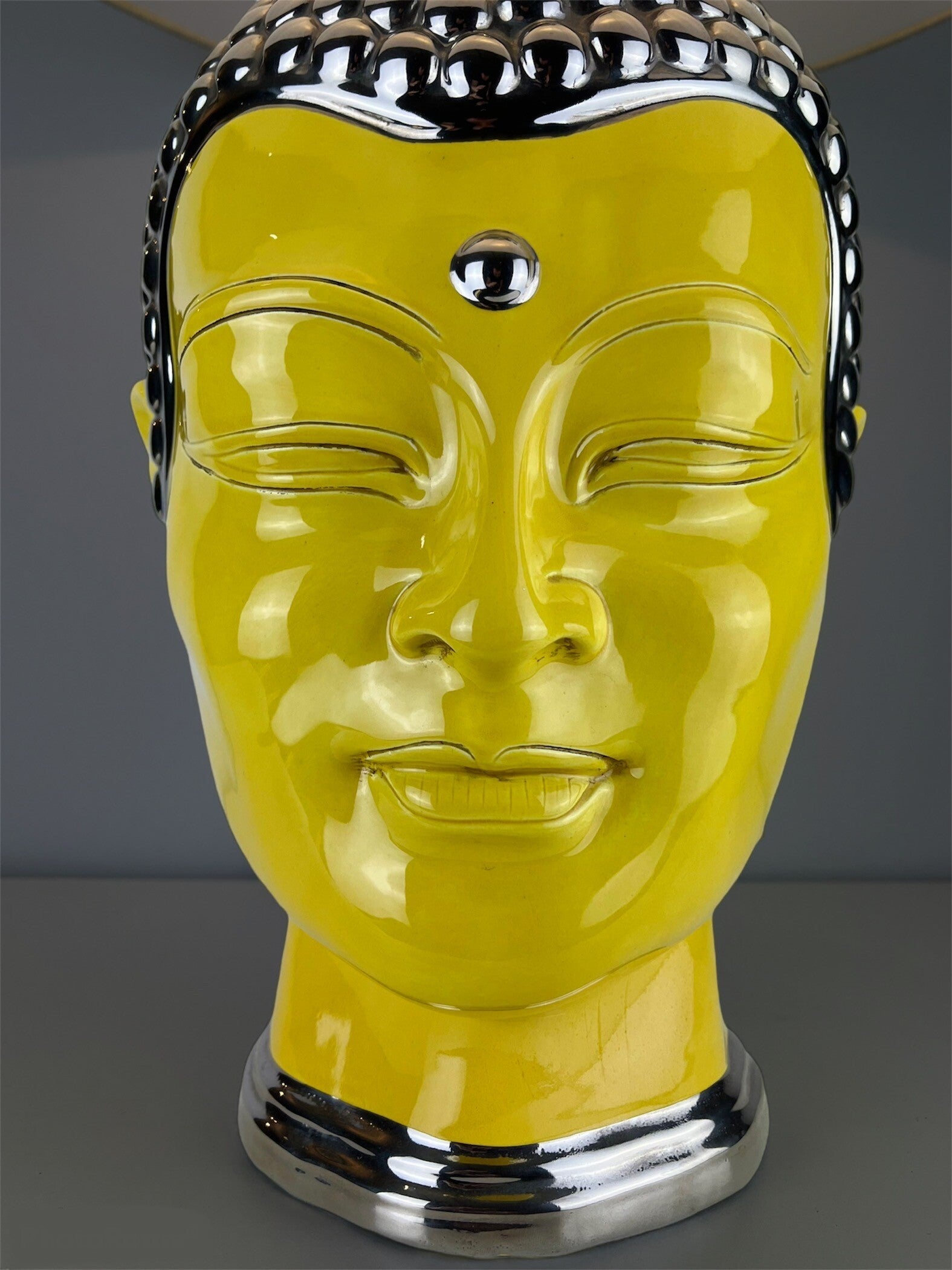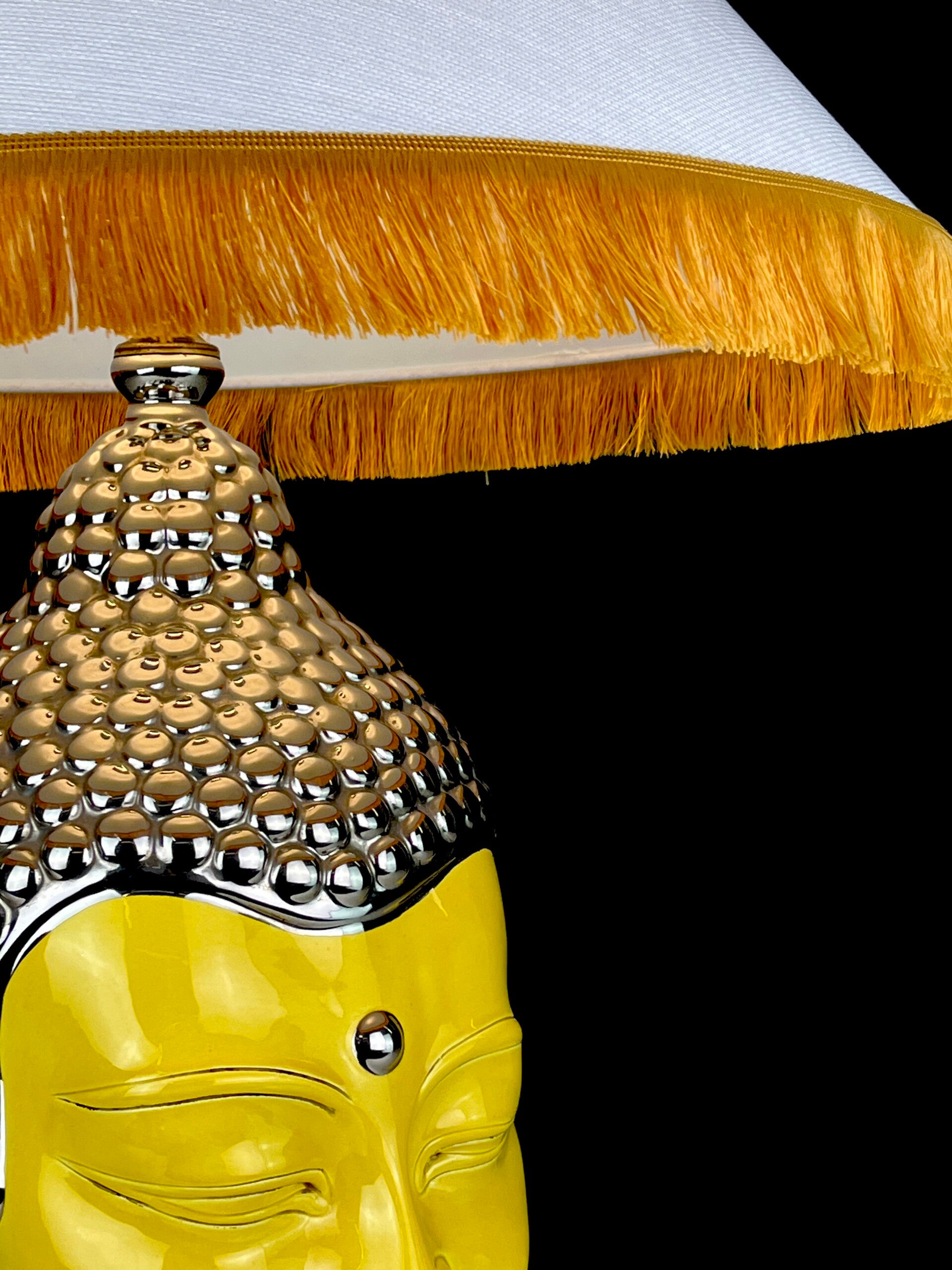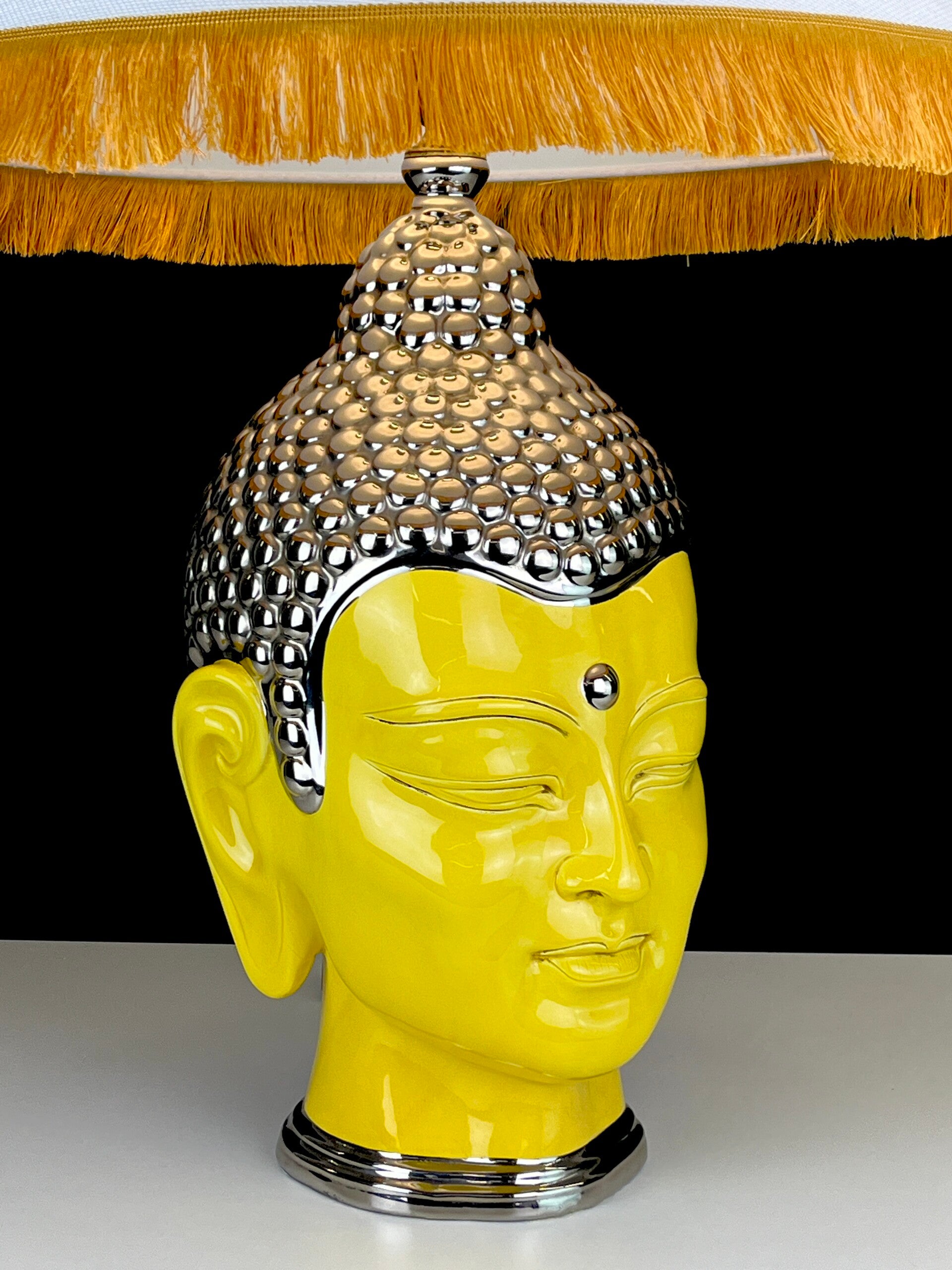 Very large Buddha table lamp made of ceramic, glazed in high shades, beautiful yellow color finished with a silver topping.