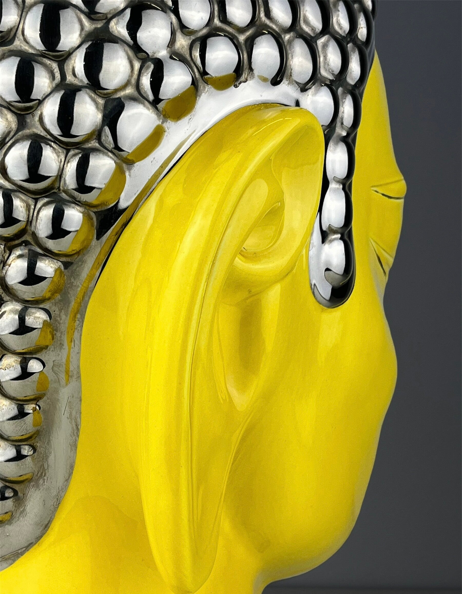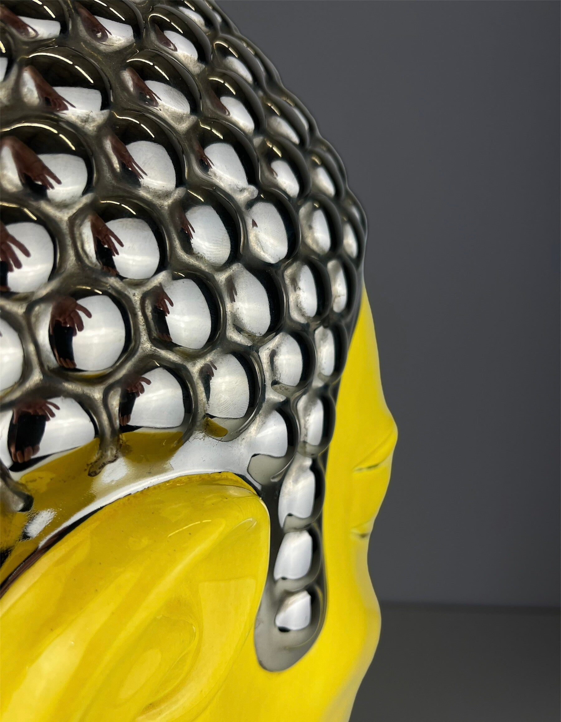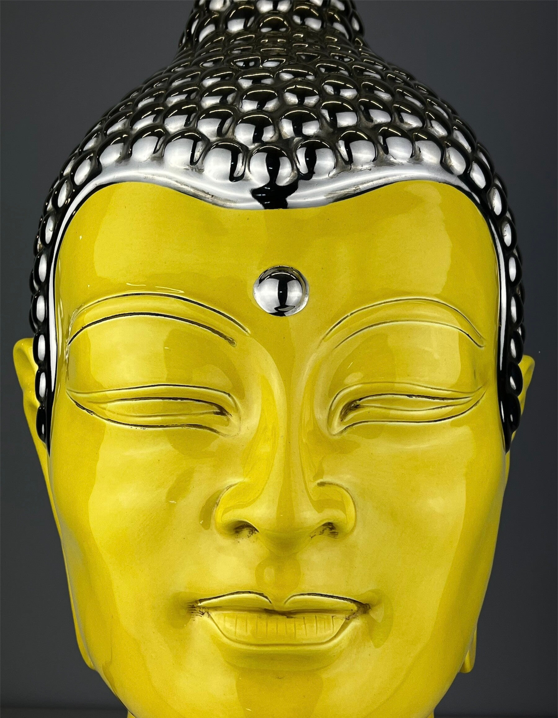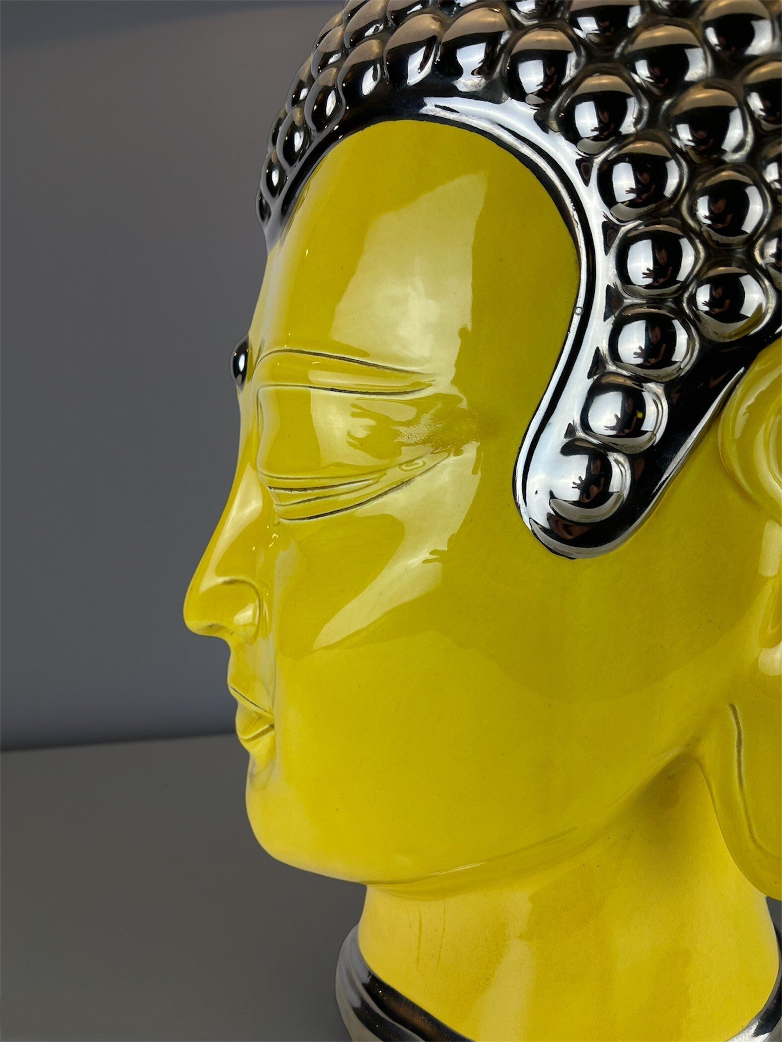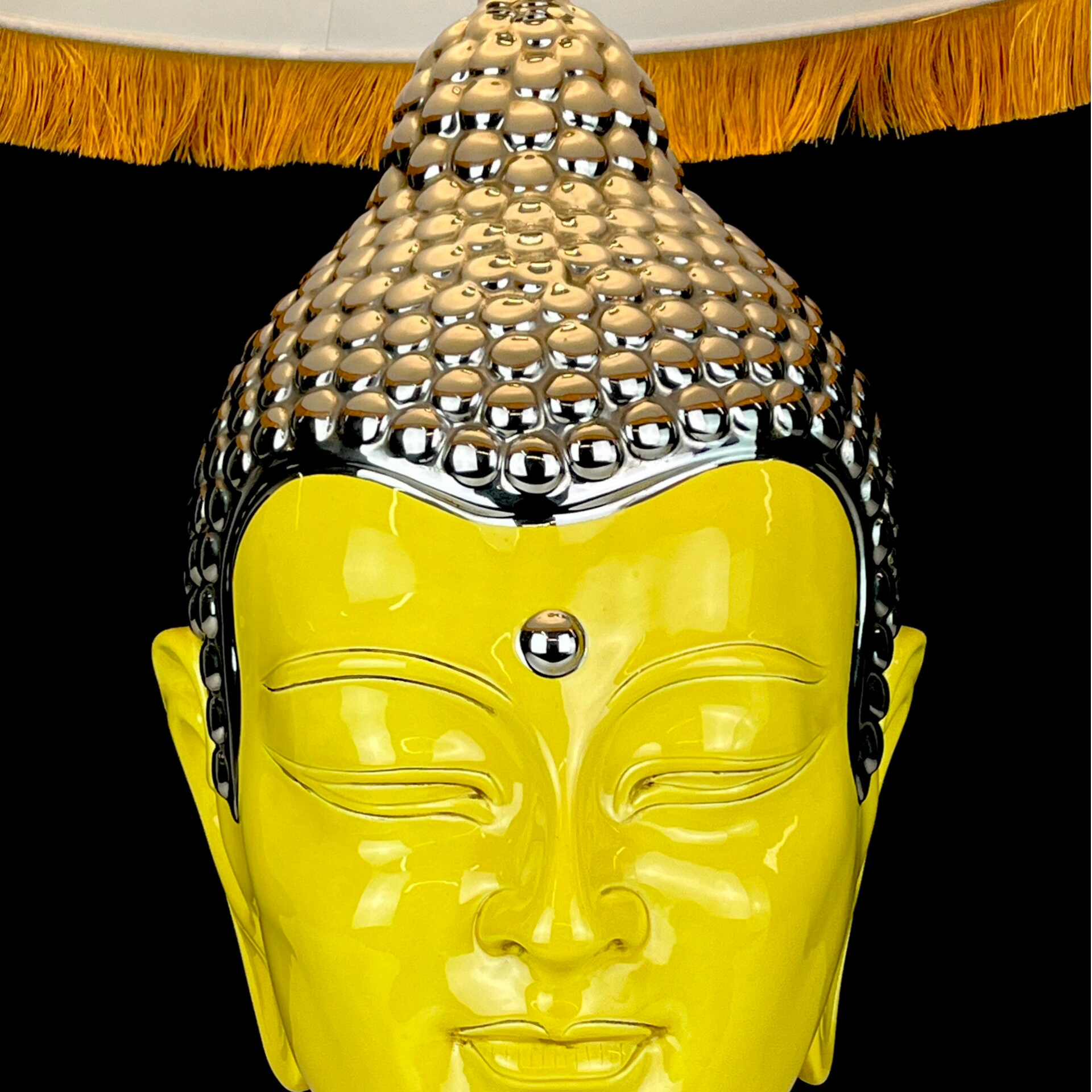 Very large Buddha table lamp made of ceramic, glazed in high shades, beautiful yellow color finished with a silver topping.