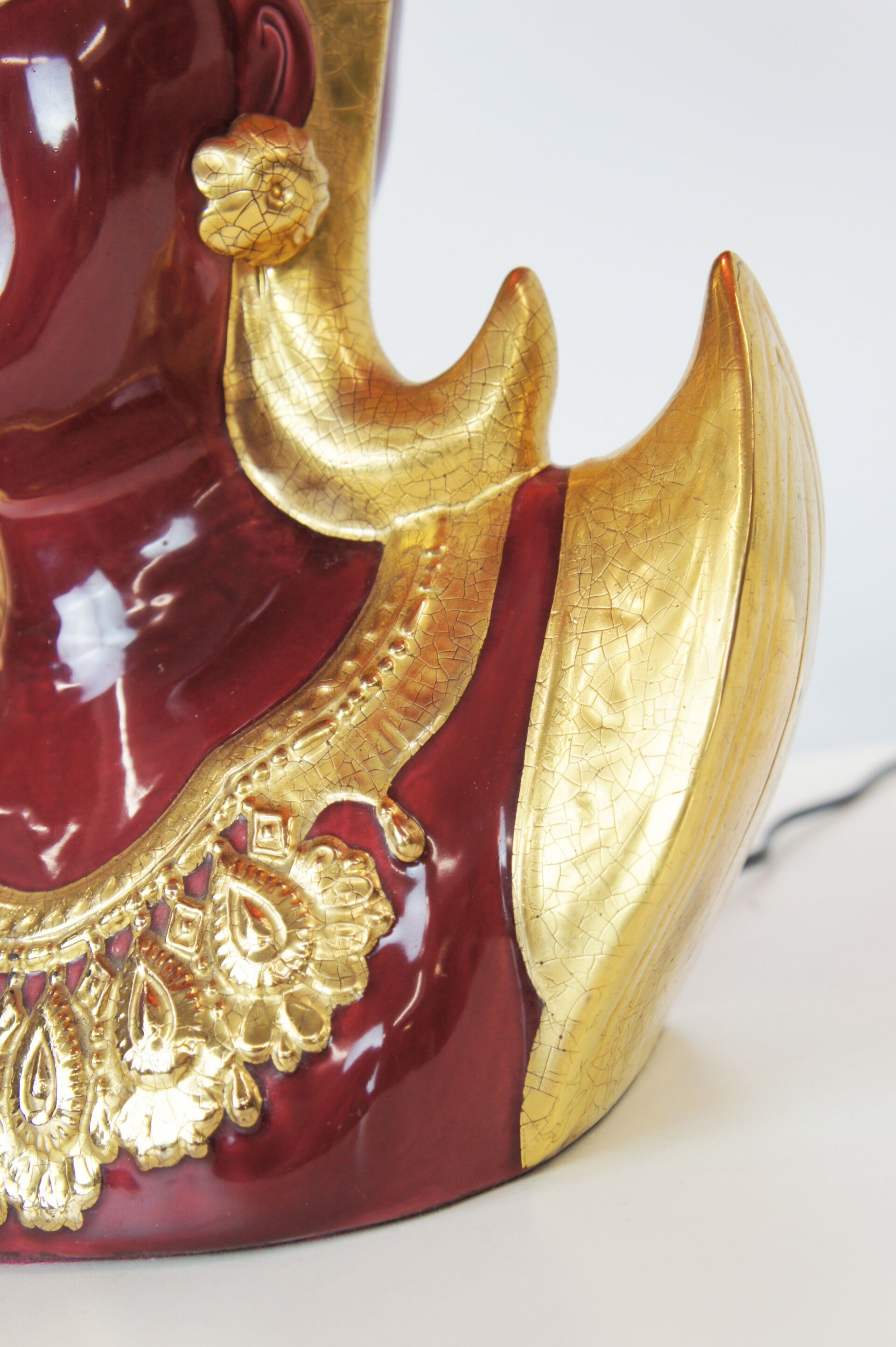 Italian table lamp made of red lacquered ceramics, the details of the Thep Phanom (Temple Guardian) are finished with gold lacquer and have a coarse crackle.