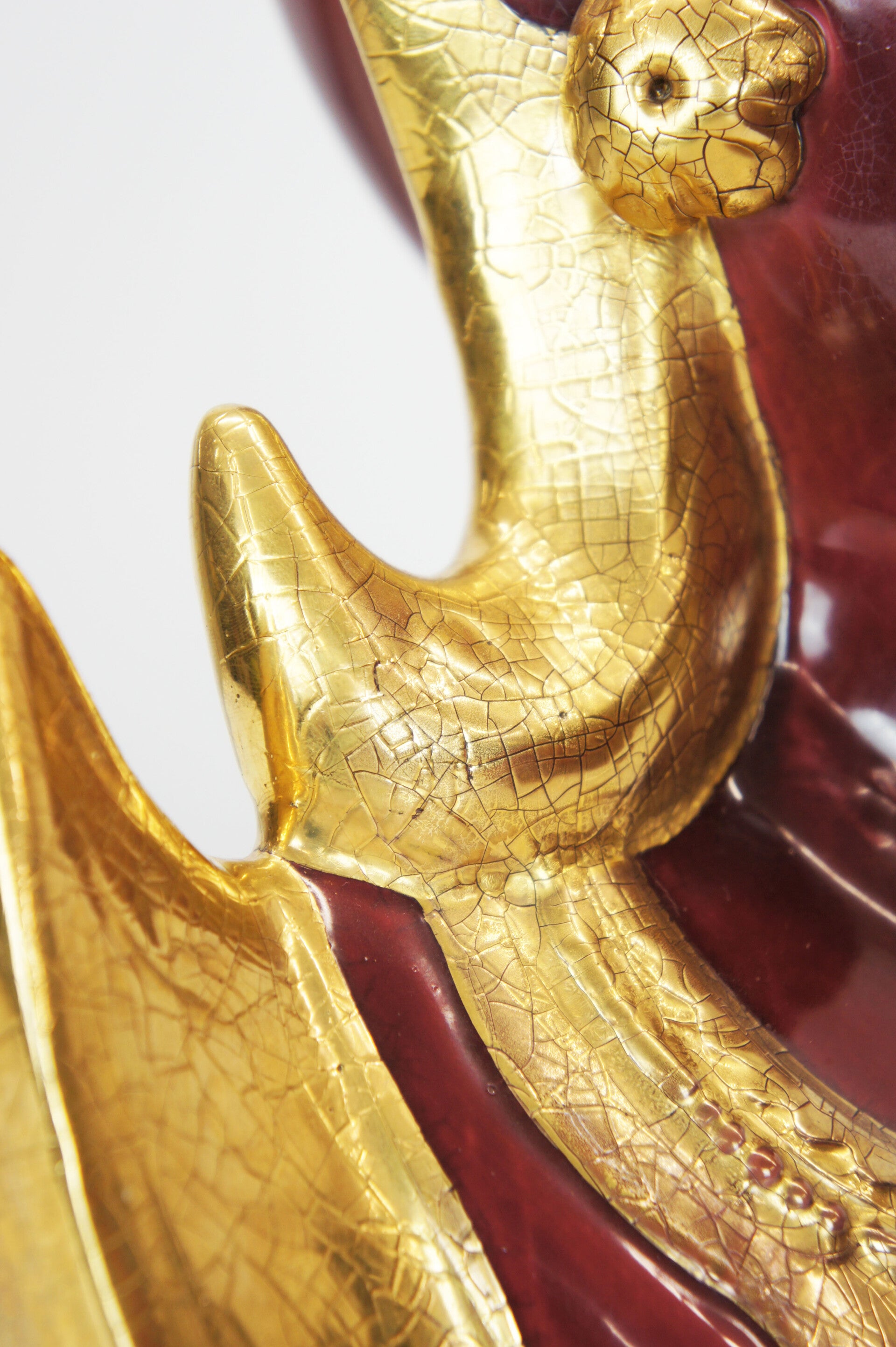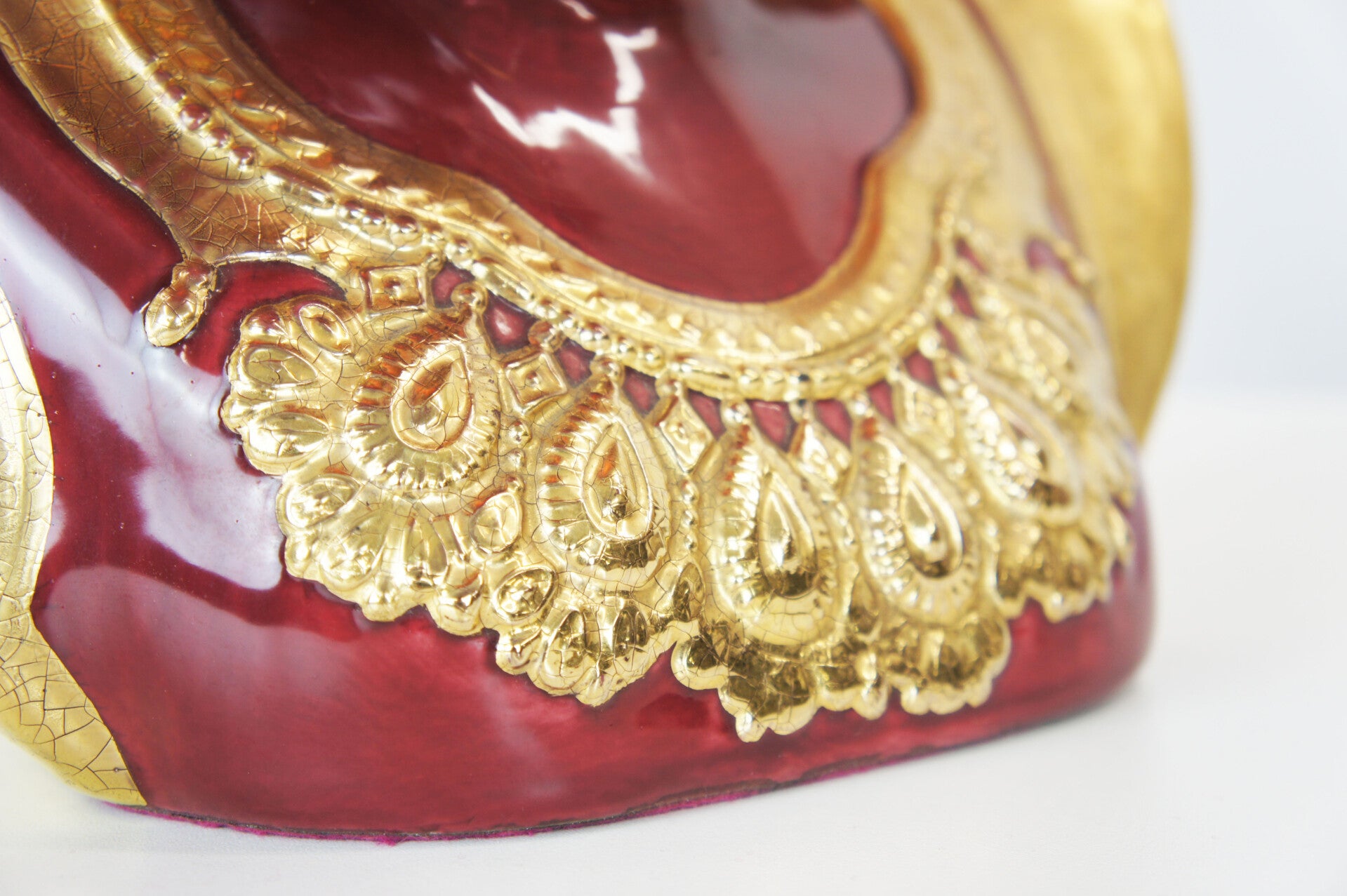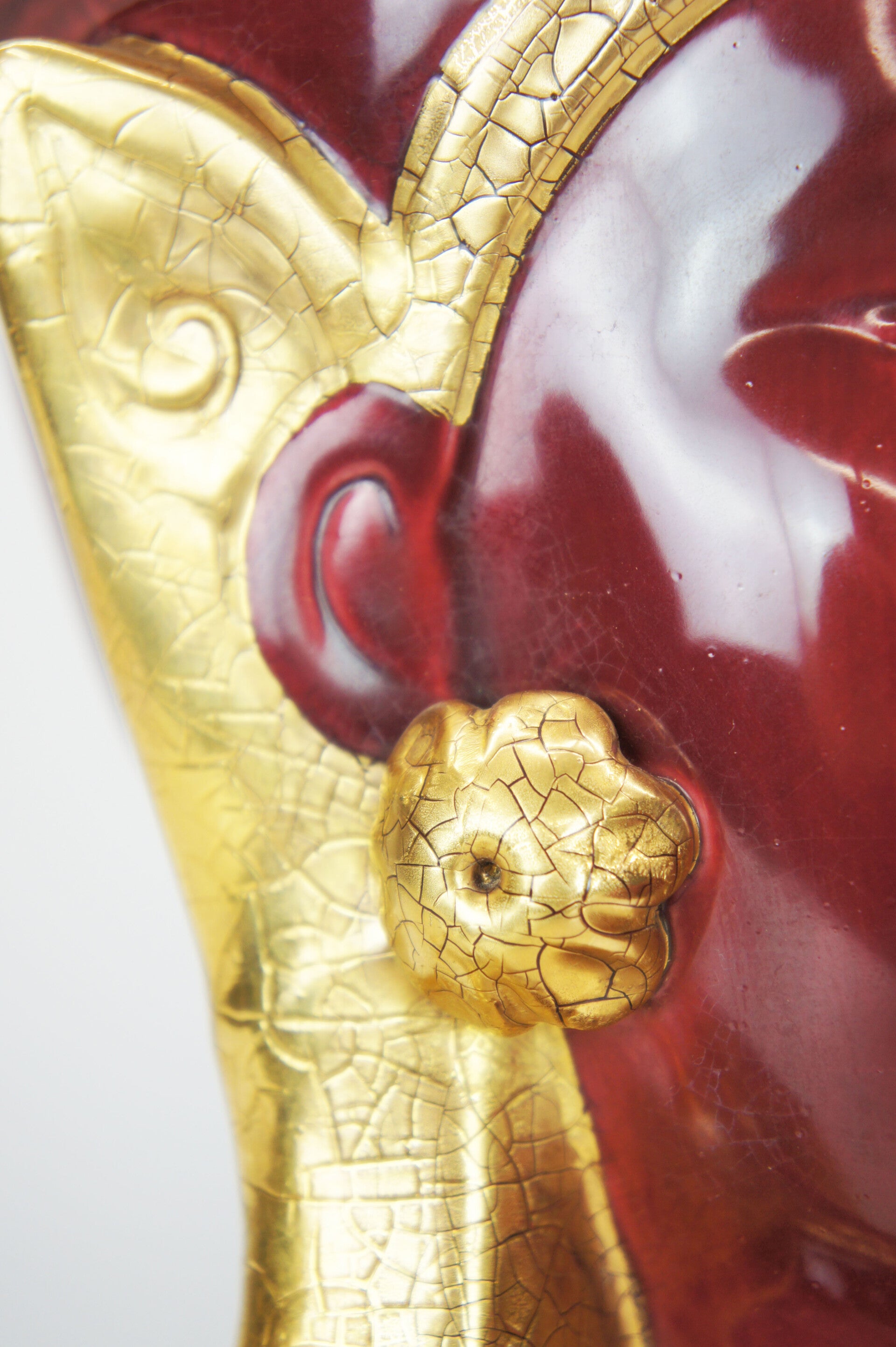 This exceptional piece is of Italian origin from the 1970s. A dark deep red glaze was applied, finished with a gold lacquer. A very detailed piece.