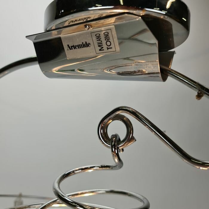 Spiral pendant lamp in chromed steel, model 'Melissa' by Toni Cordero for Artemide. 1980s/1990sThere are various variants of this Melissa lamp, this variand is richly filled with glass supplements.
