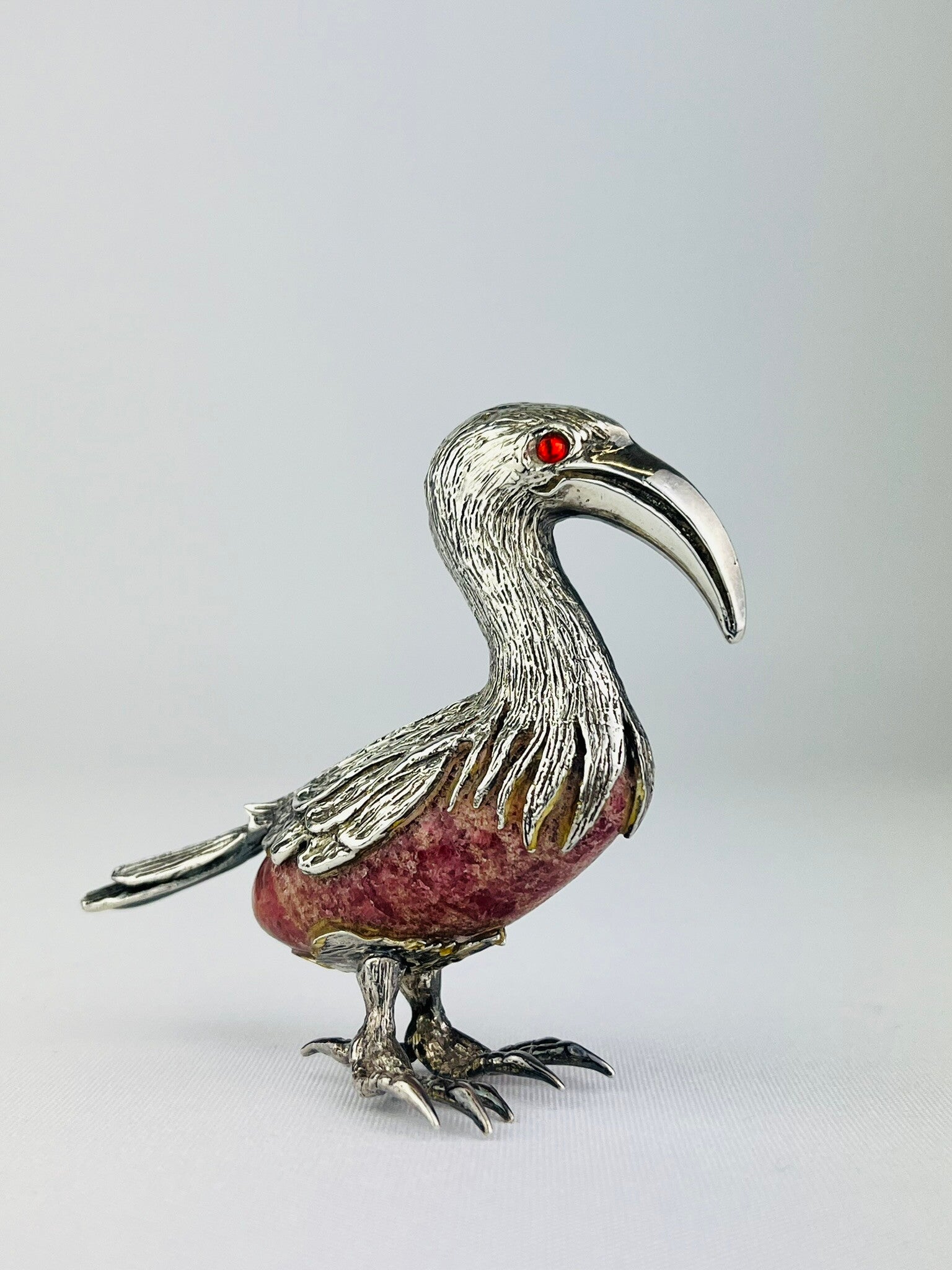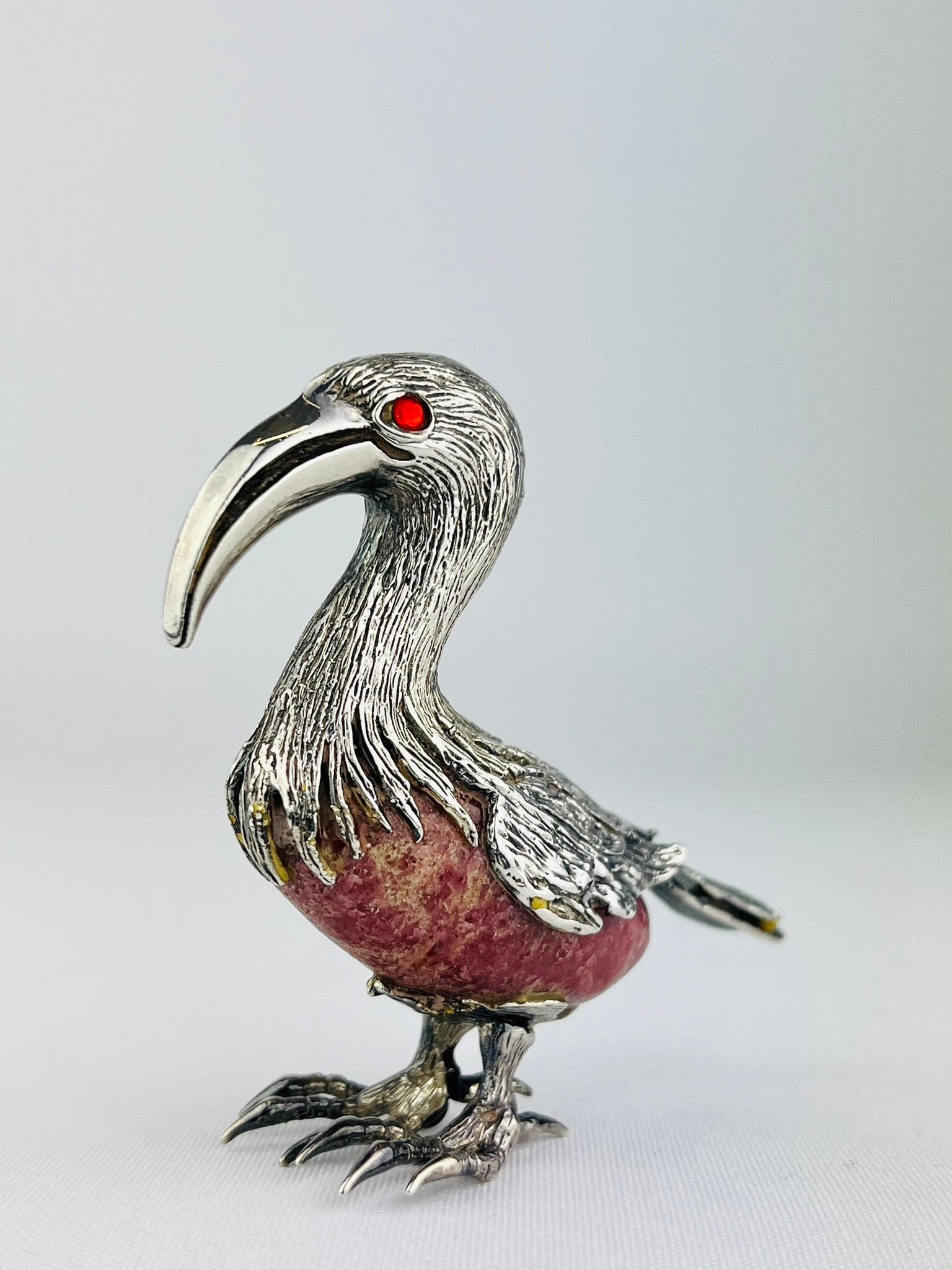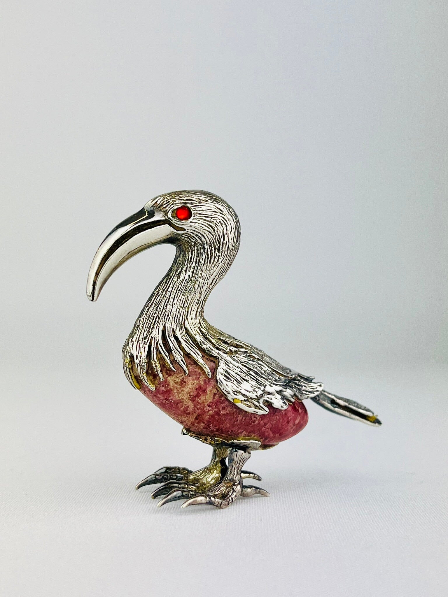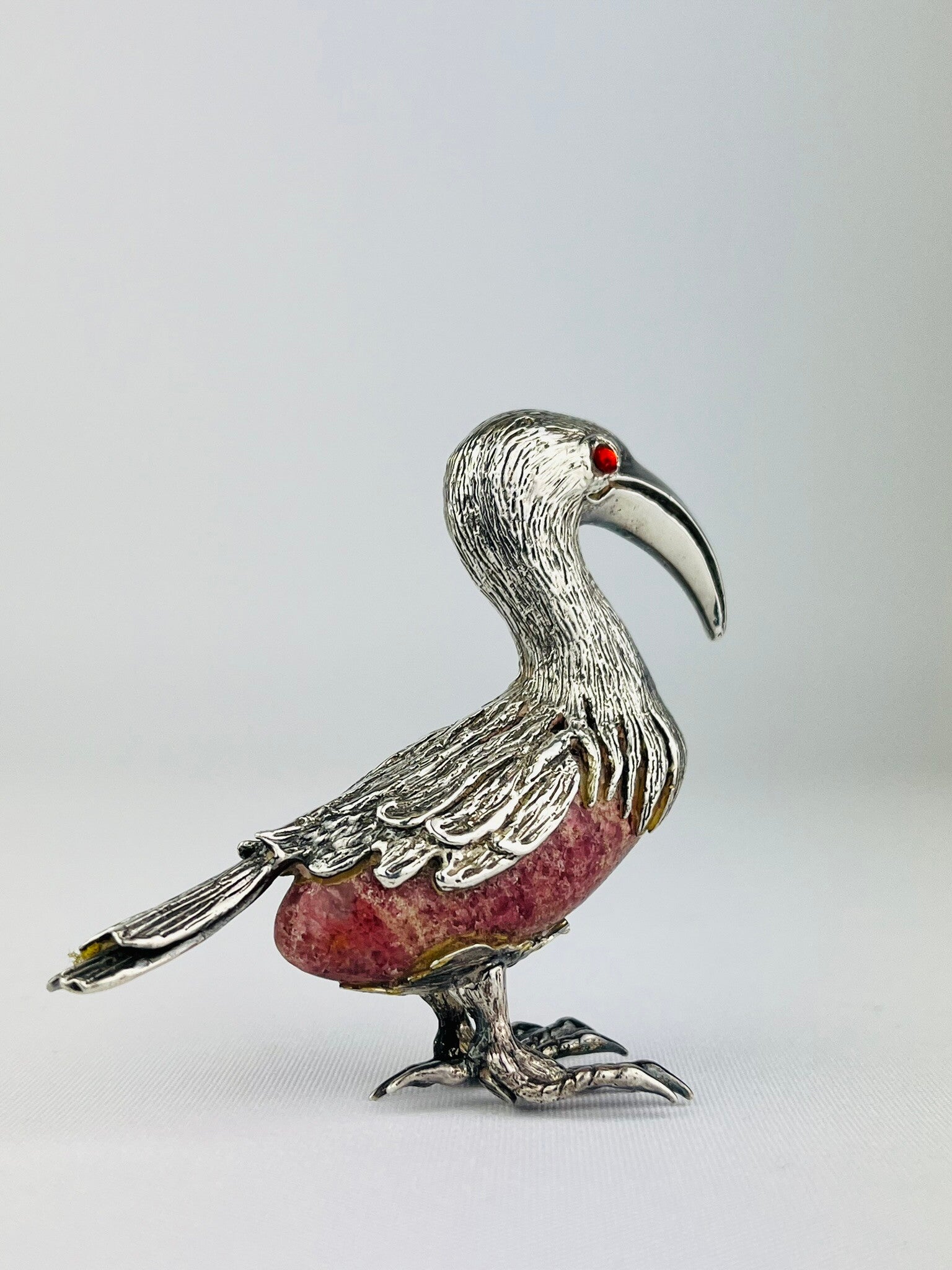 Rare silver sculpture of an ibis bird around a rock crystal (Rhodochrosite).