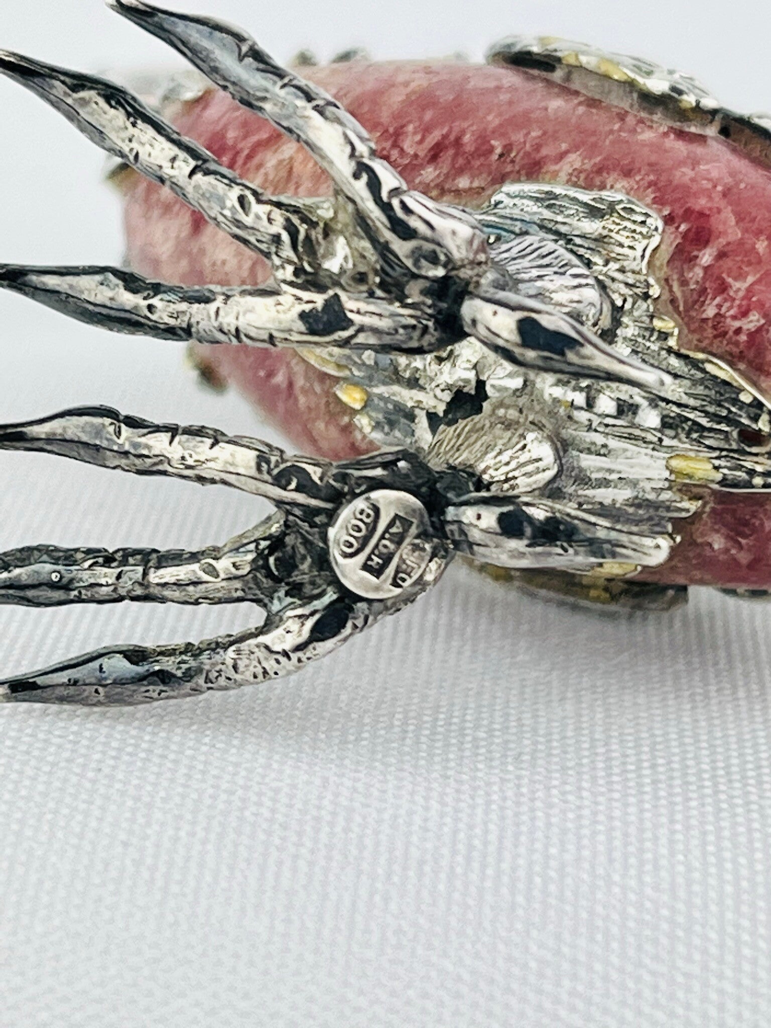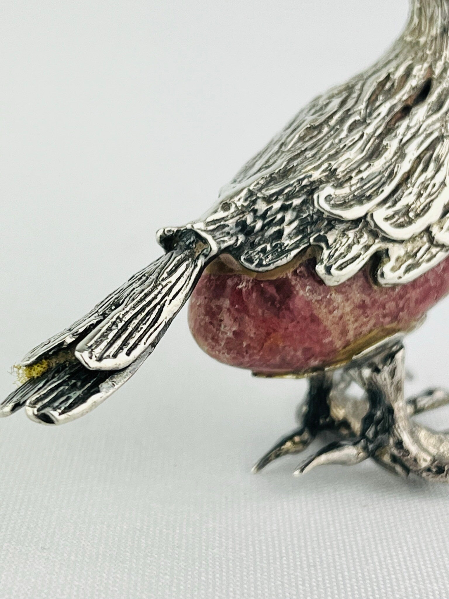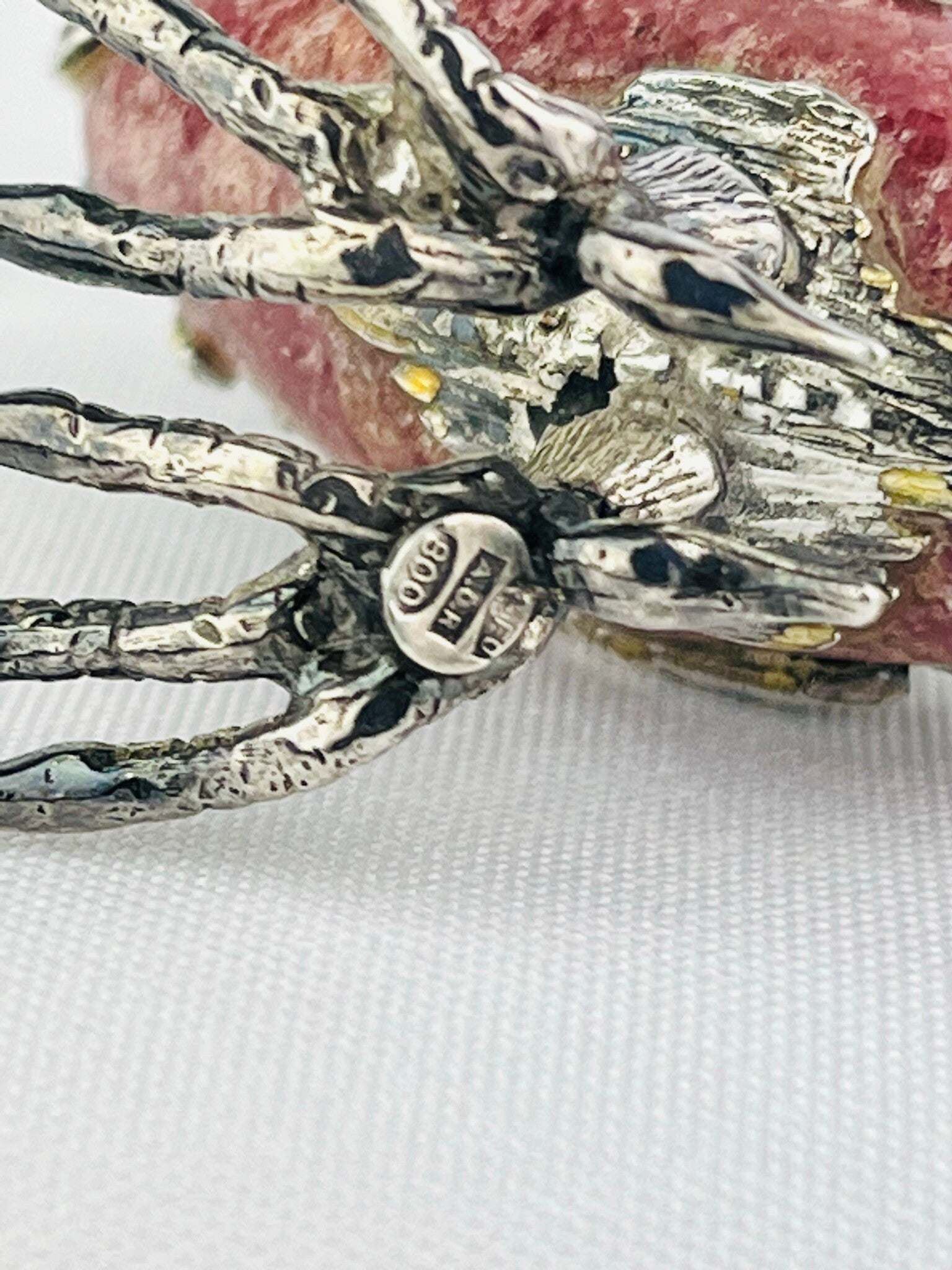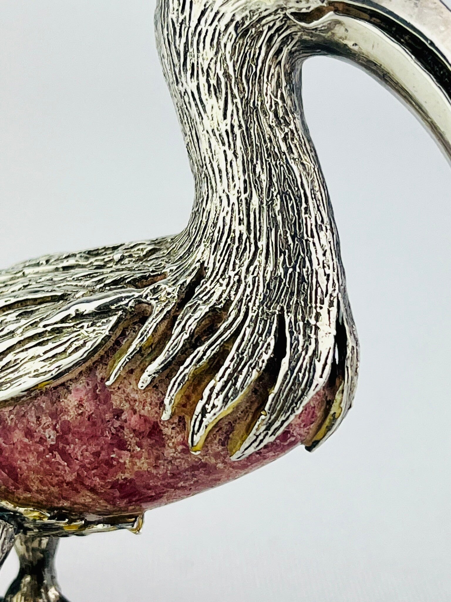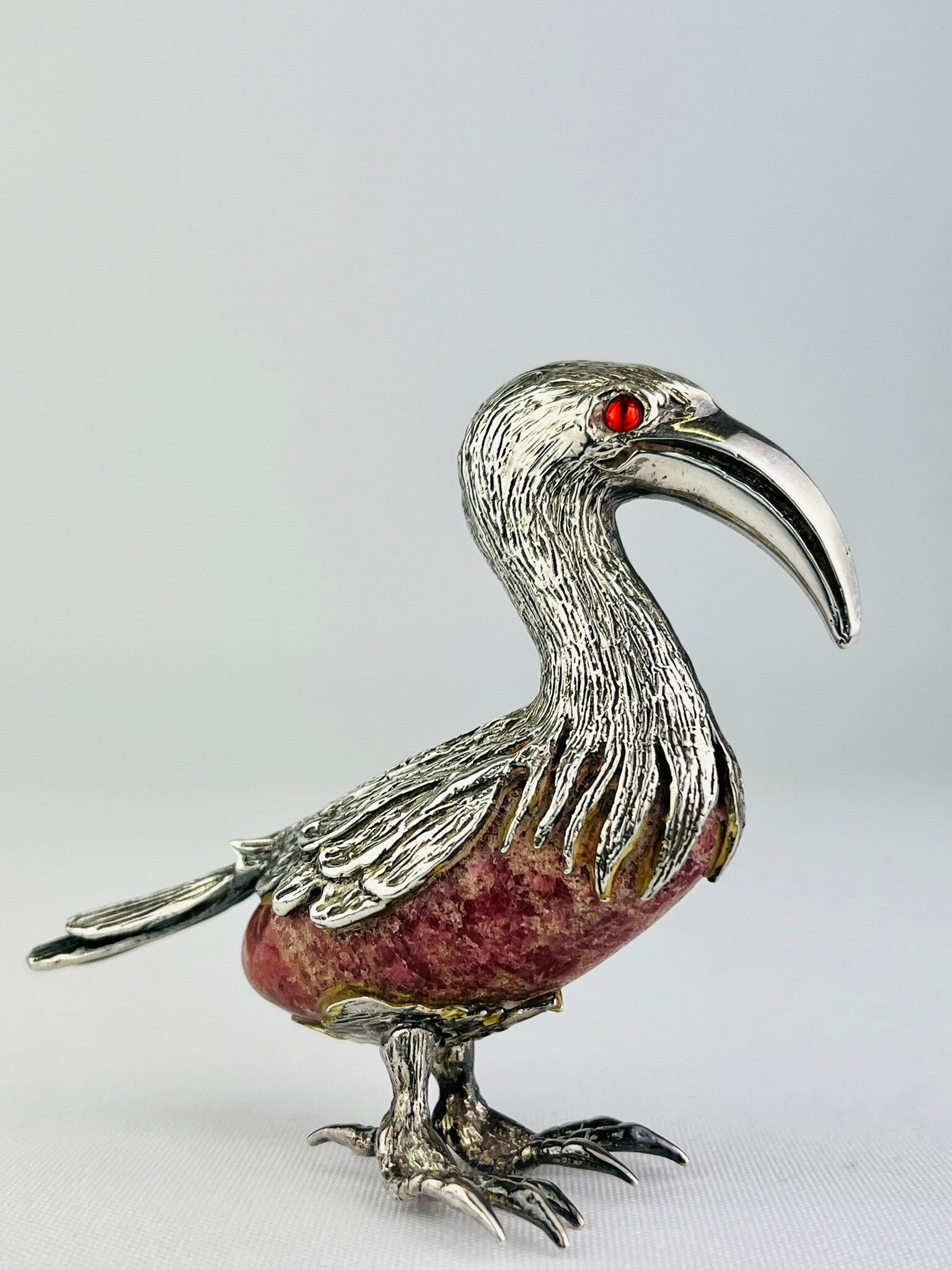 Rare silver sculpture of an ibis bird around a rock crystal (Rhodochrosite).