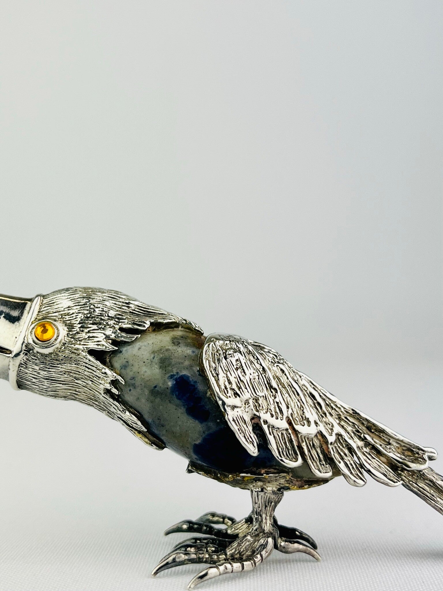 Rare silver sculpture of an toucan bird around a blue gemstone, Lapis Lazuli.