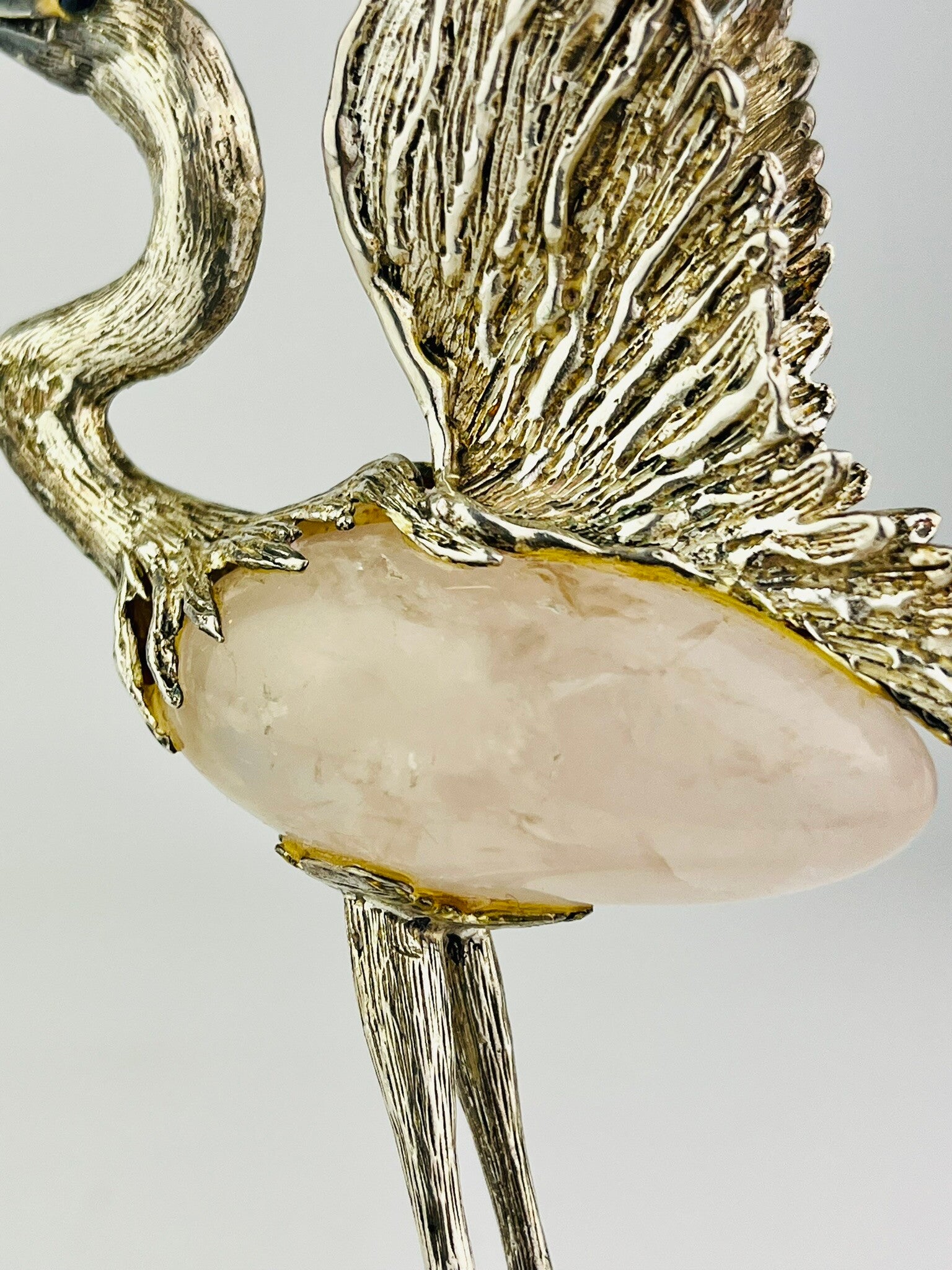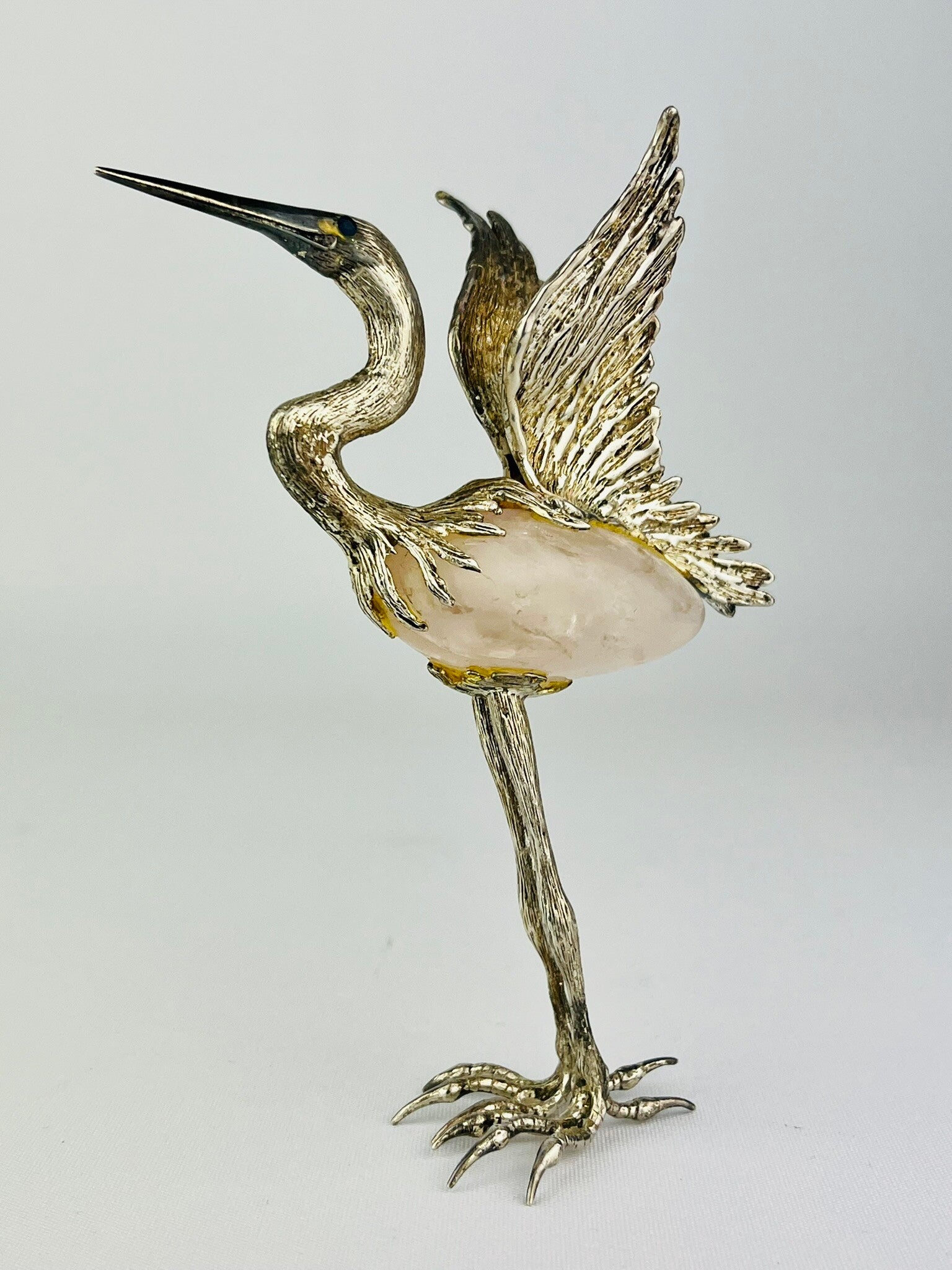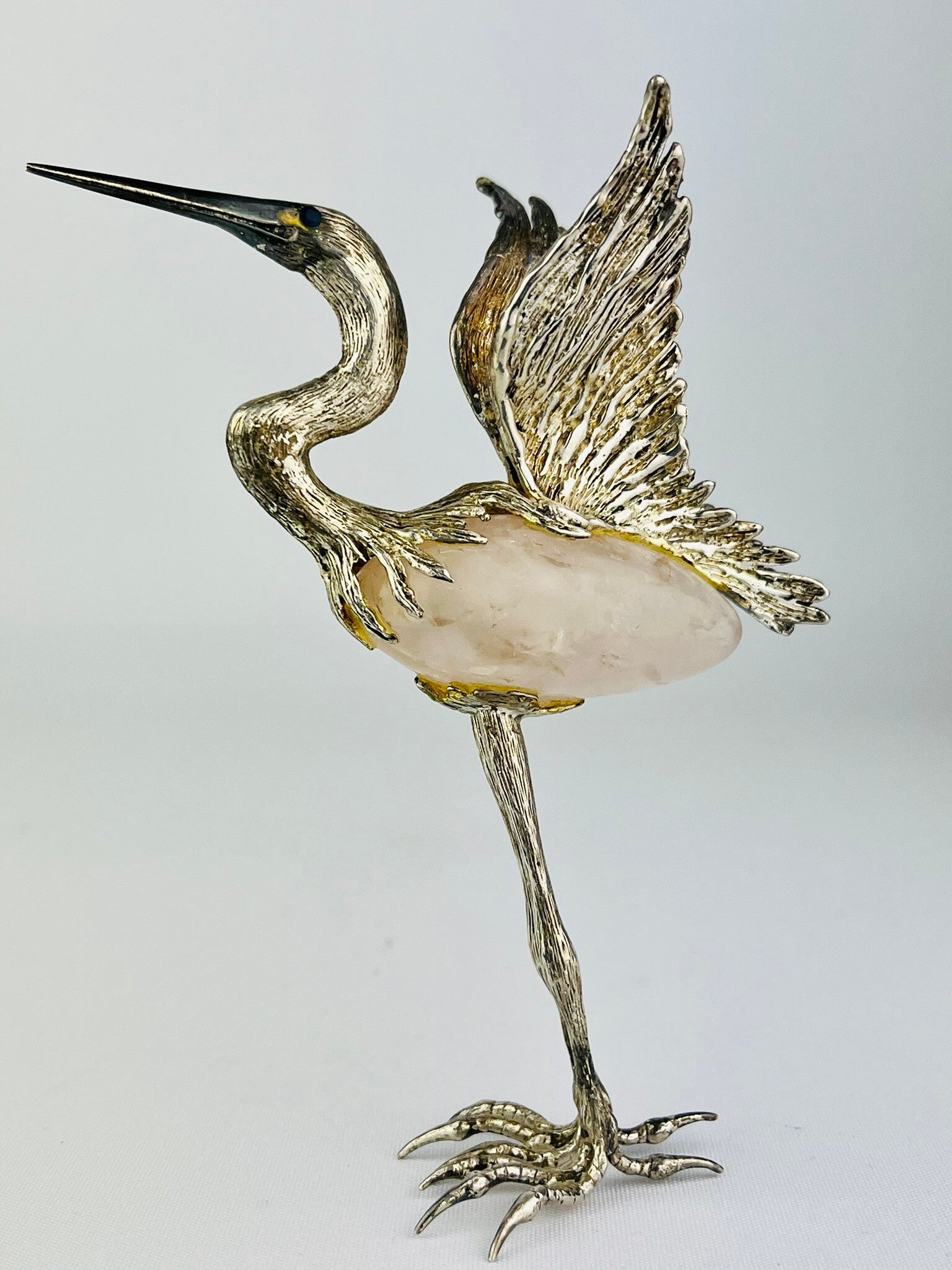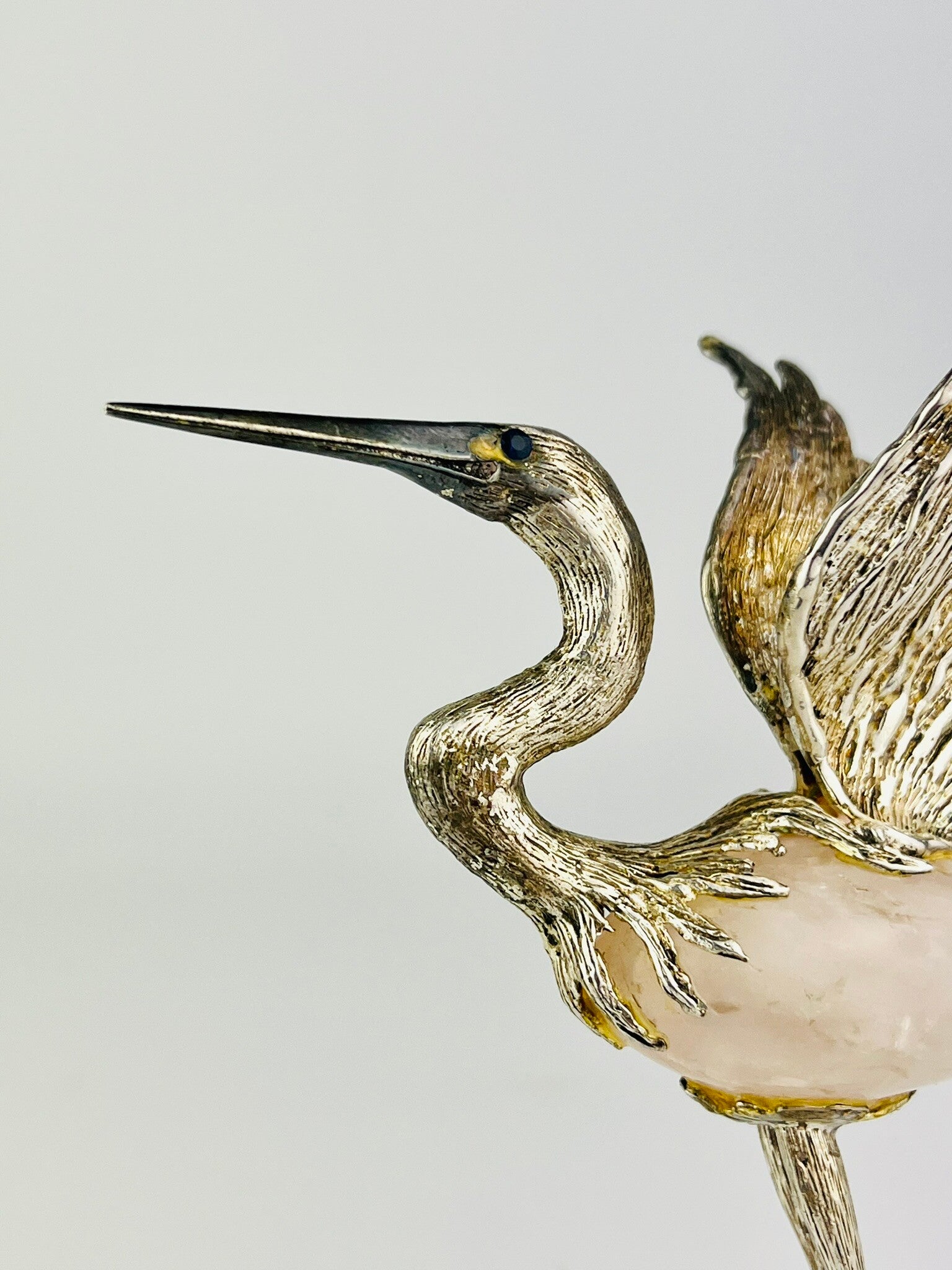 Italian Silver Crane Bird Sculpture - Pink Quartz Crystal