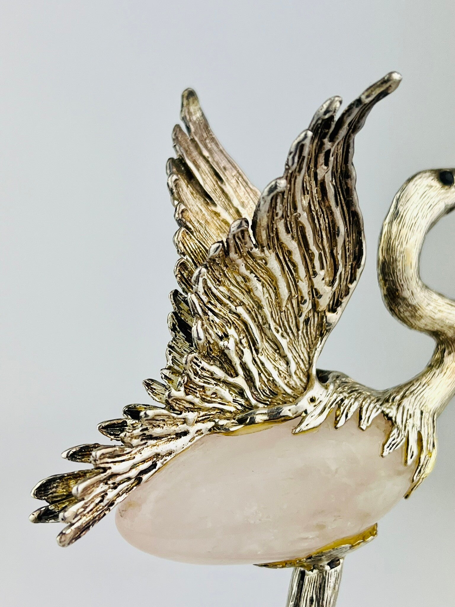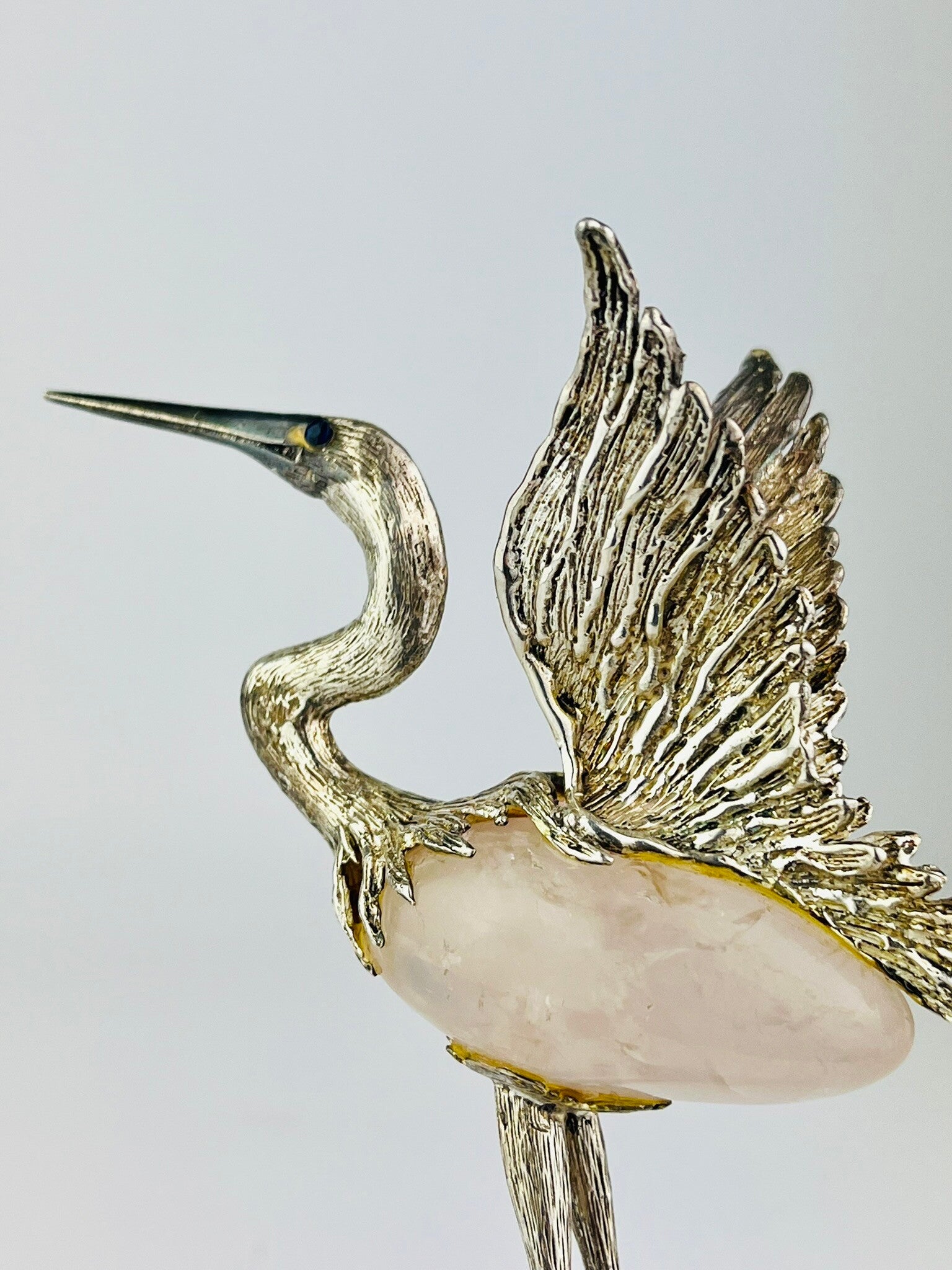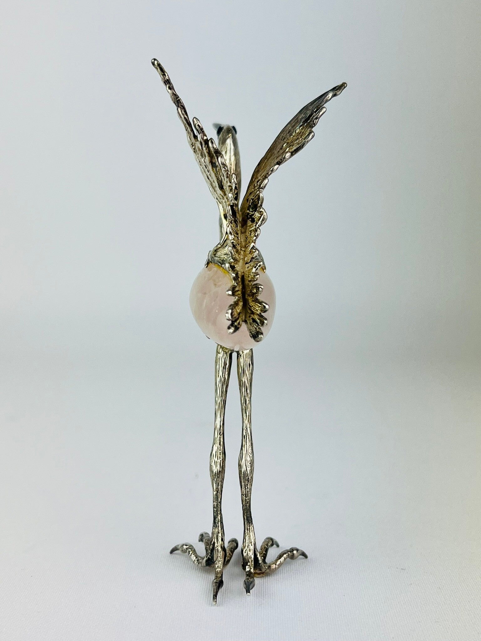 Rare silver sculpture of an crane bird around a pink quartz crystal.