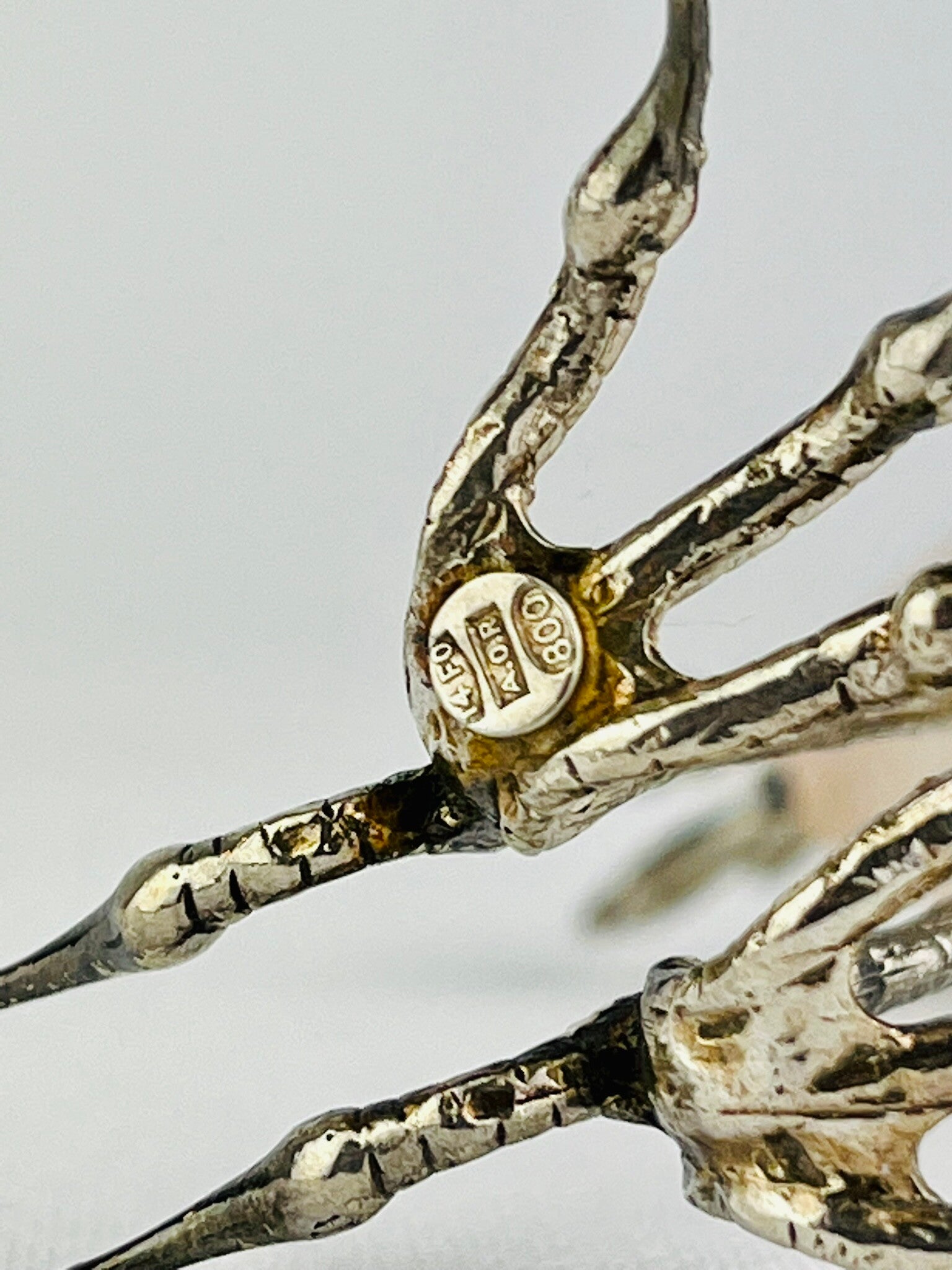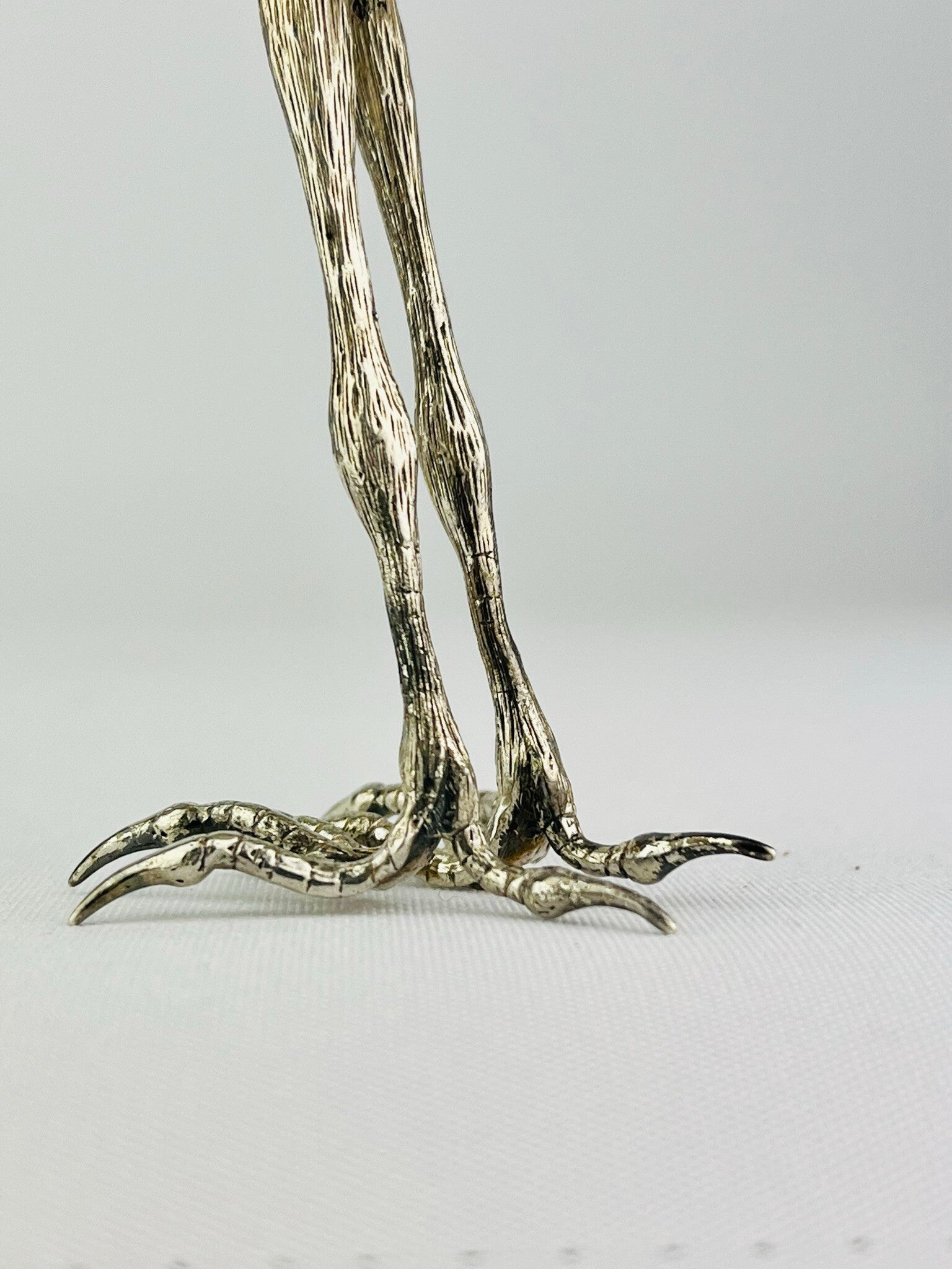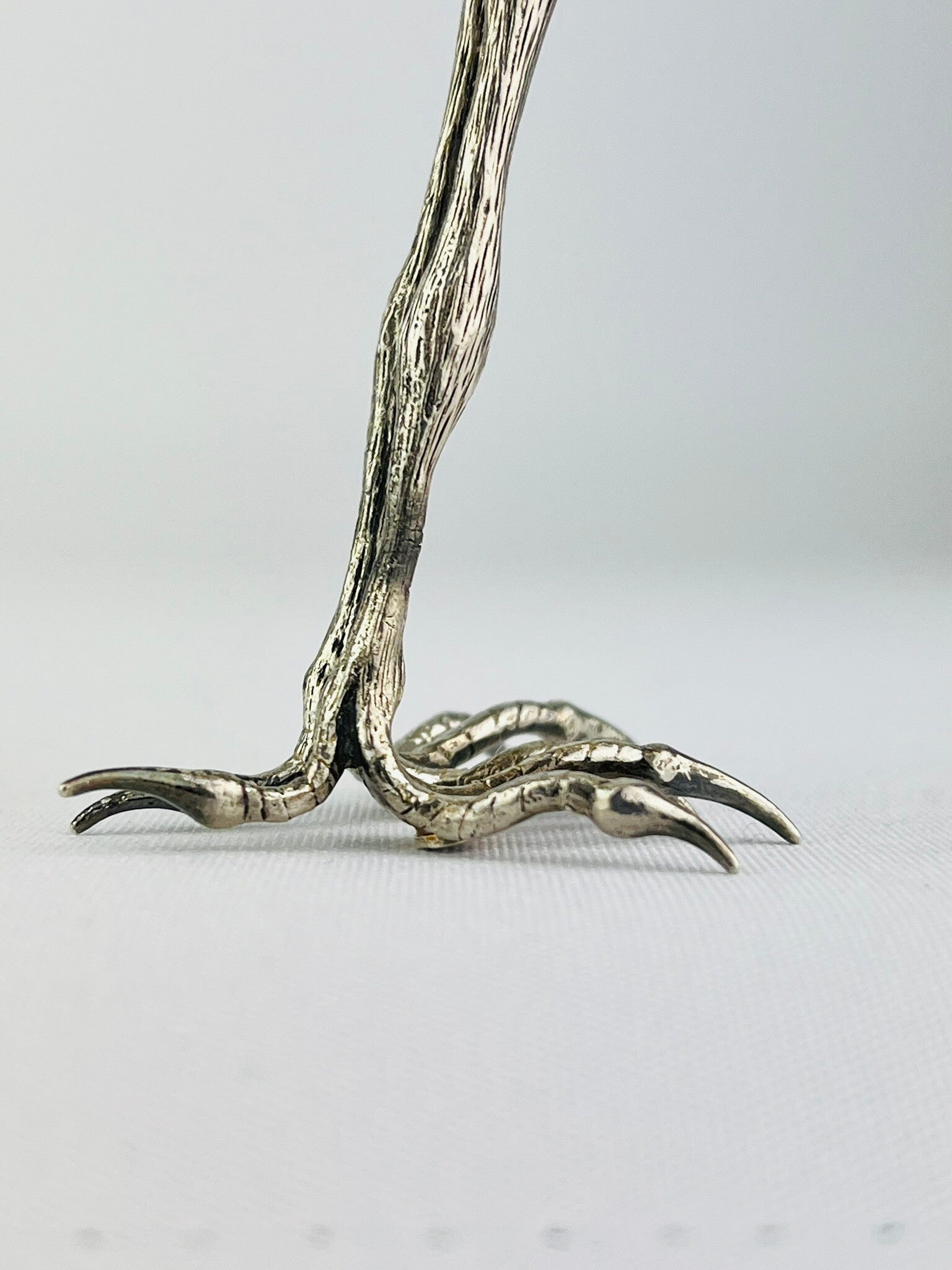 Rare silver sculpture of an crane bird around a pink quartz crystal.