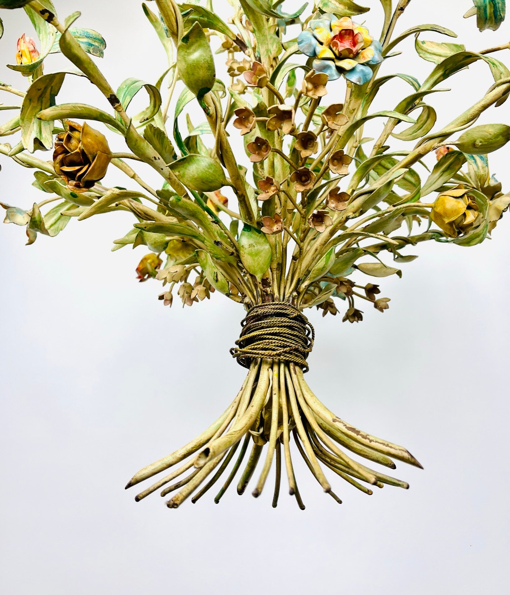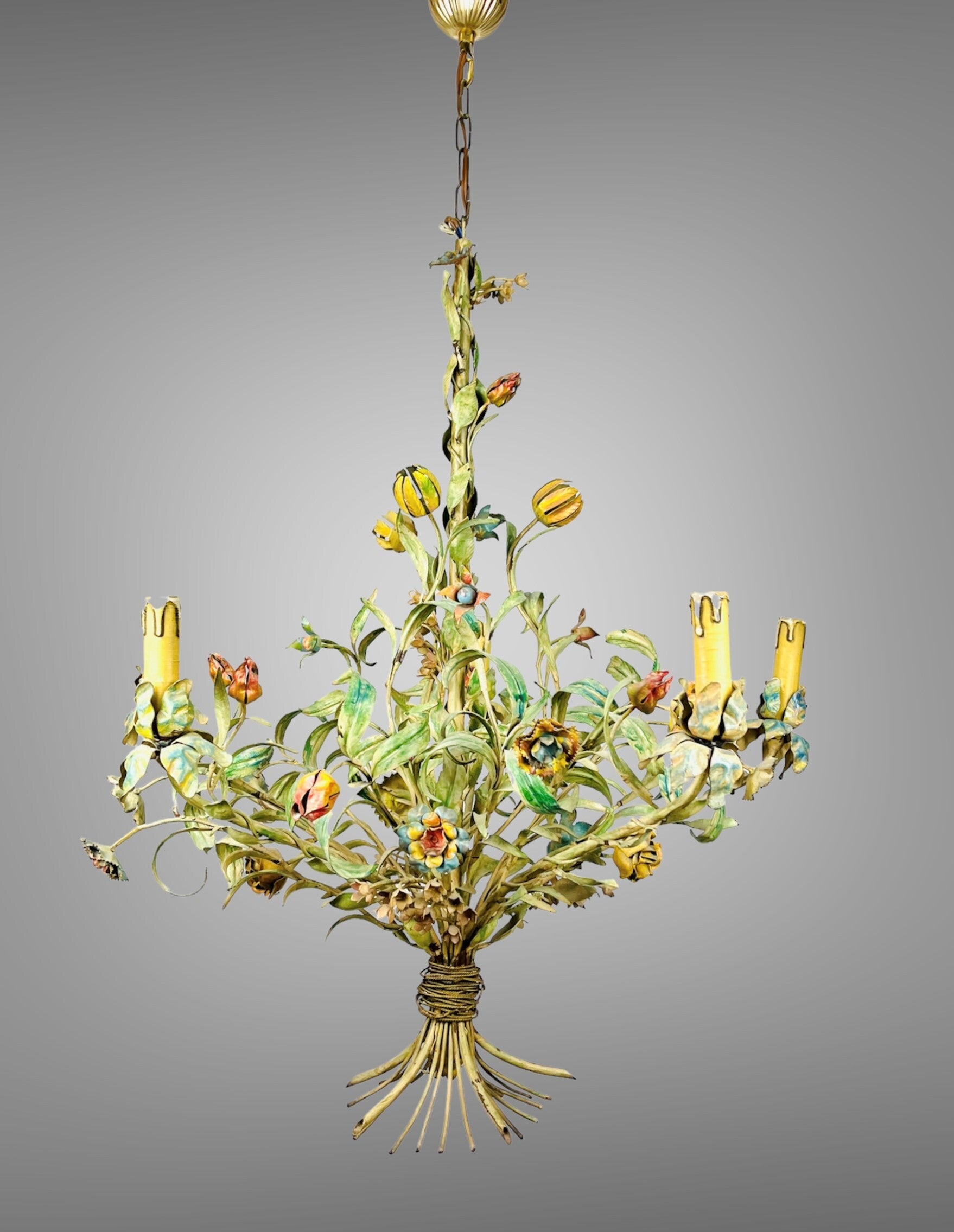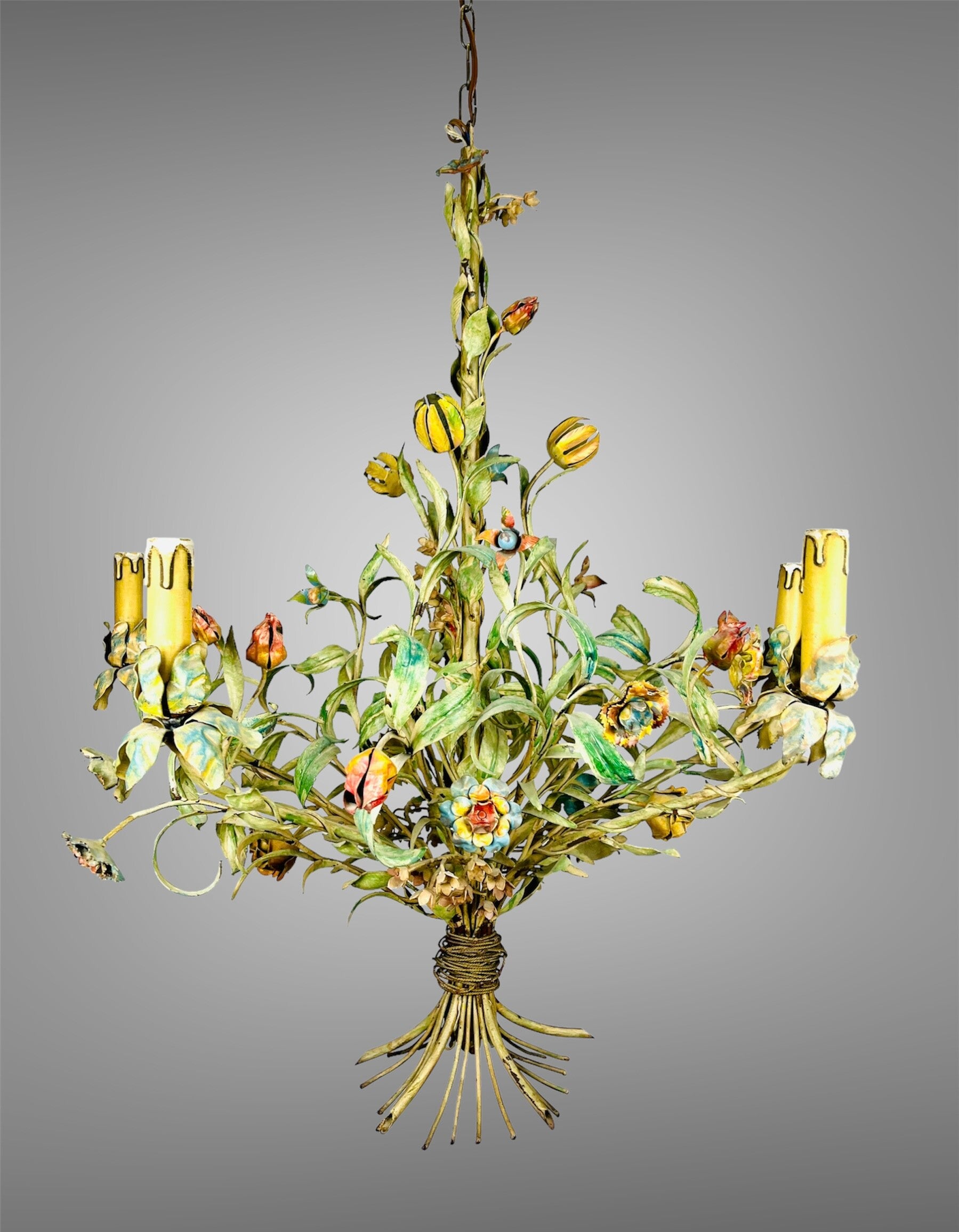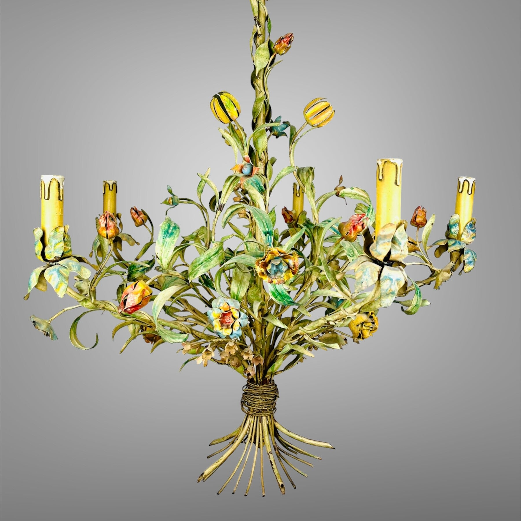 Italian Tole Chandelier - 1950s - Colorful Floral Bouquet