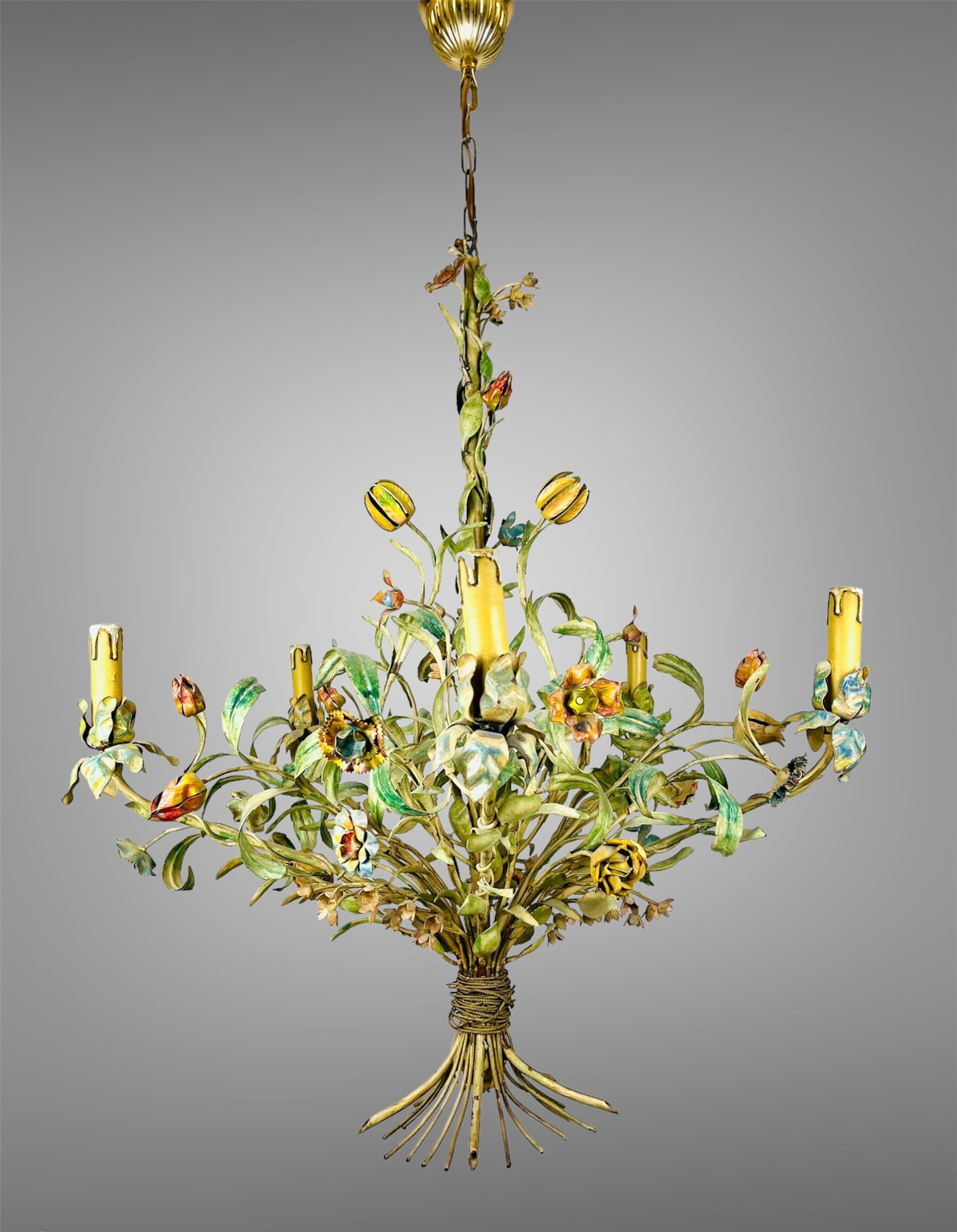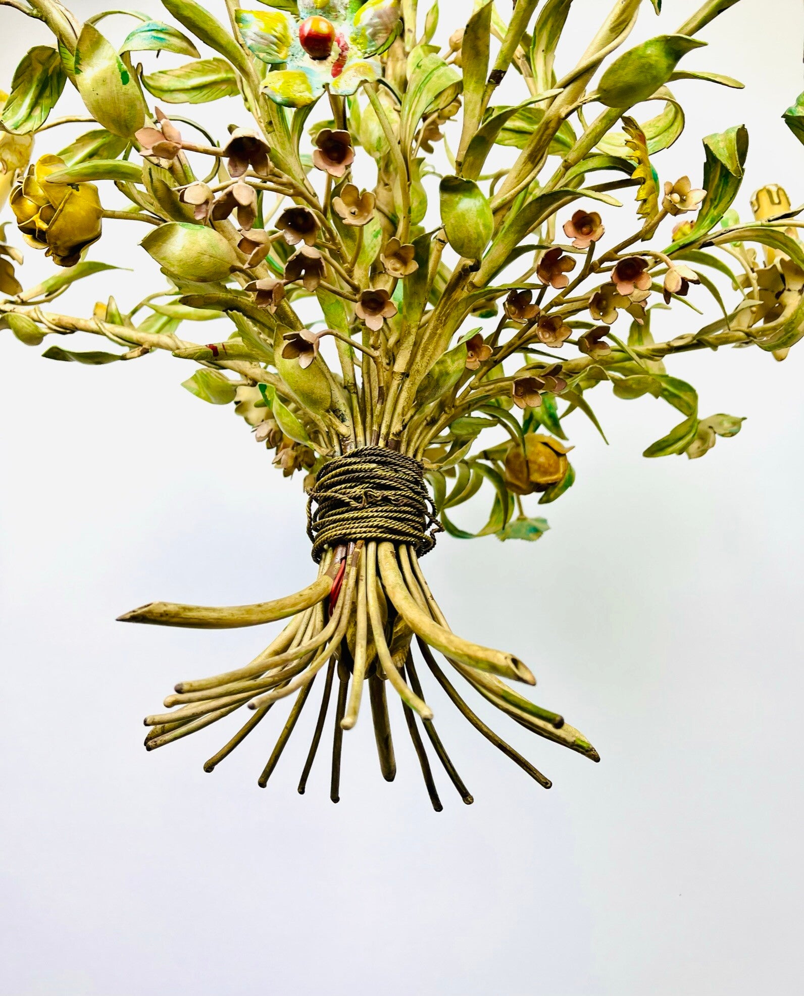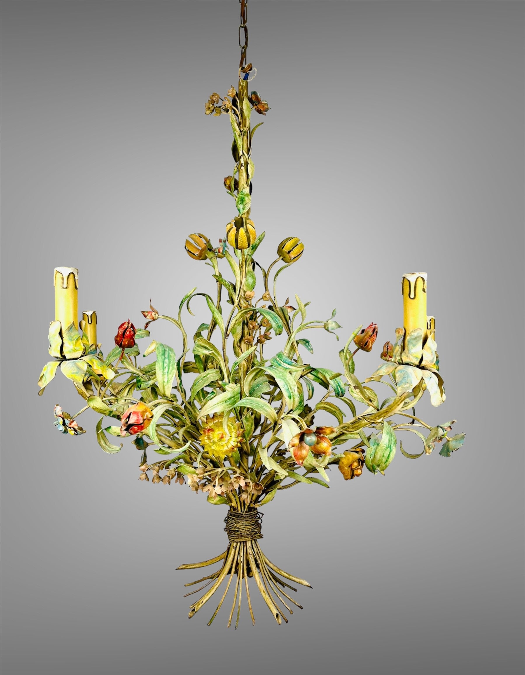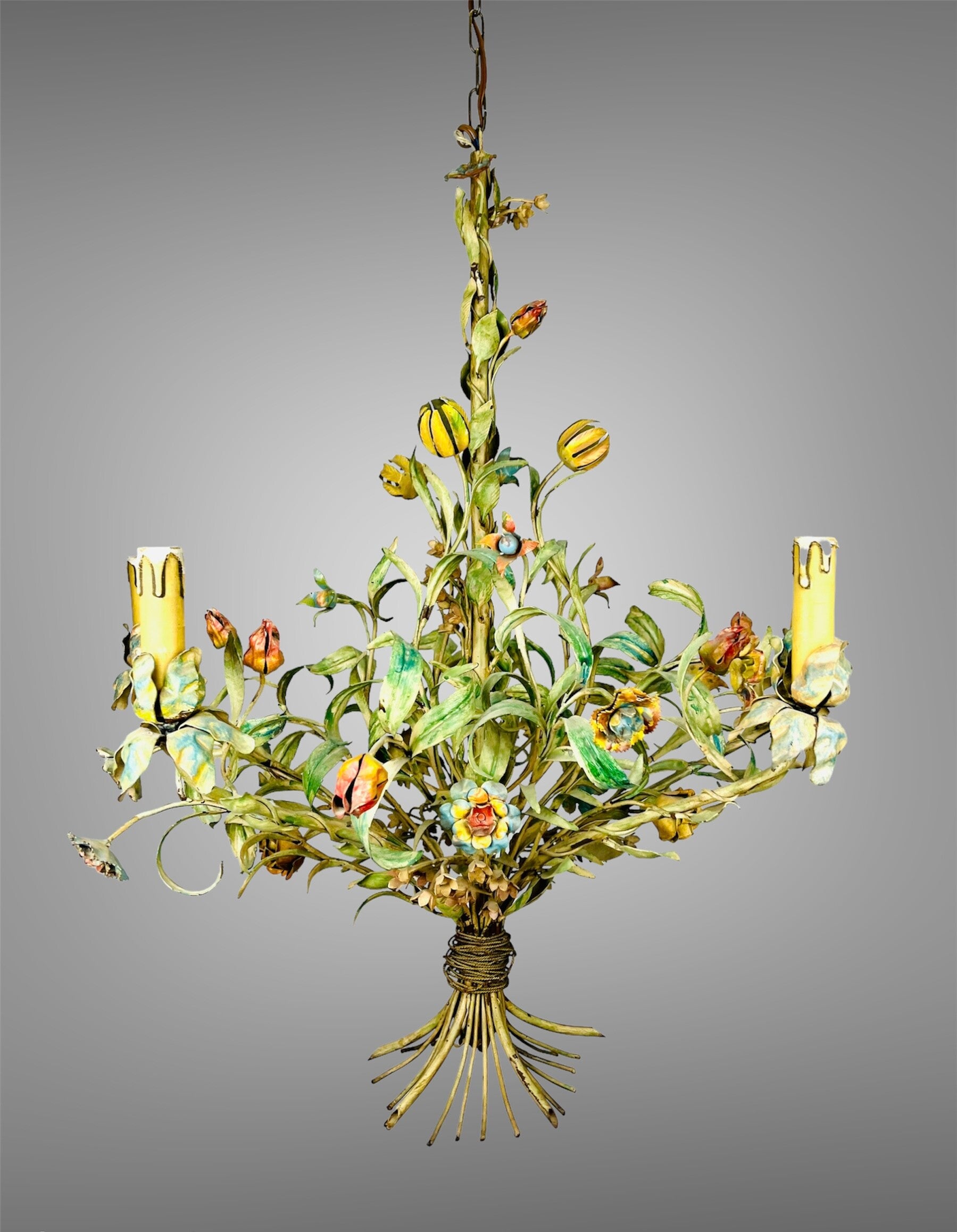 Italian Tole Chandelier - 1950s - Colorful Floral Bouquet