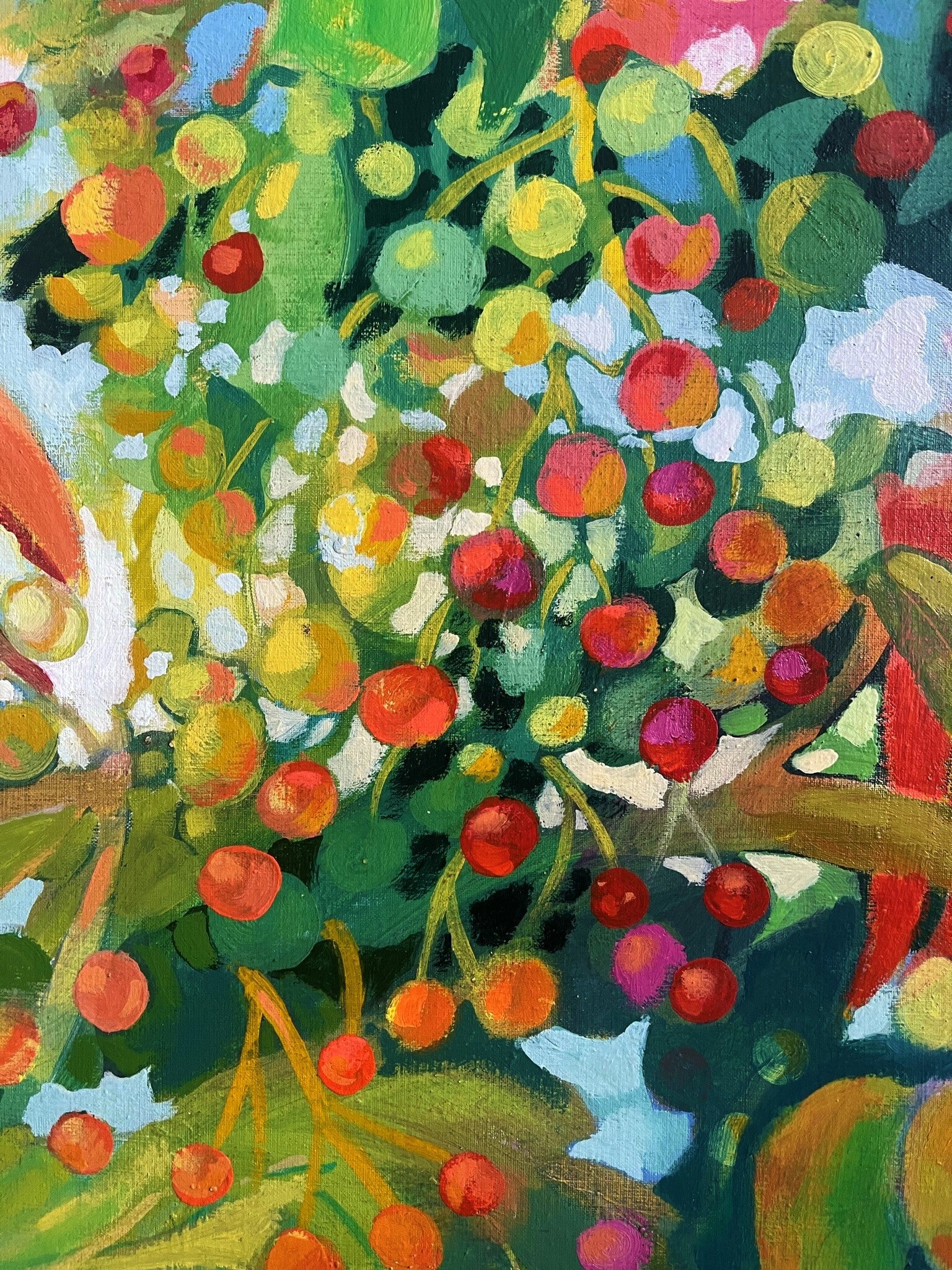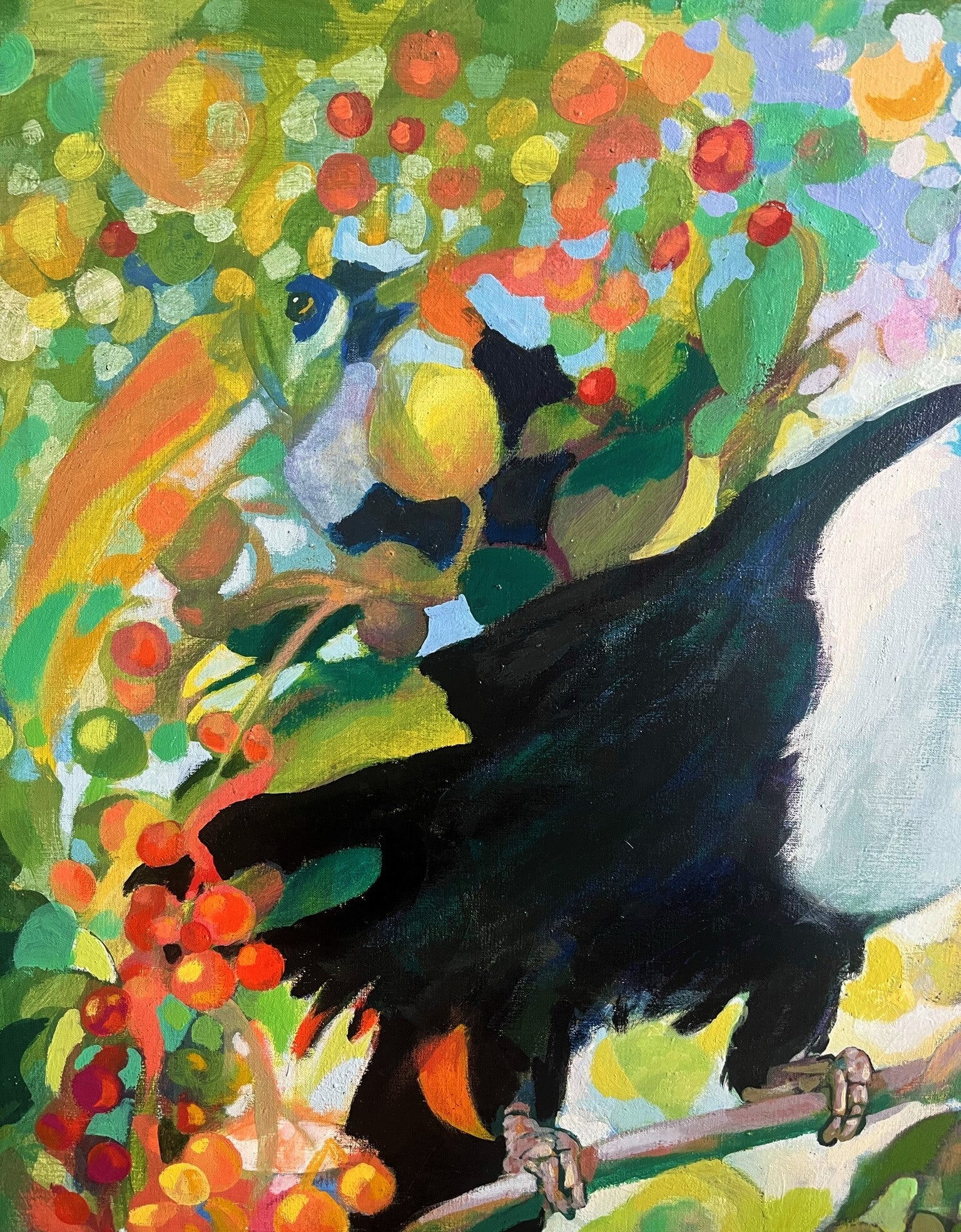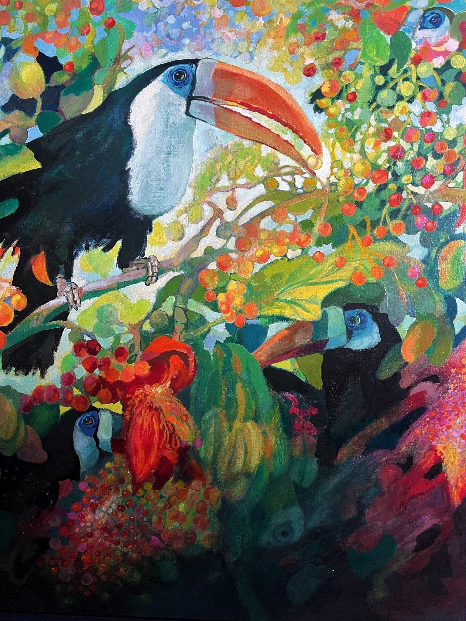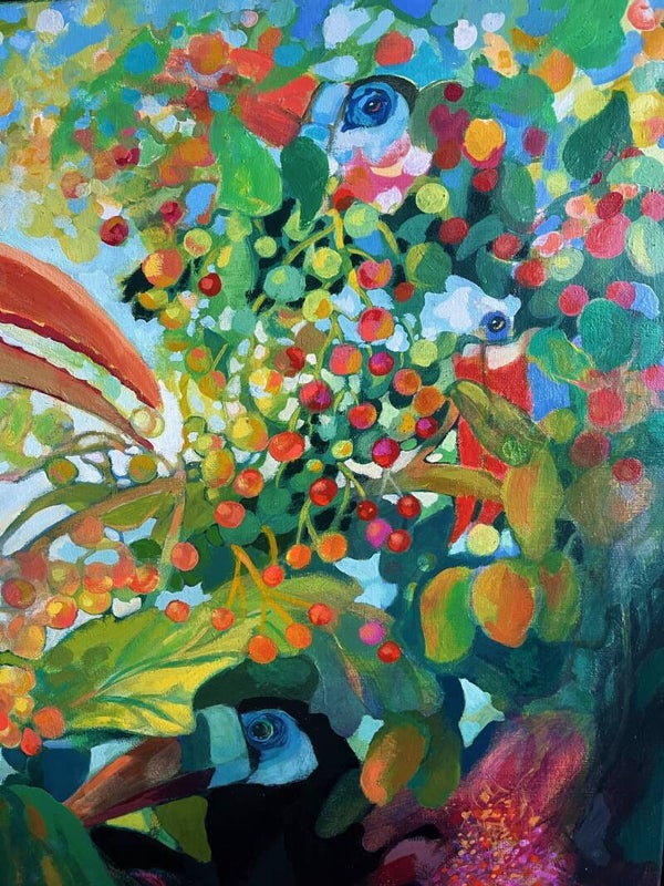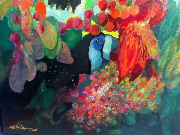 Large oil painting on canvas. This decorative work, which stands out for its colorful alternations, hides some toucans between a tropical fruit tree.