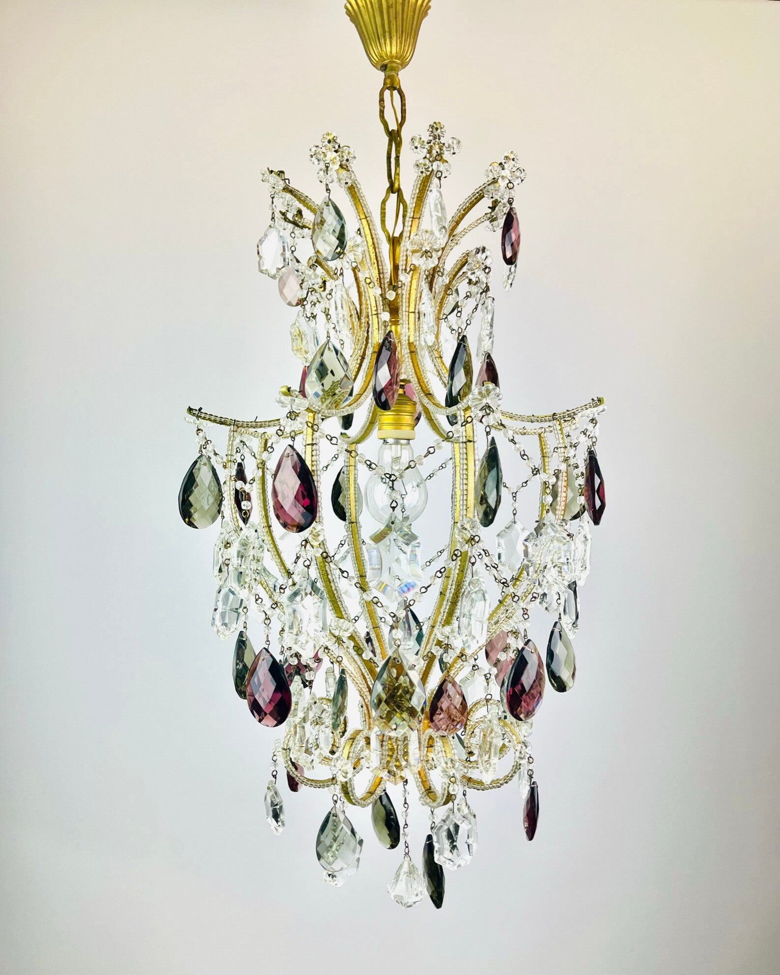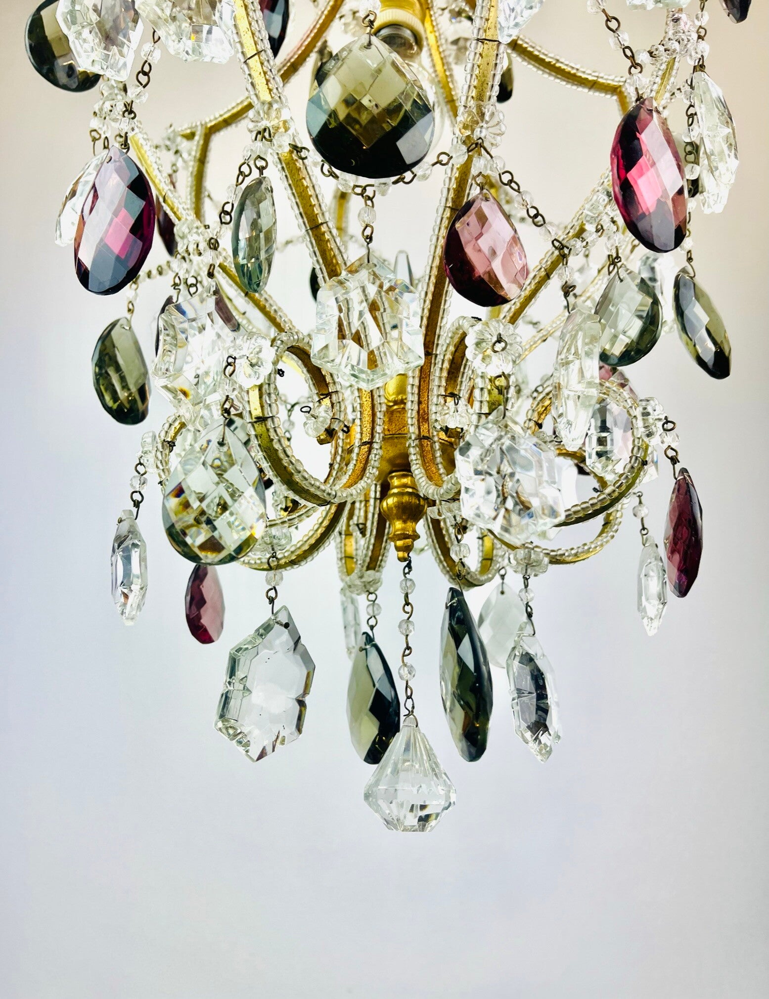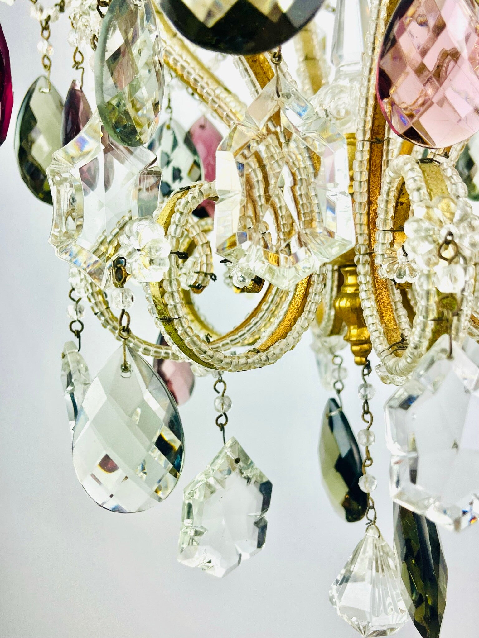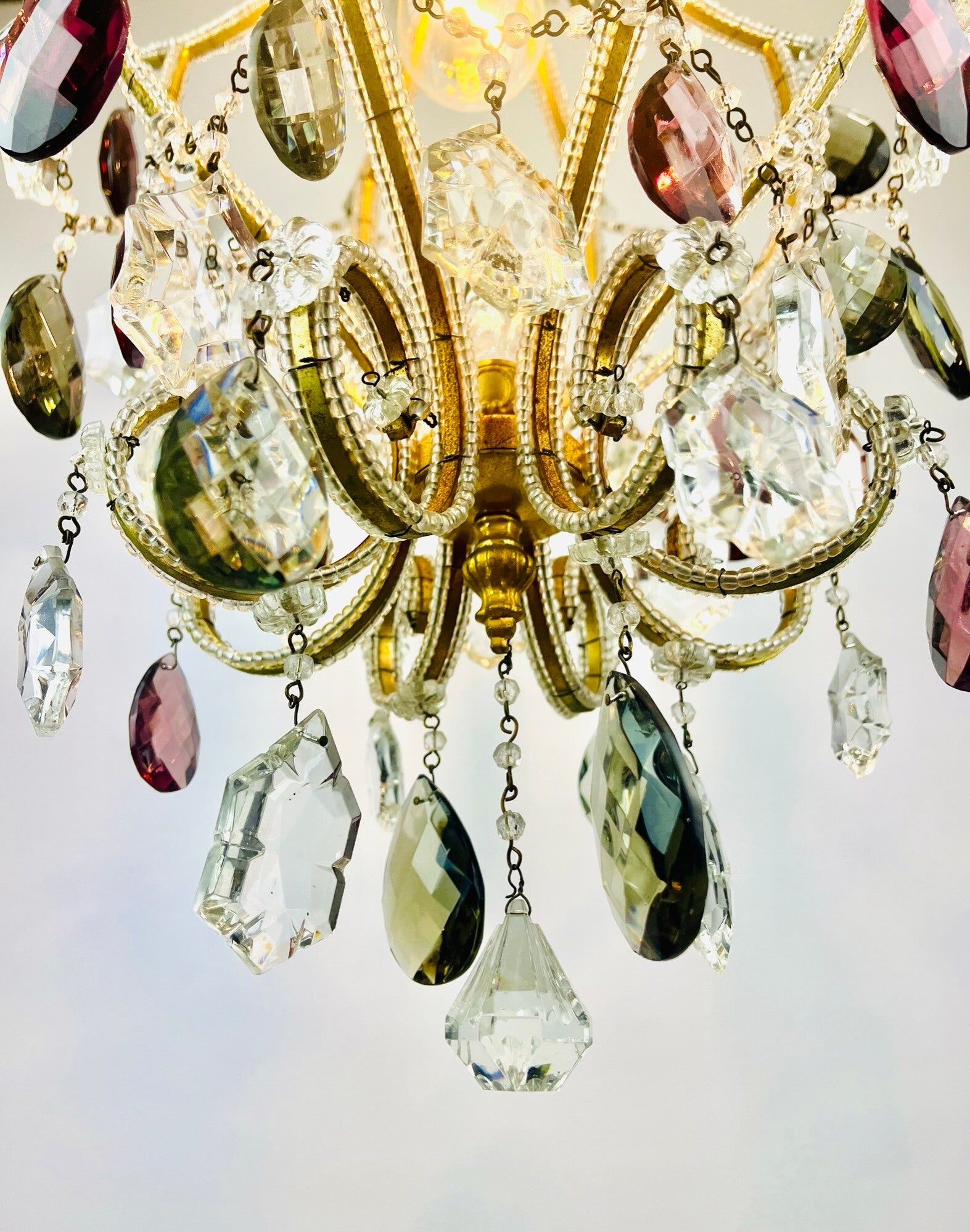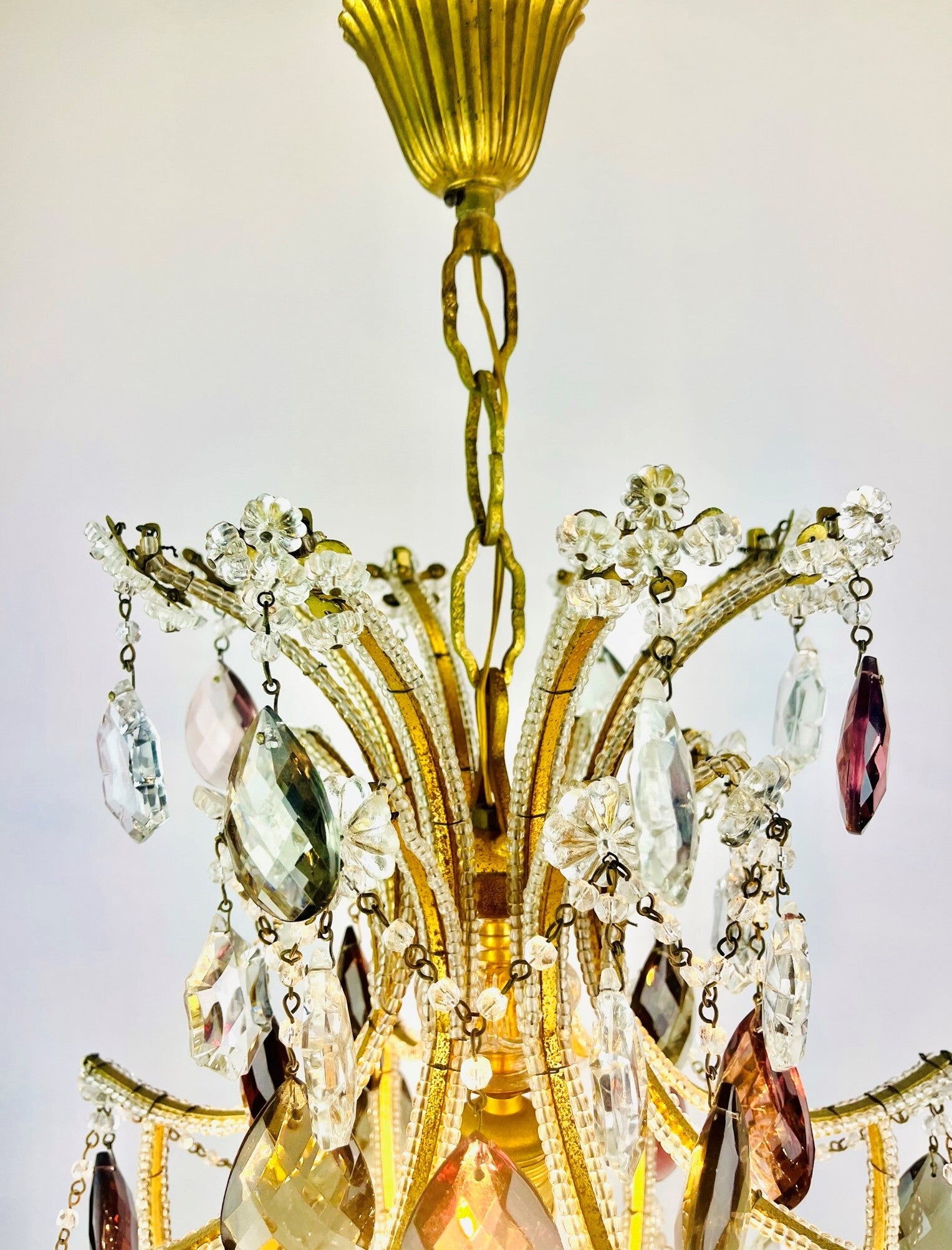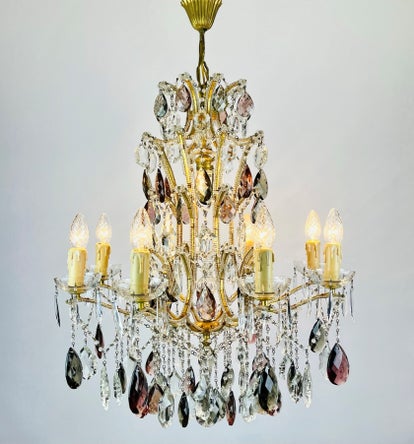 Italian chandelier richly filled with cut crystals and beads.