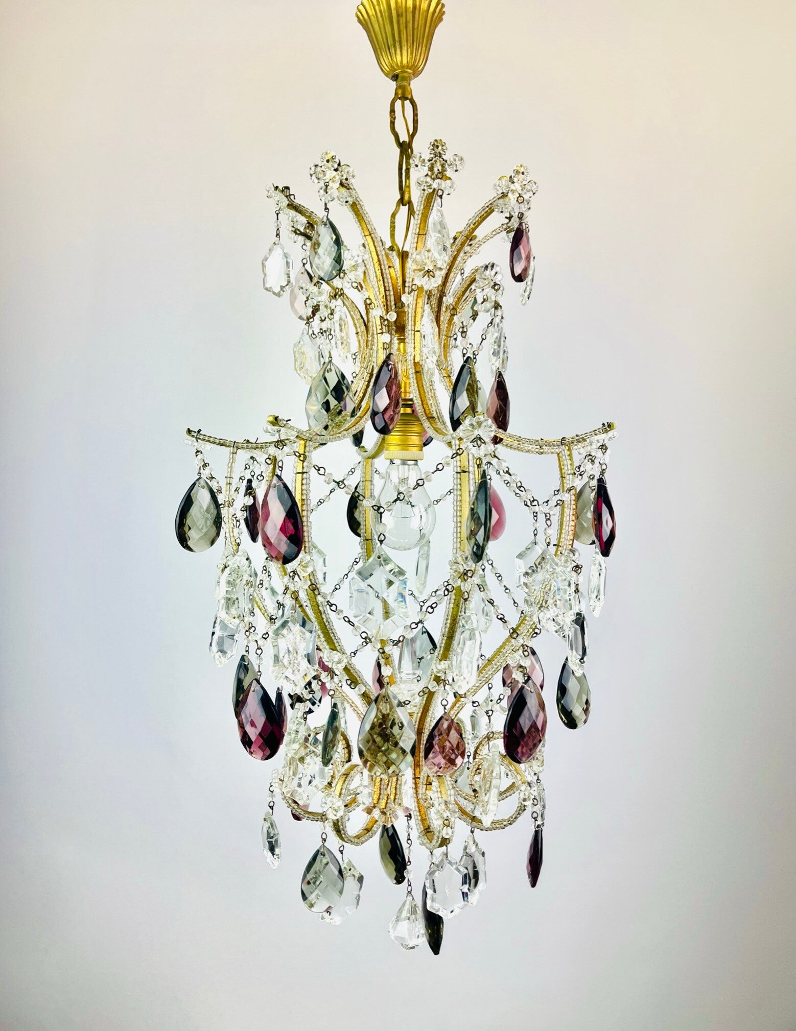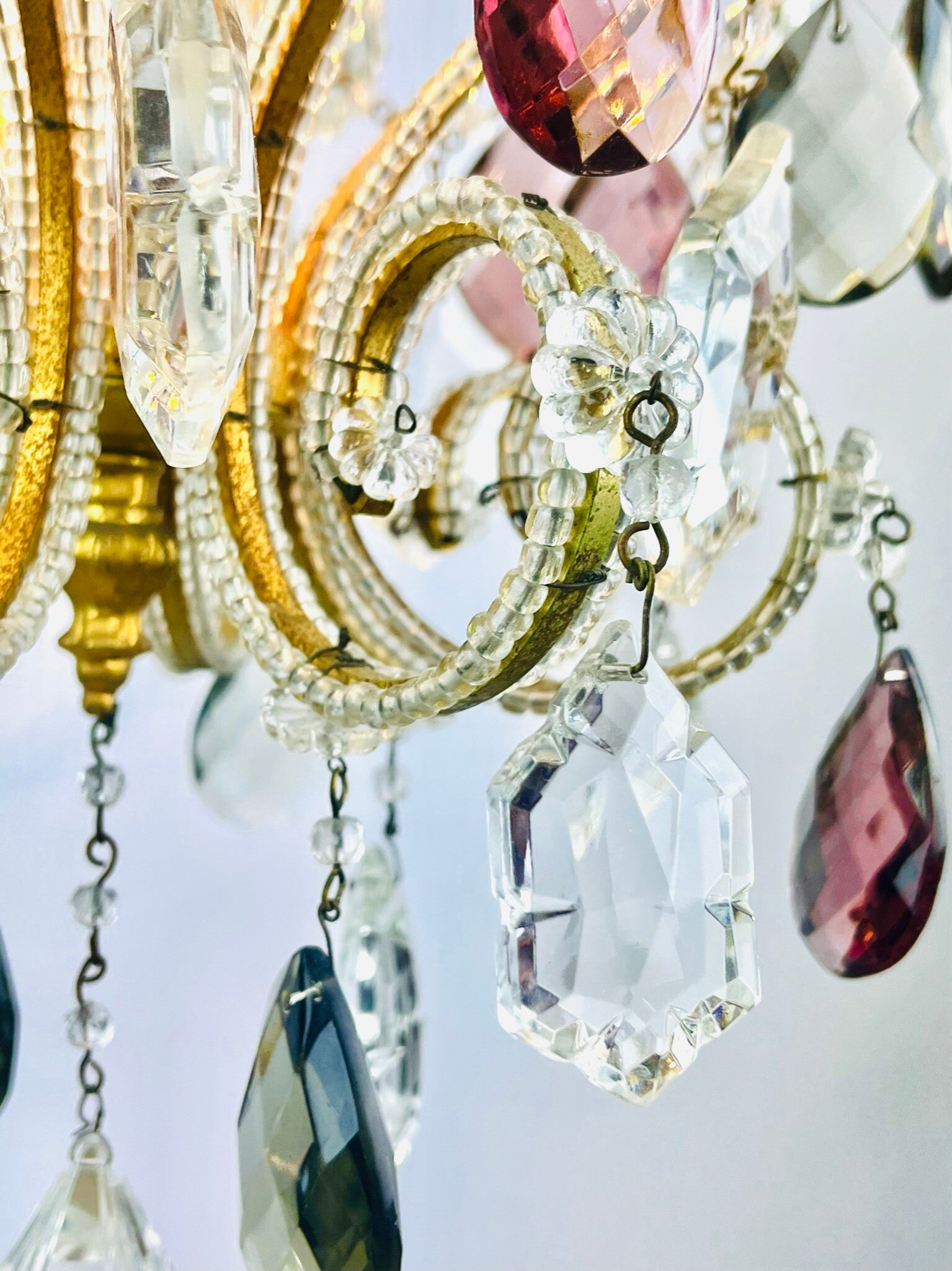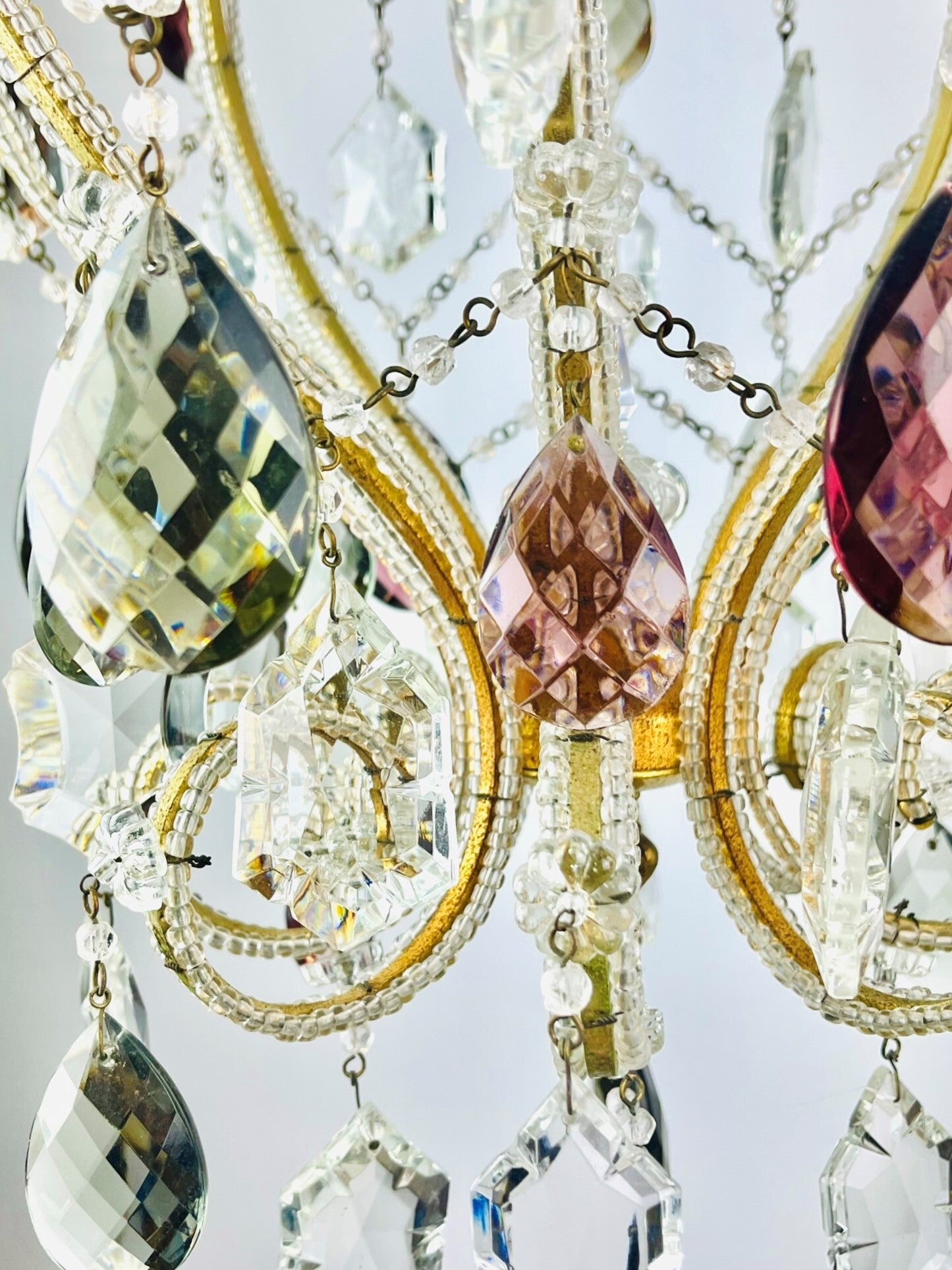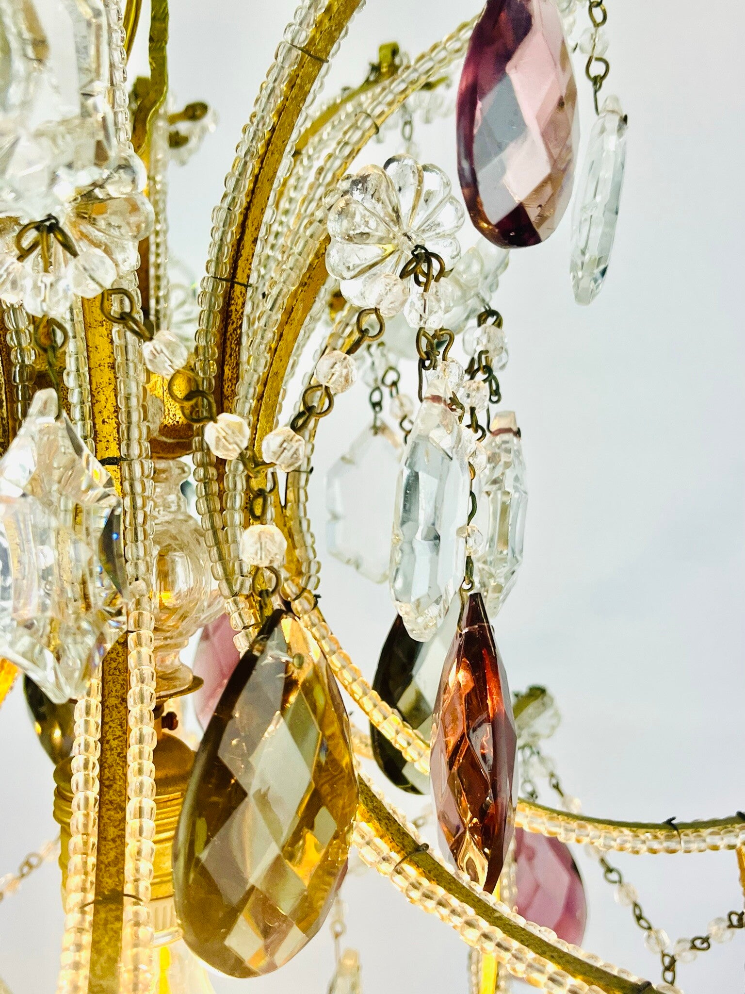 Italian chandelier richly filled with cut crystals and beads.