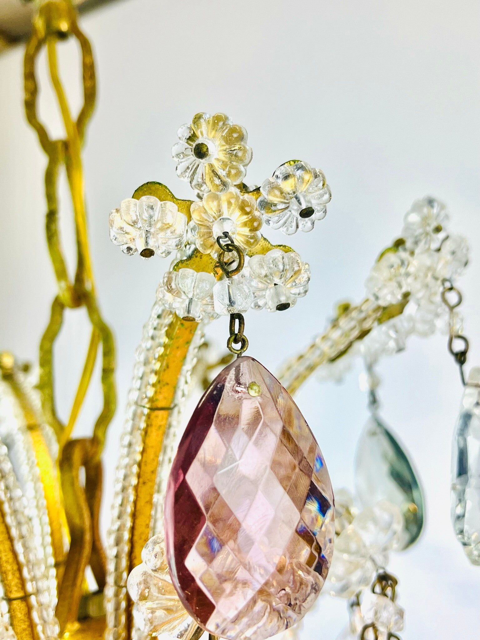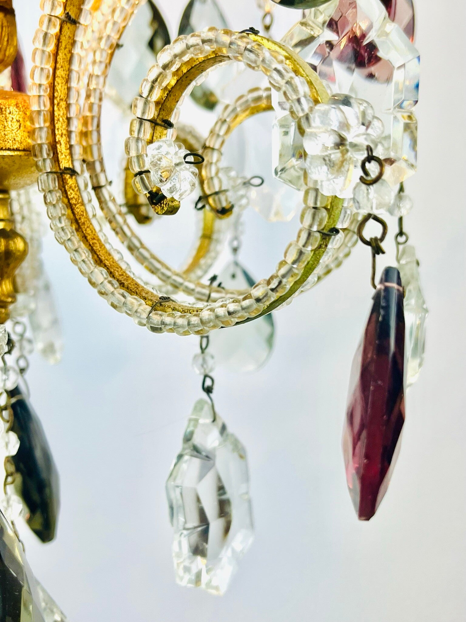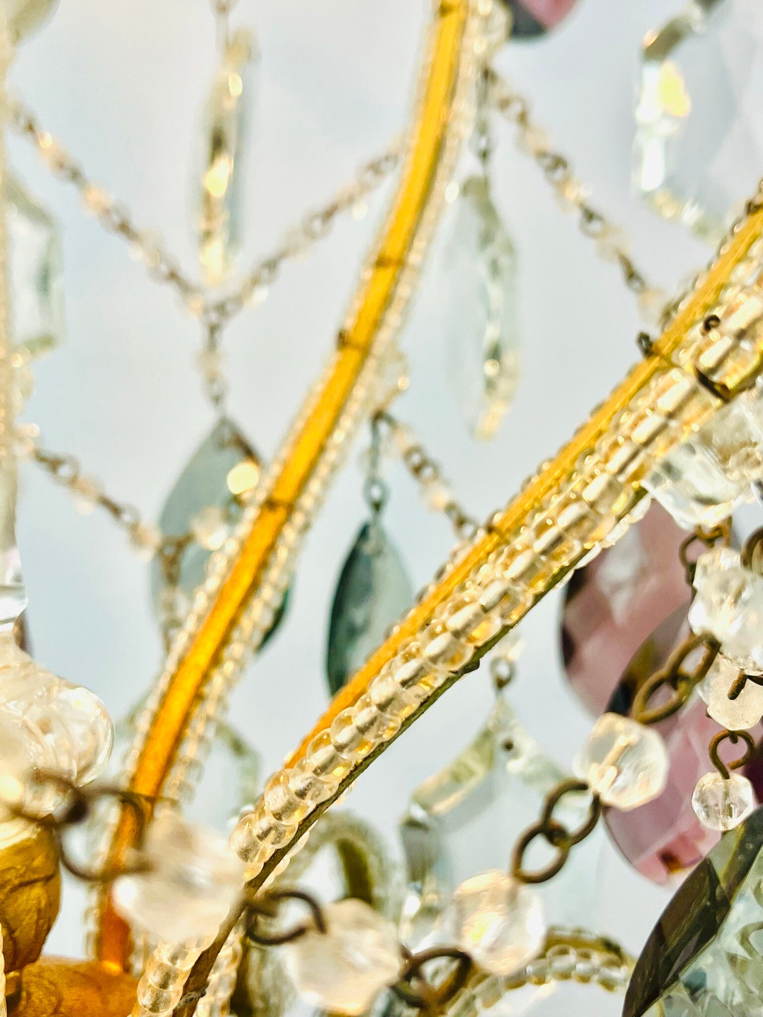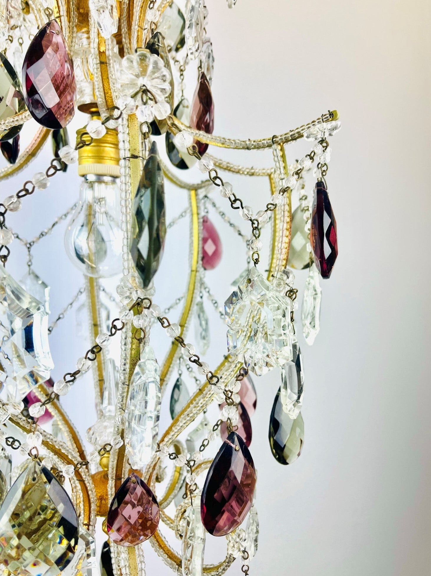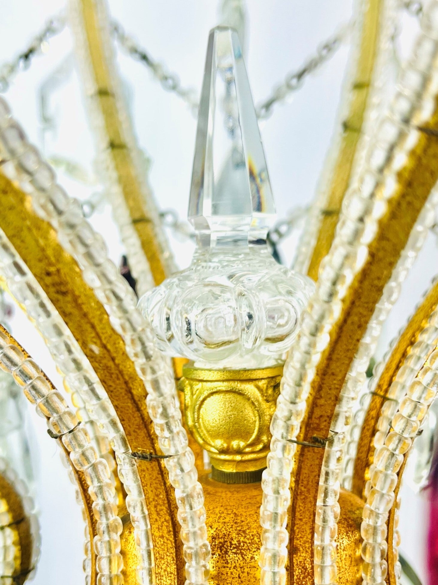 Italian chandelier richly filled with cut crystals and beads.