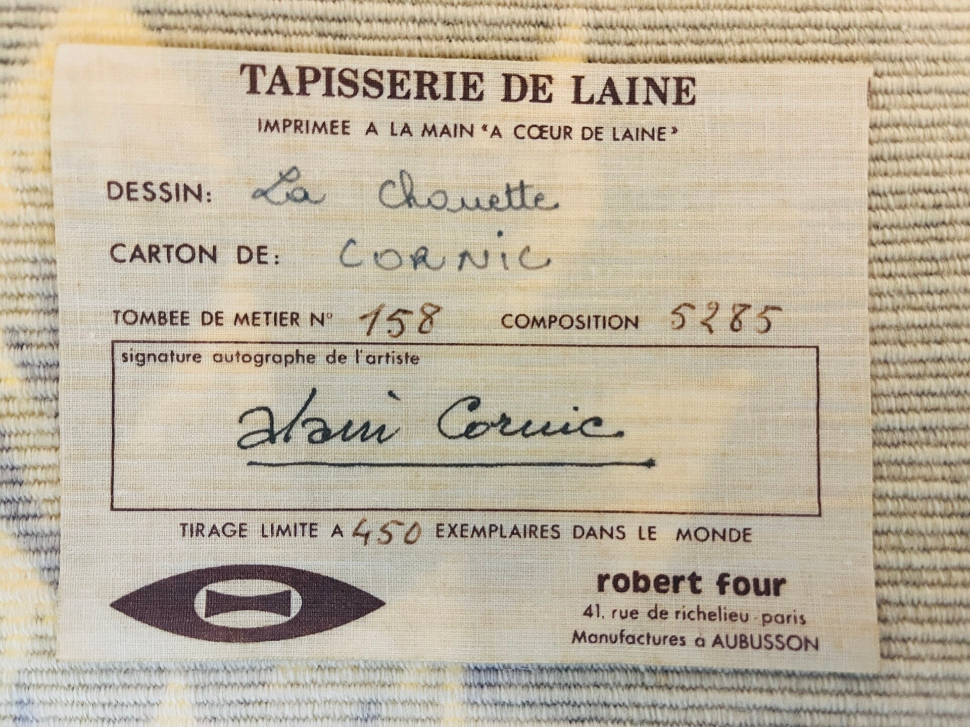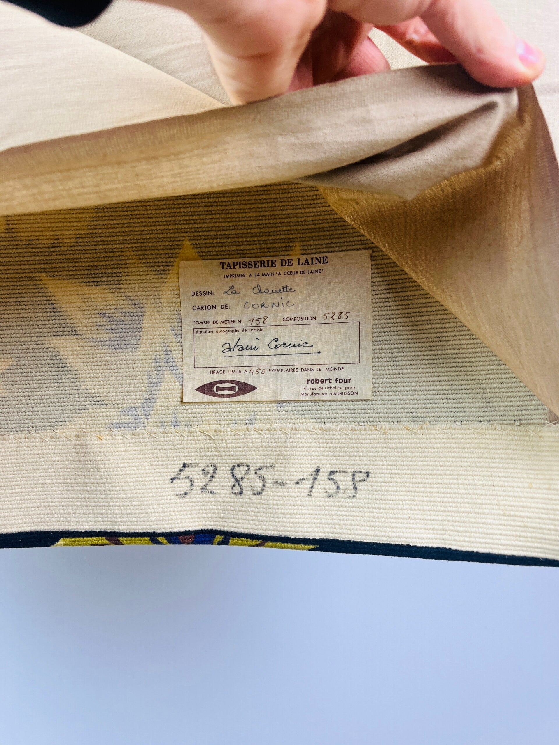 The tapestry is made entirely of wool by the French firm Robert Four from Paris, labeled at the back, numbered with the edition number and signed.