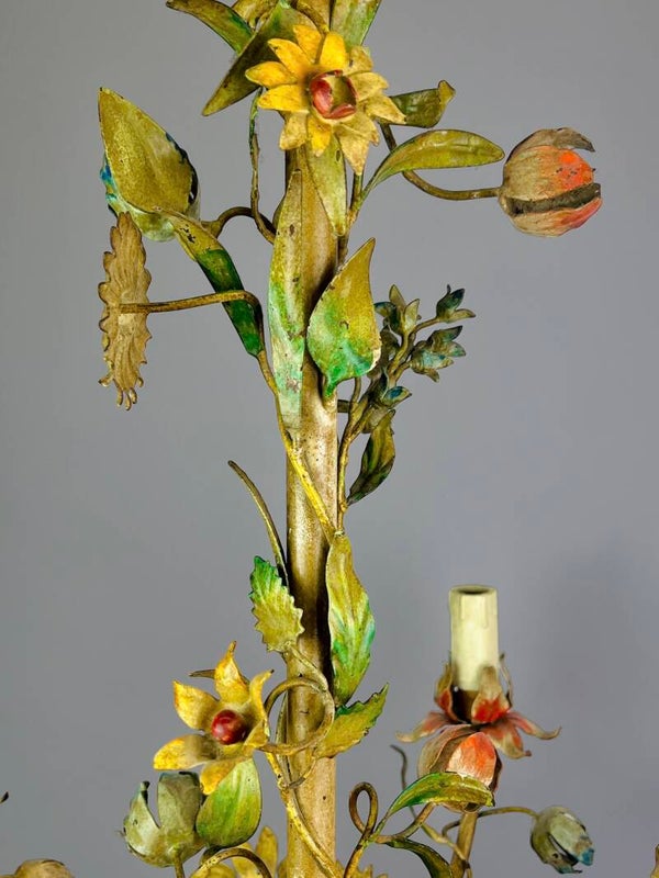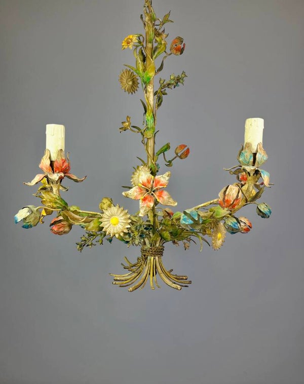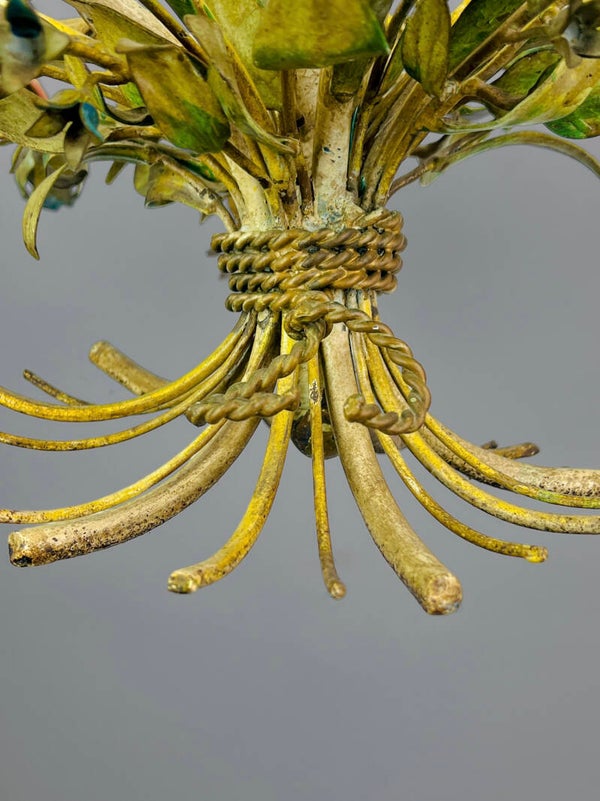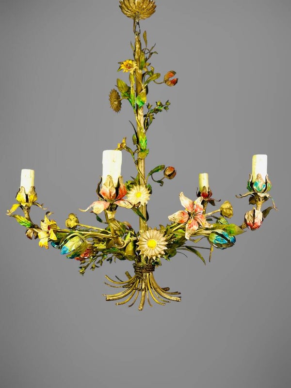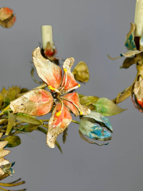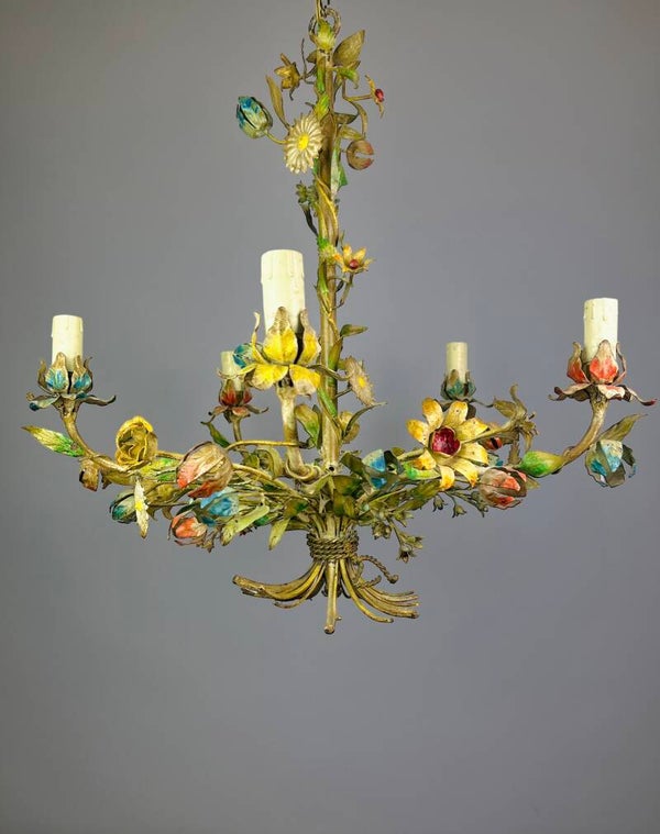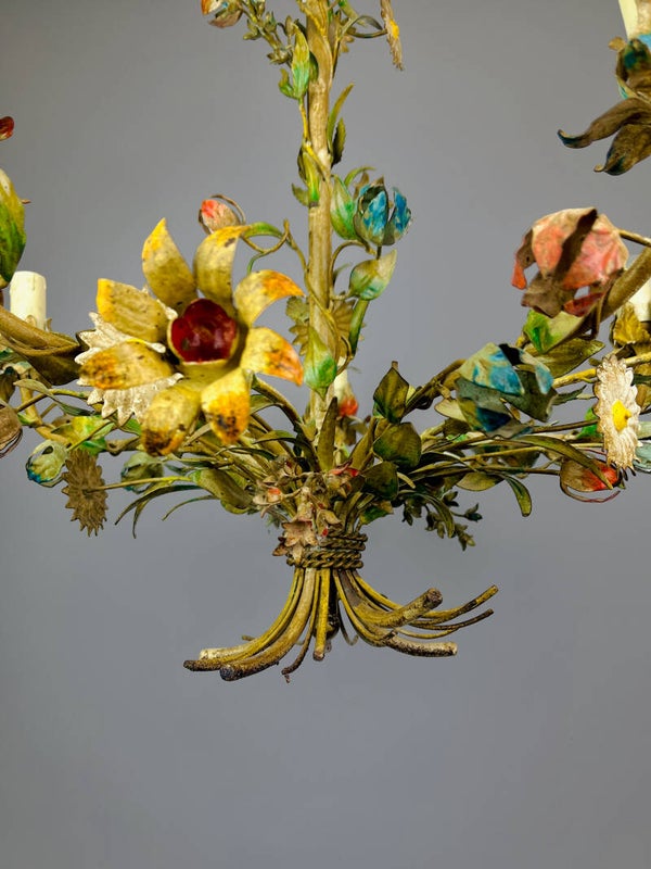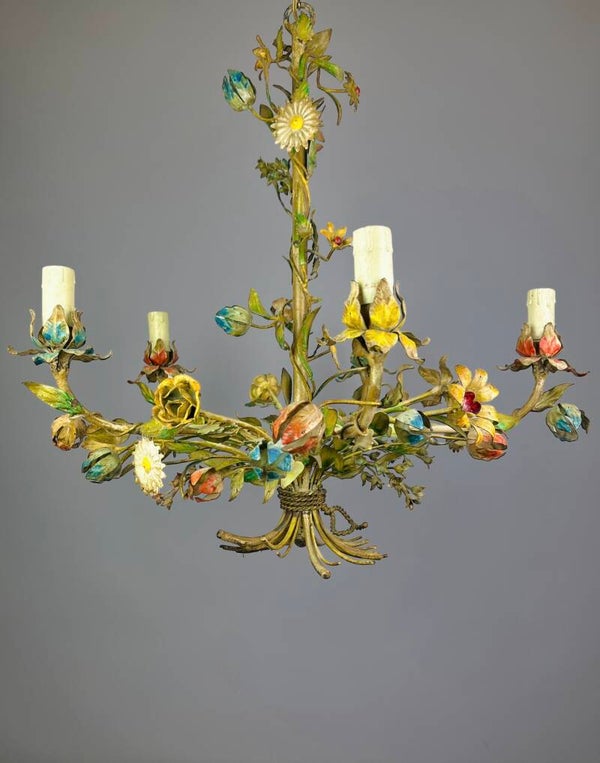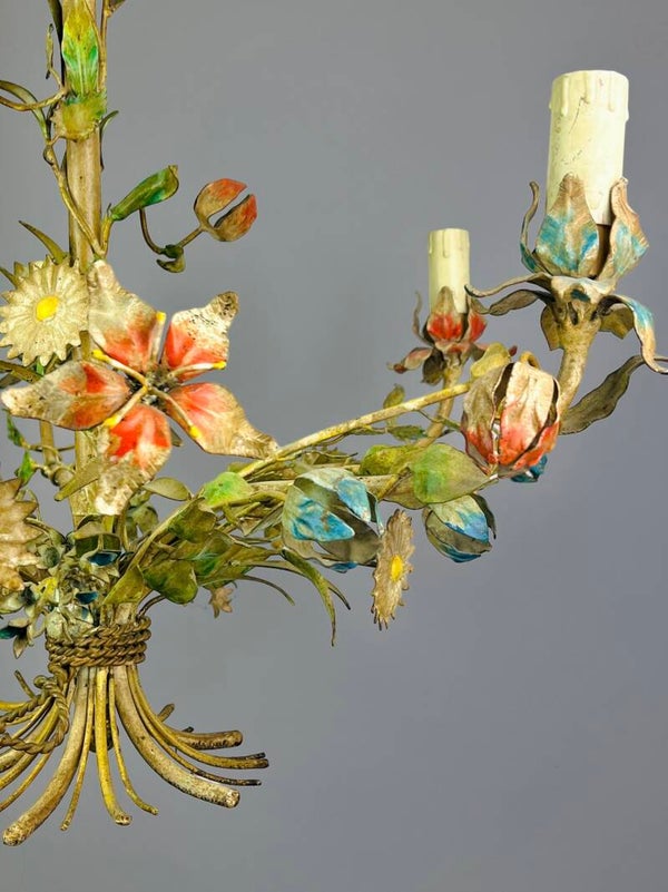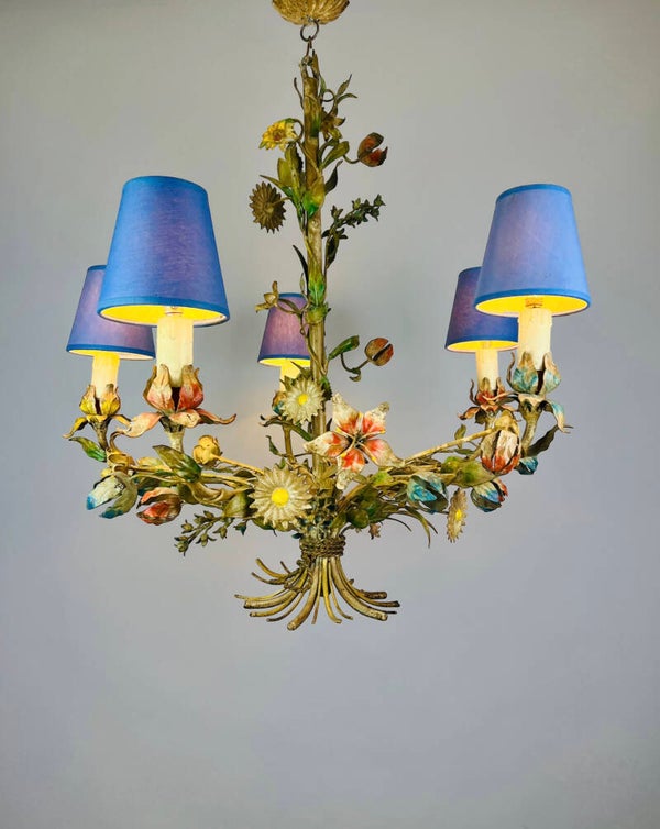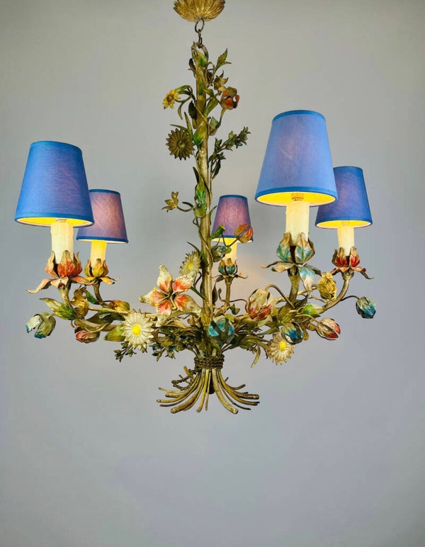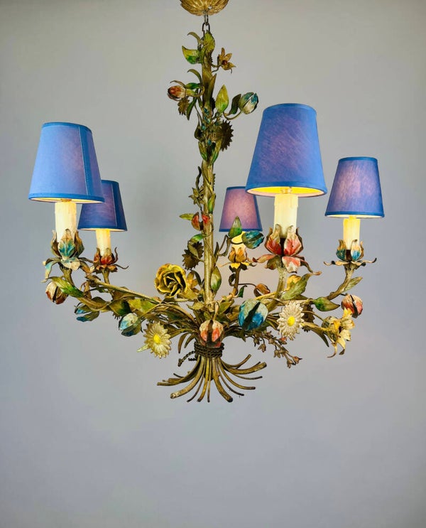Italian Tole Chandelier - 1950s - Colorful Floral Bouquet - Blue Caps