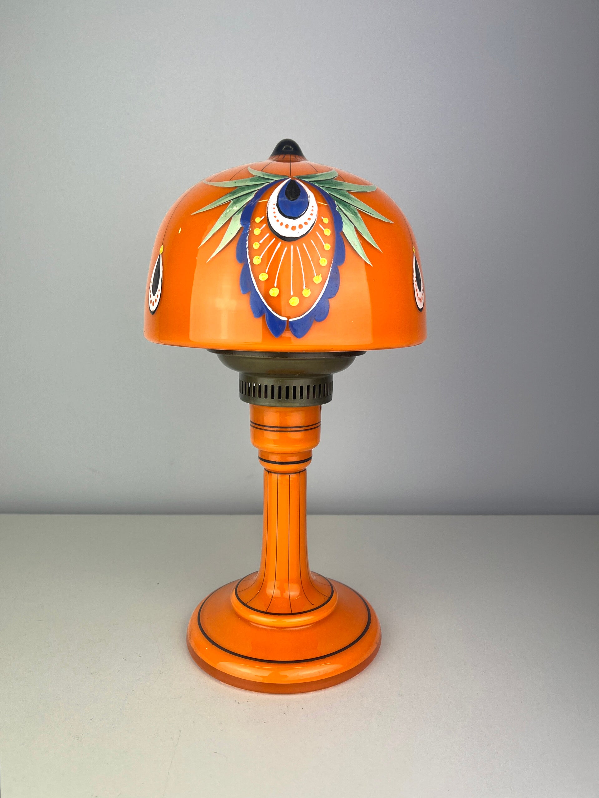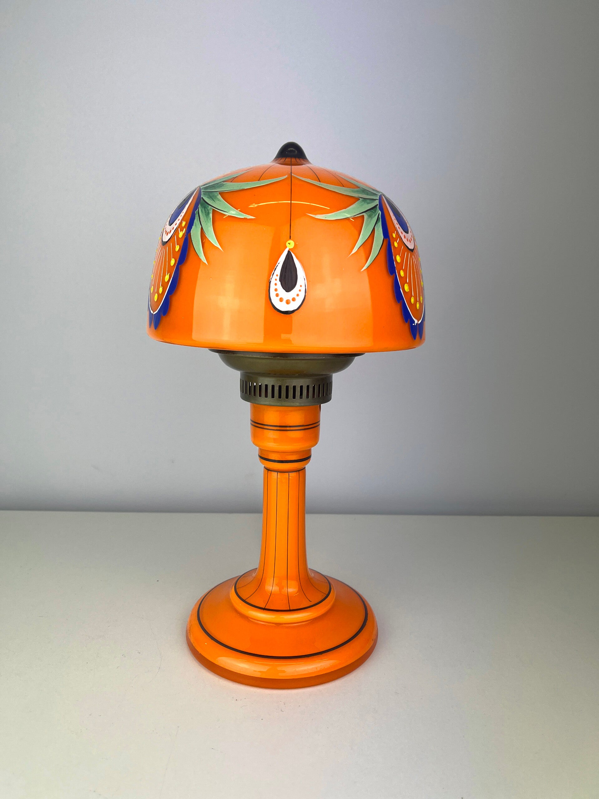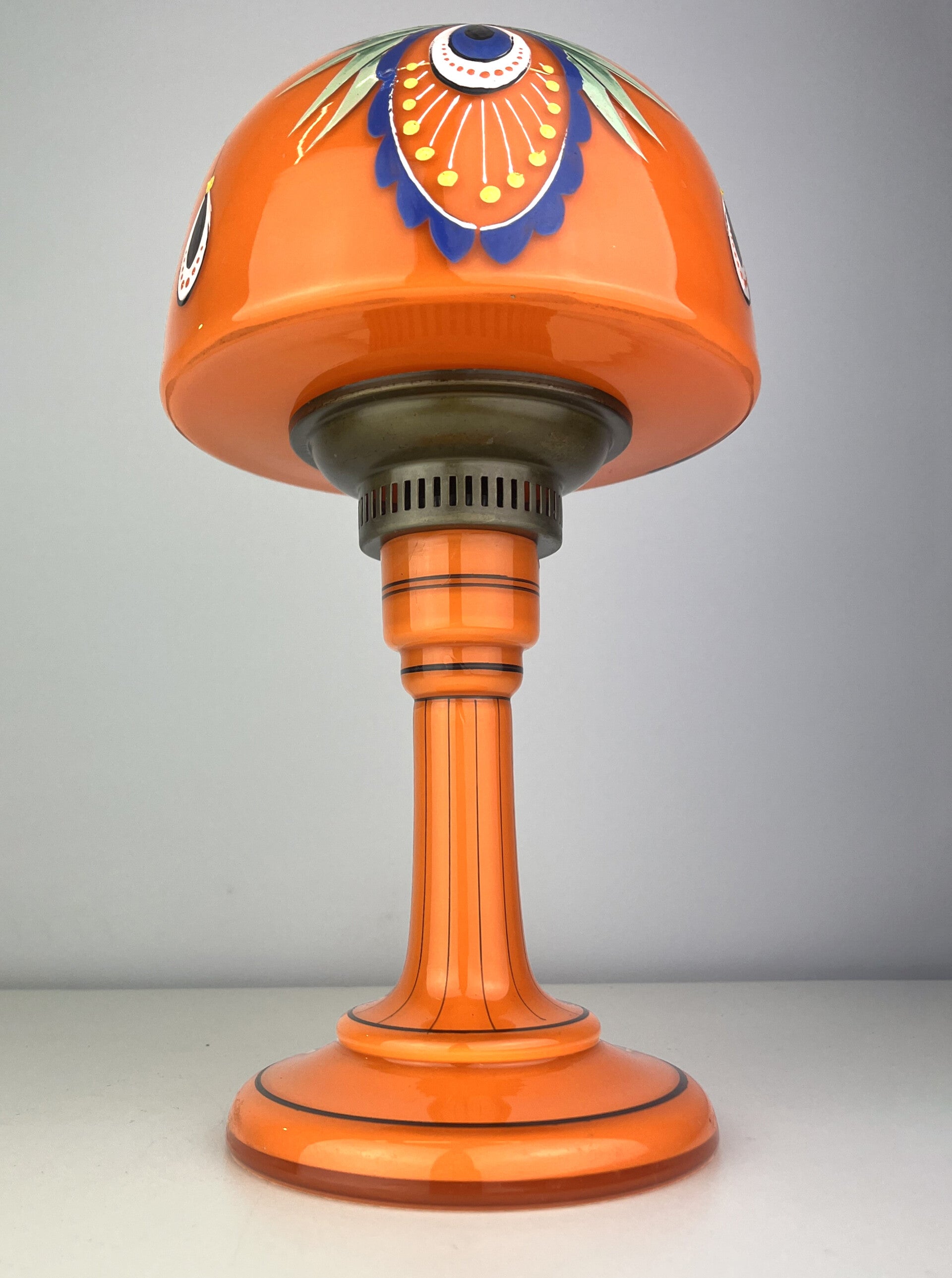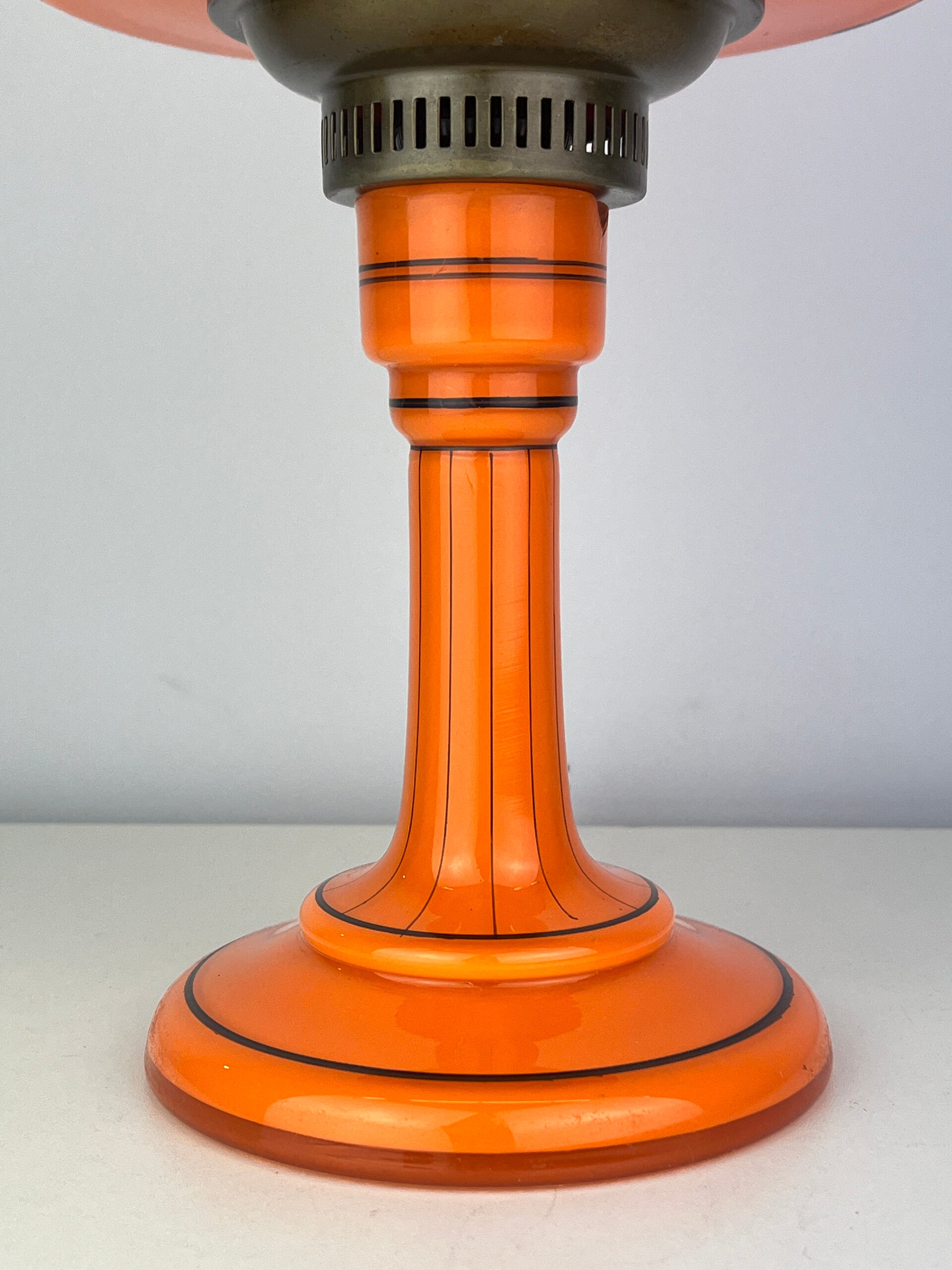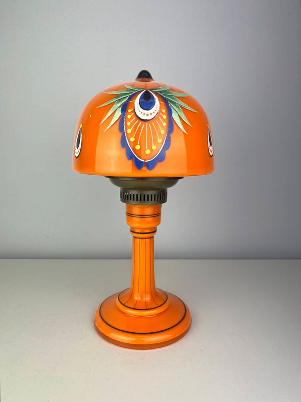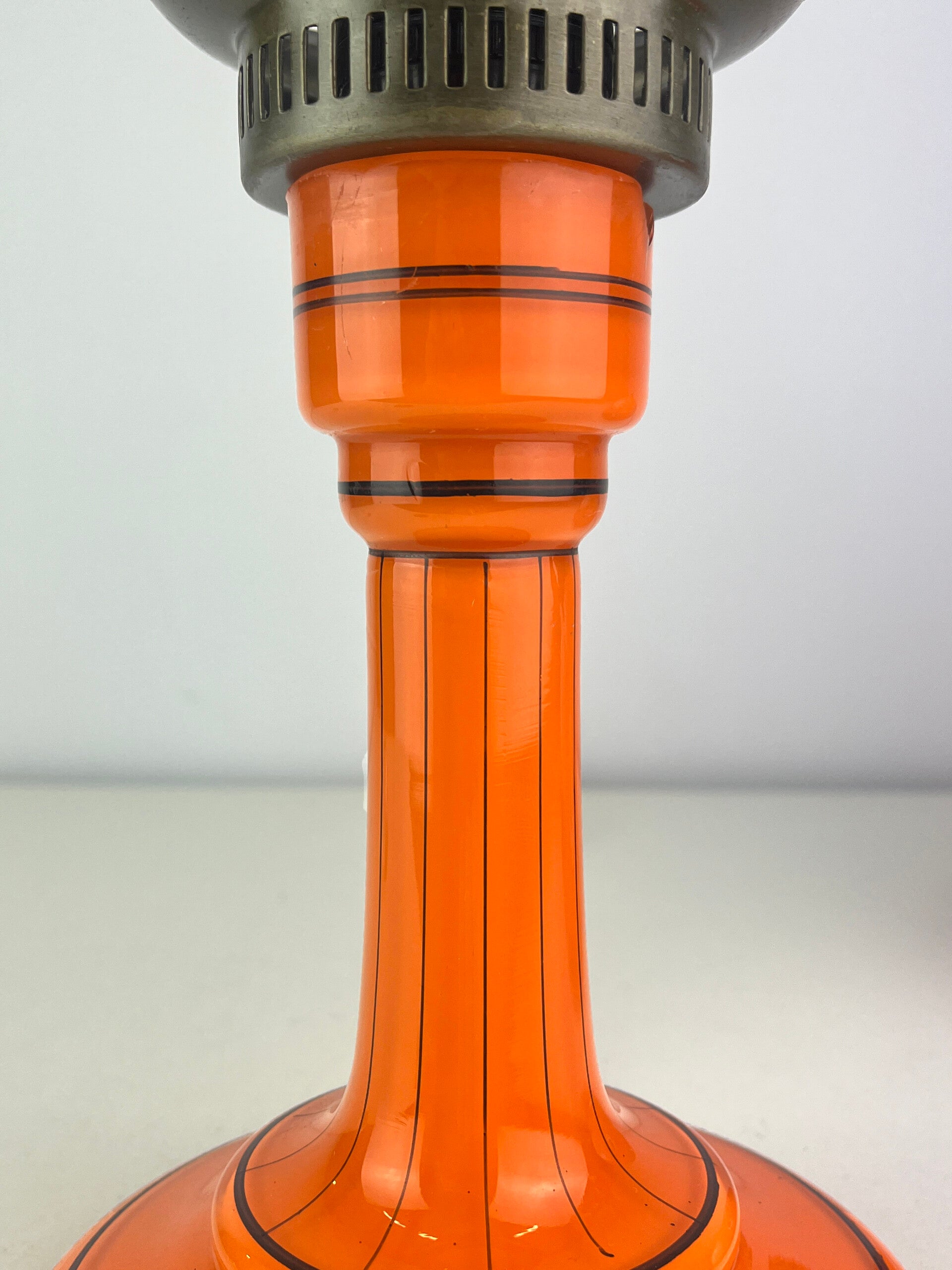 Beautifully decorated table lamp in the typical orange tango glass from the 1930s, a rare piece from the Loetz glass factory.