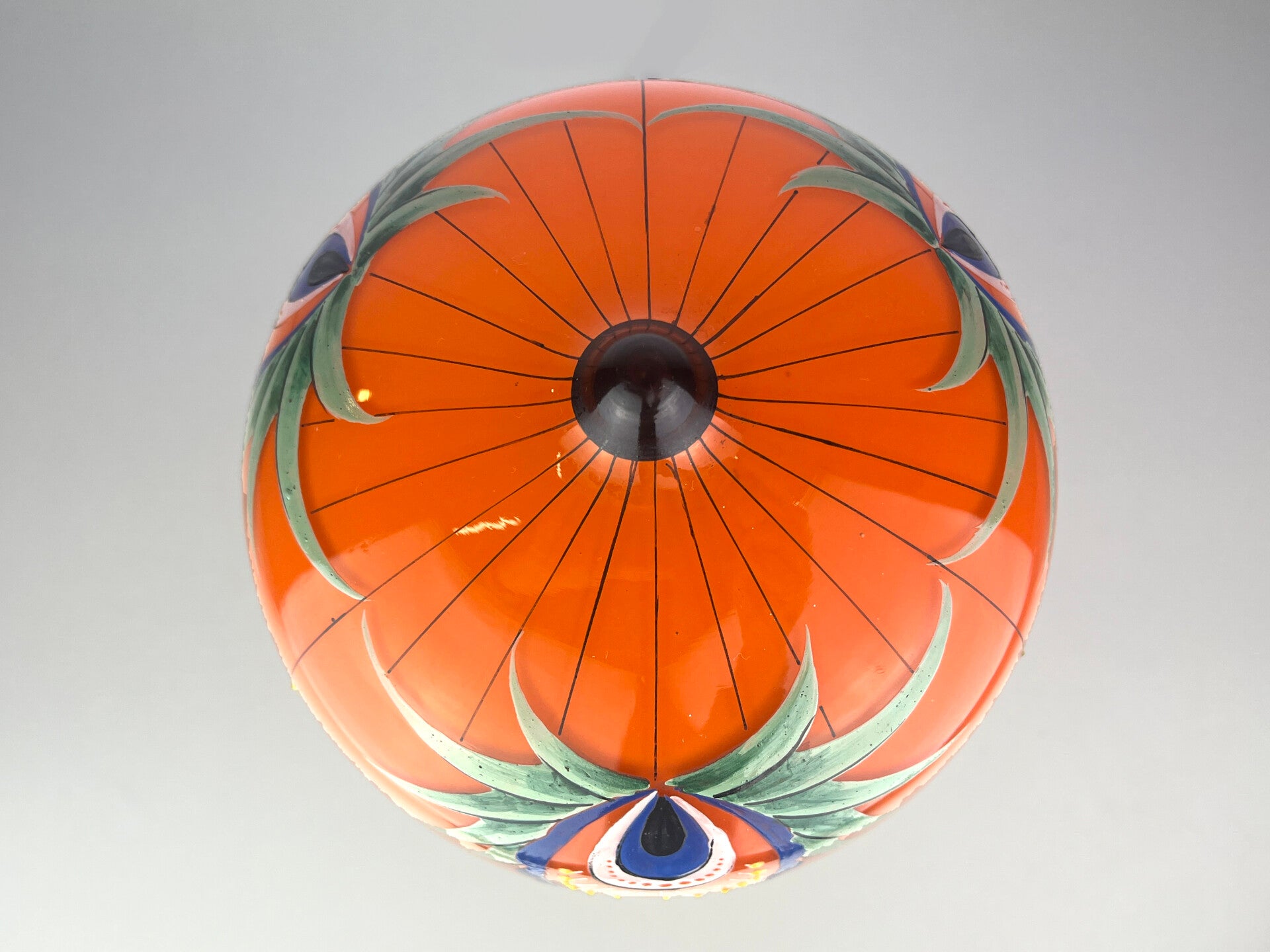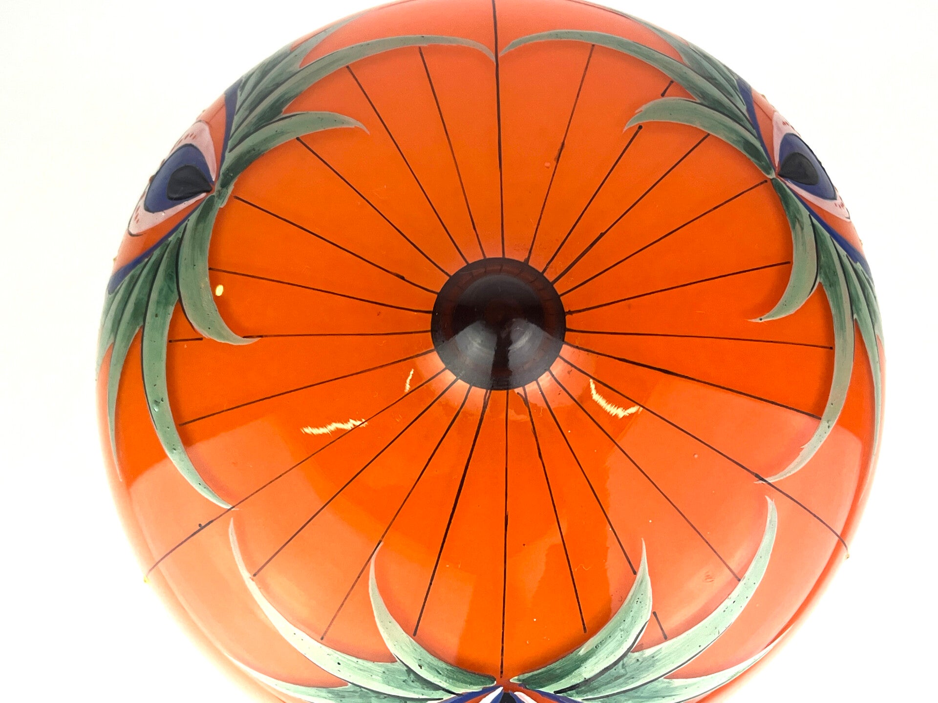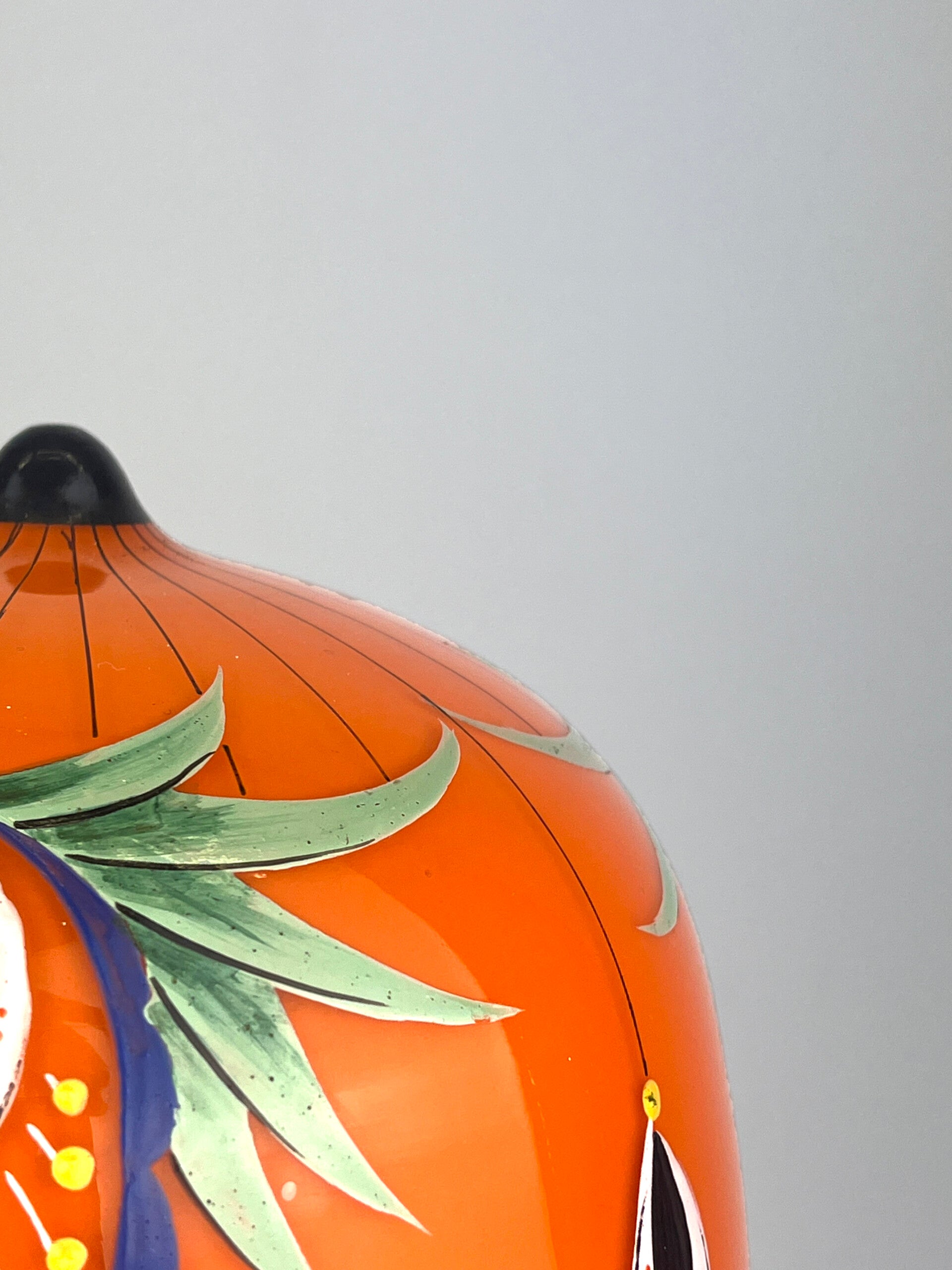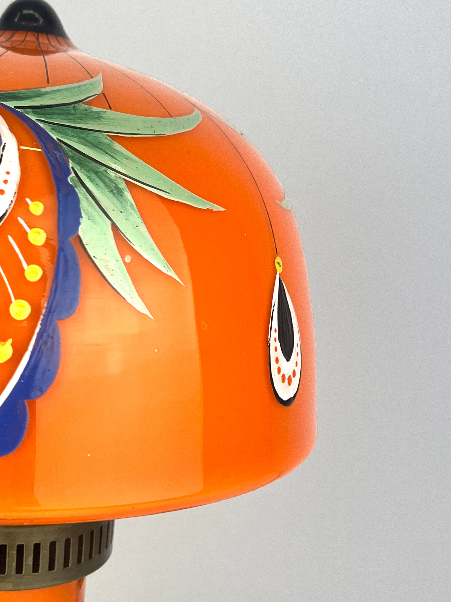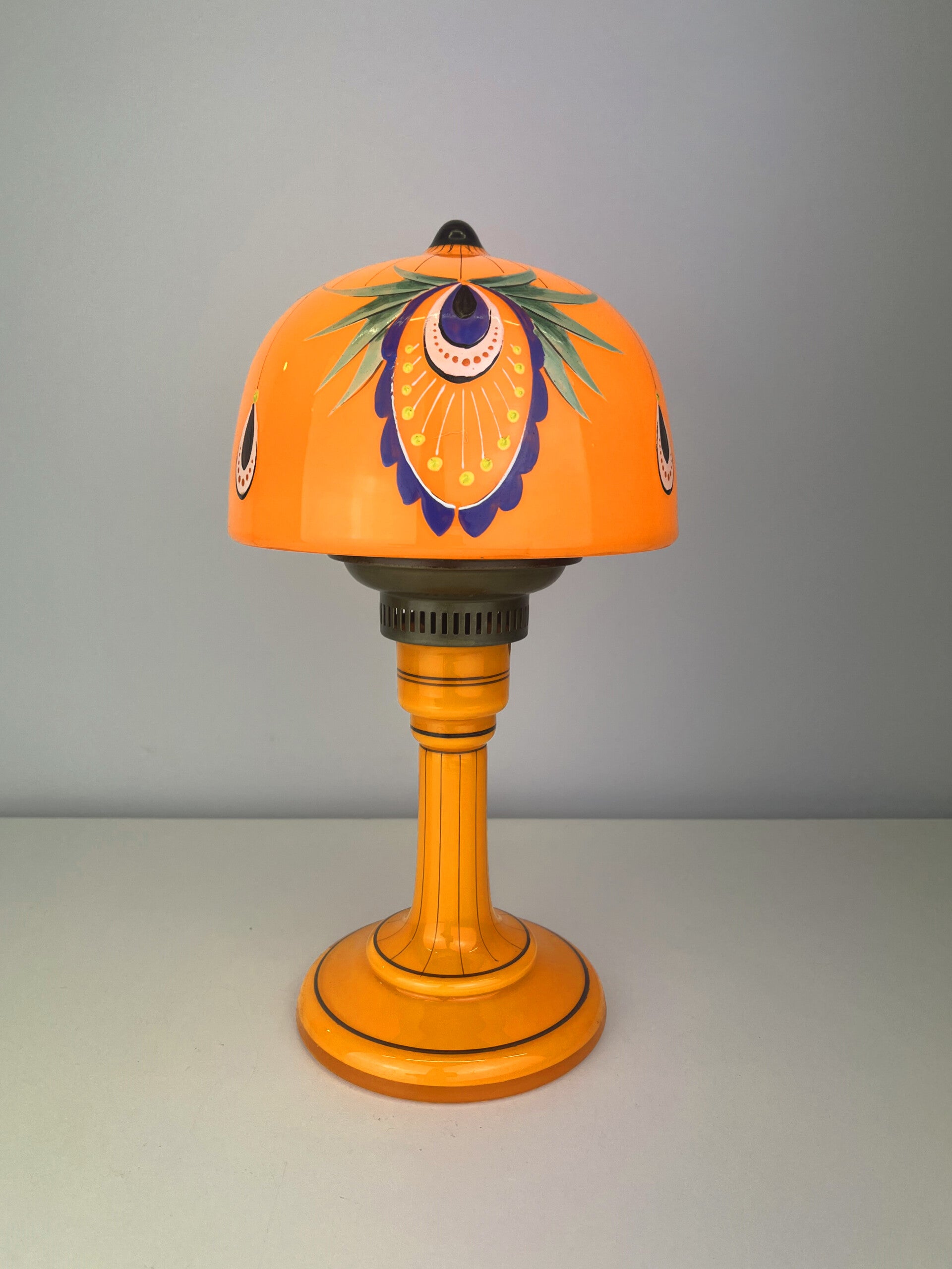 Beautifully decorated table lamp in the typical orange tango glass from the 1930s, a rare piece from the Loetz glass factory.