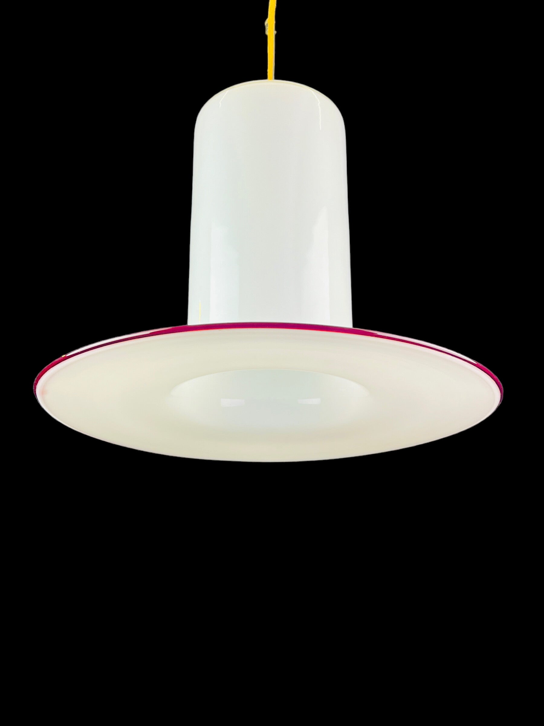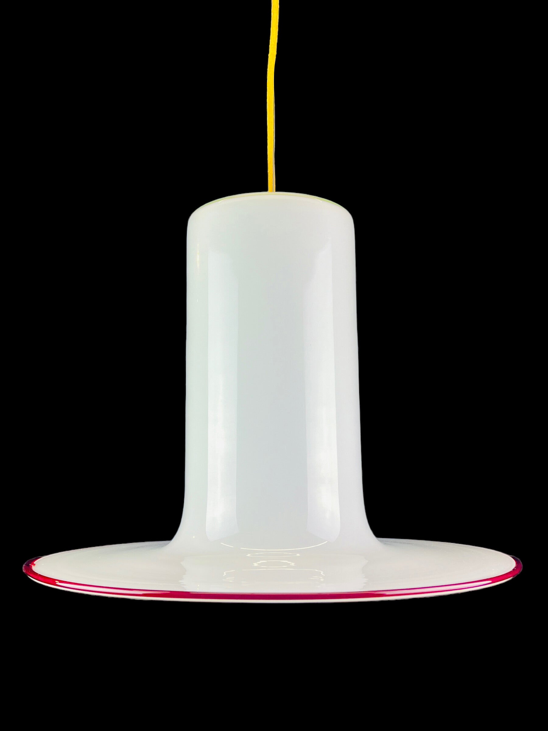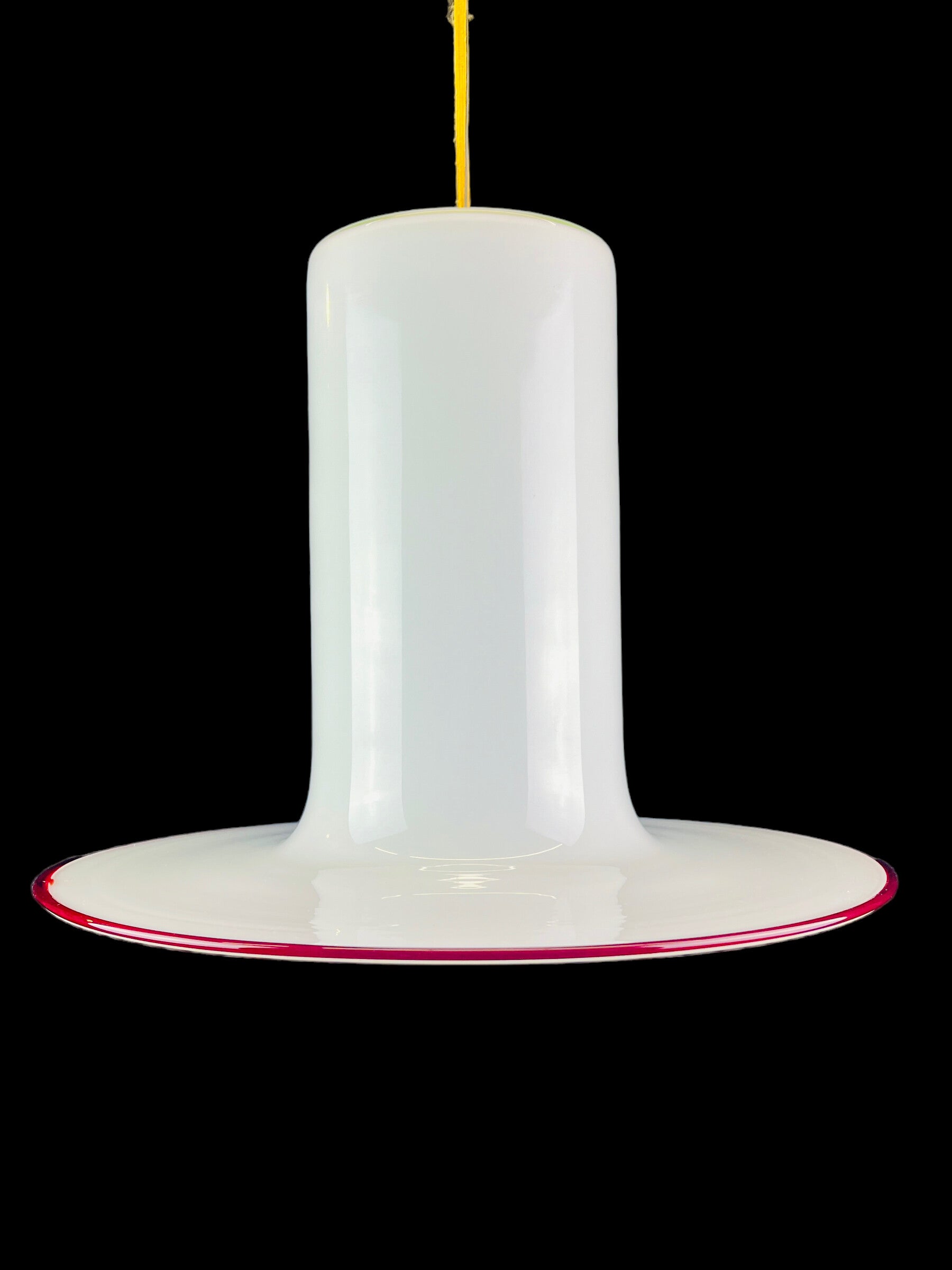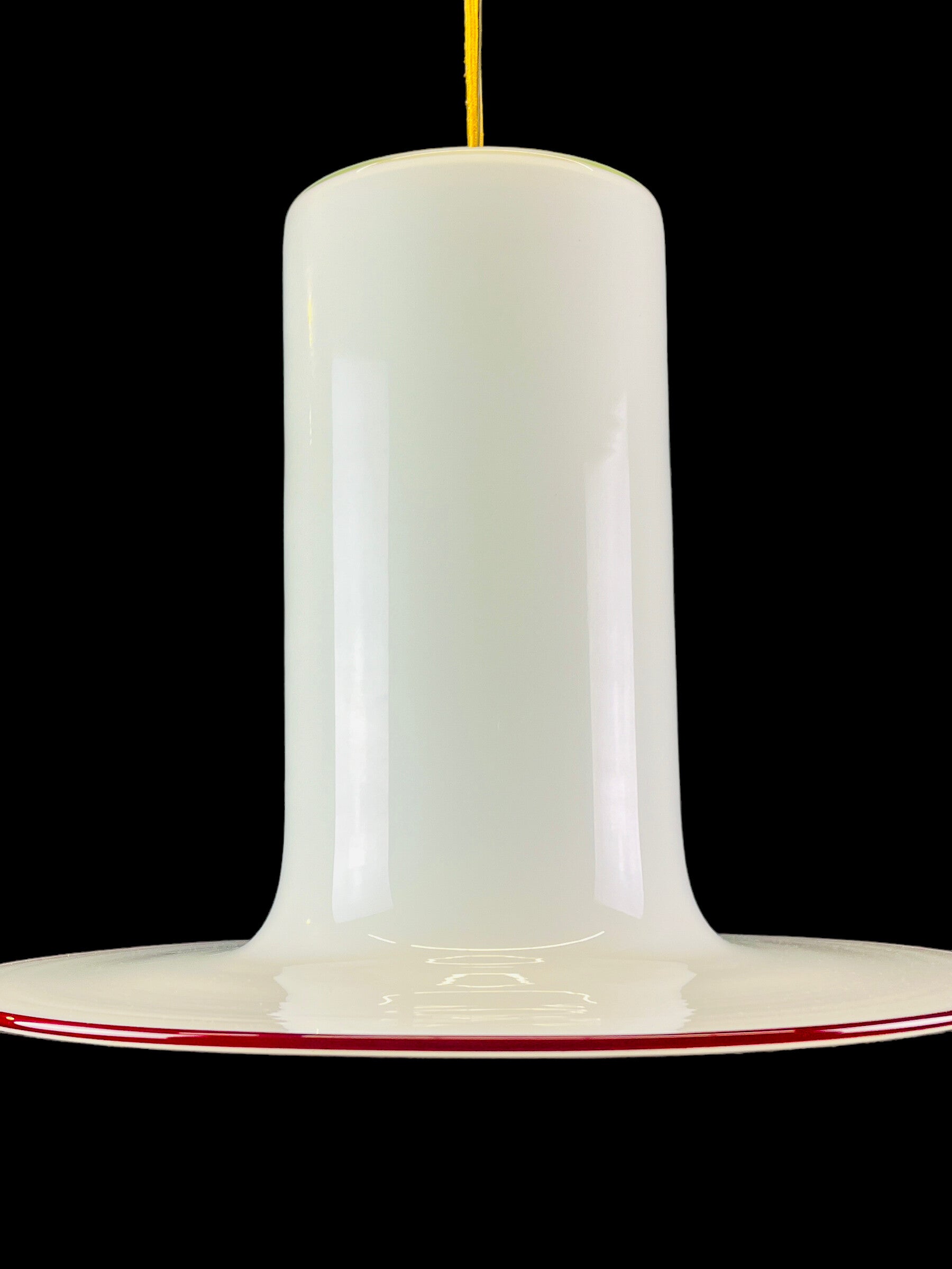 Unique 1960s Vistosi white murano hanging lamp with a red murano wire line. Designed by Alessandro Pianon.