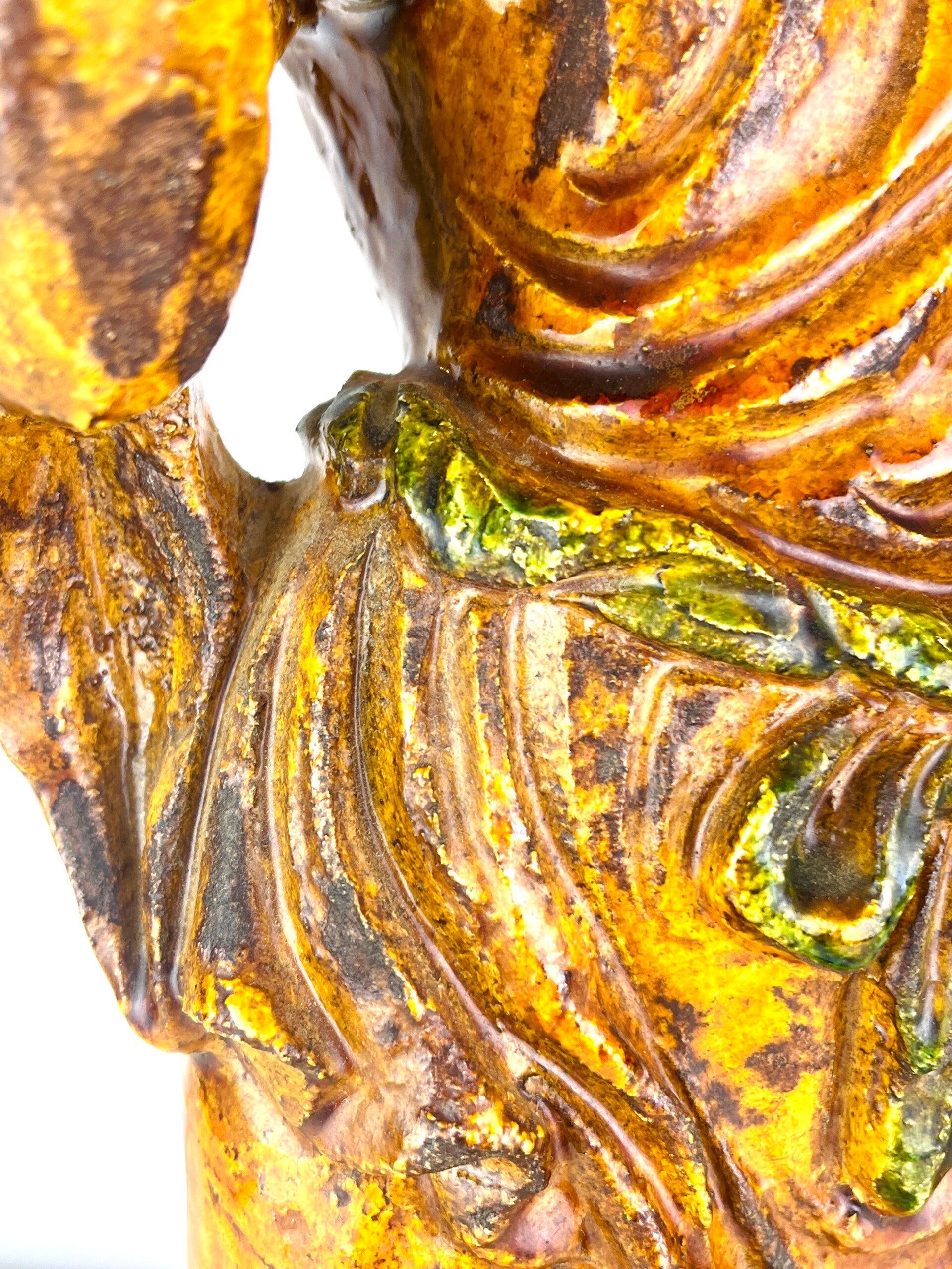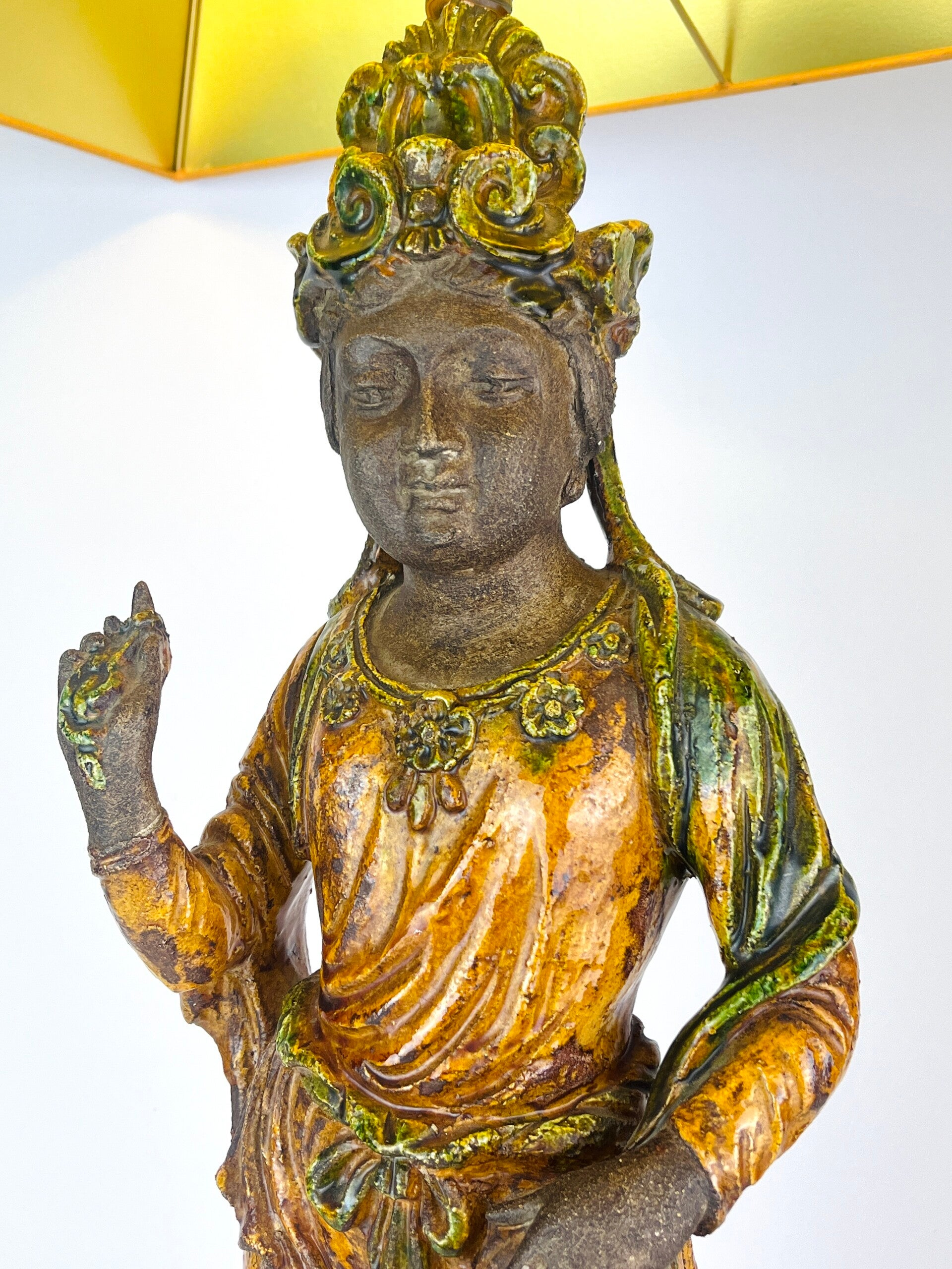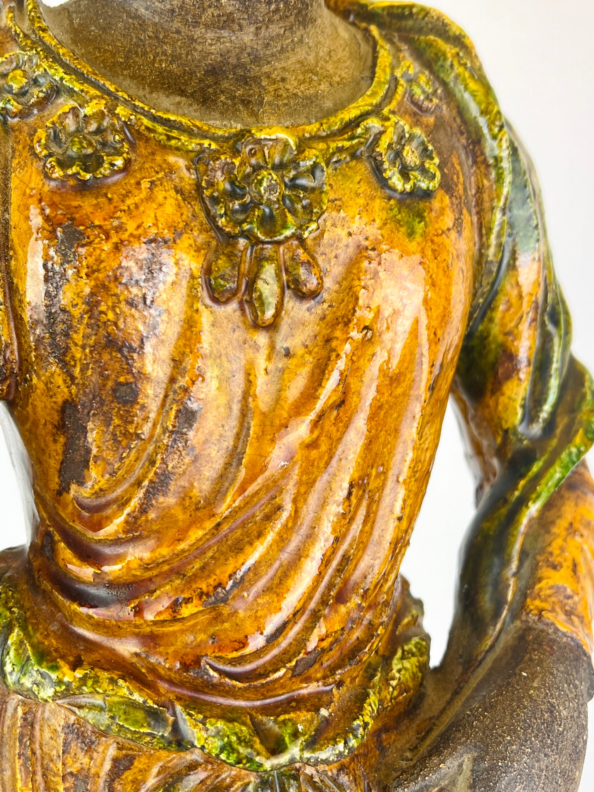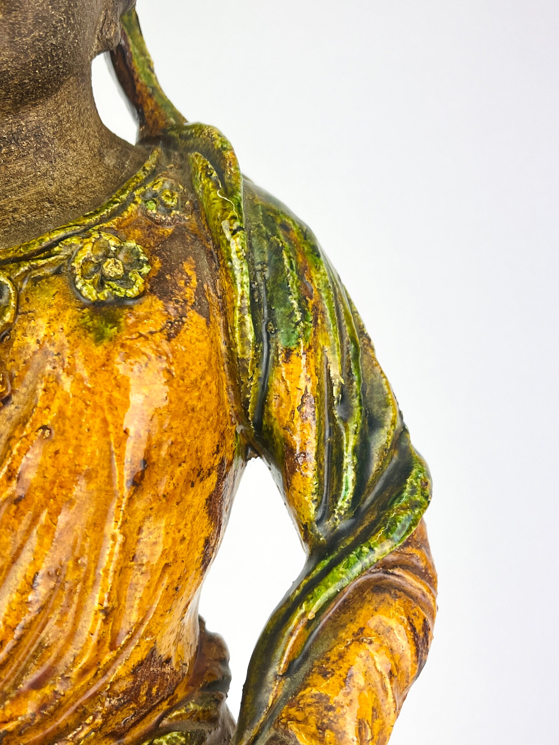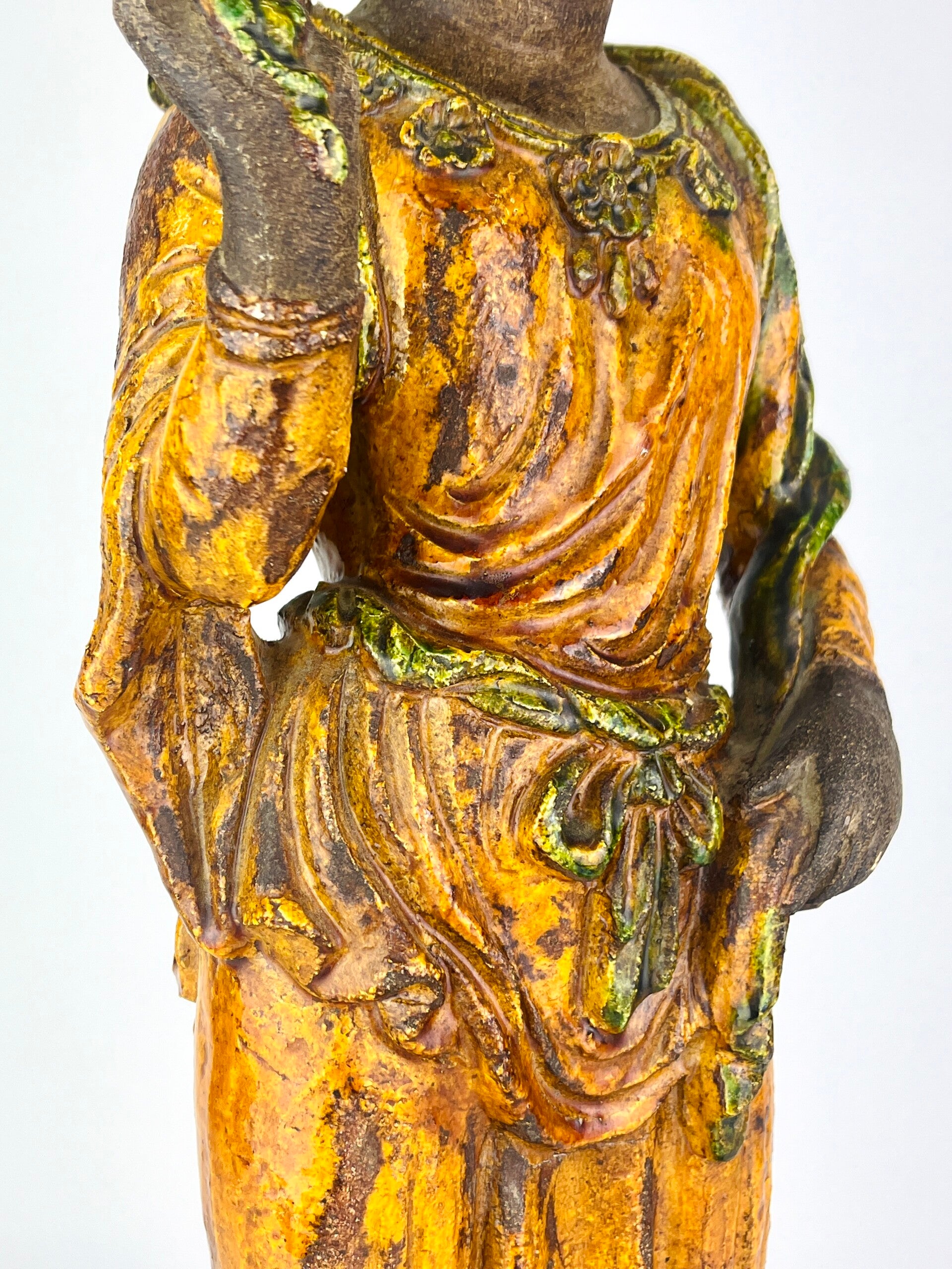 Beautiful large Guanyin in Sancia-Glazed stoneware from the 19th century. Exceptional glaze colours, orange dress with green tones, very rare. Similar pieces are very difficult to find.