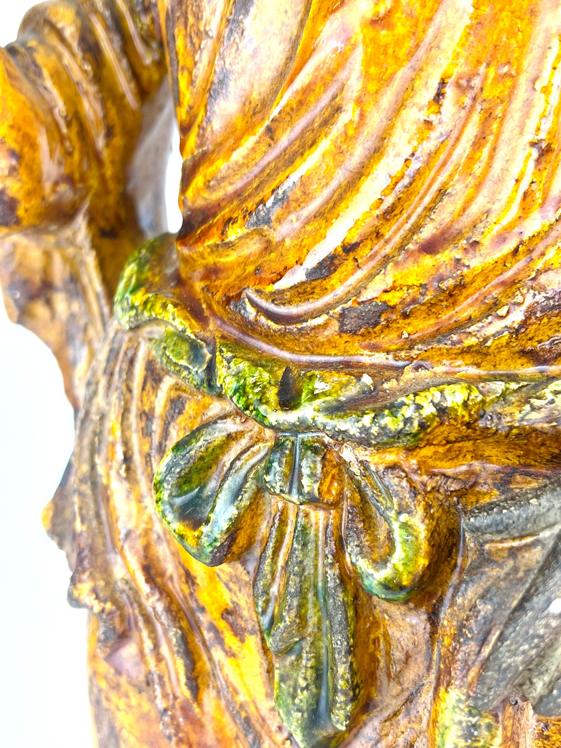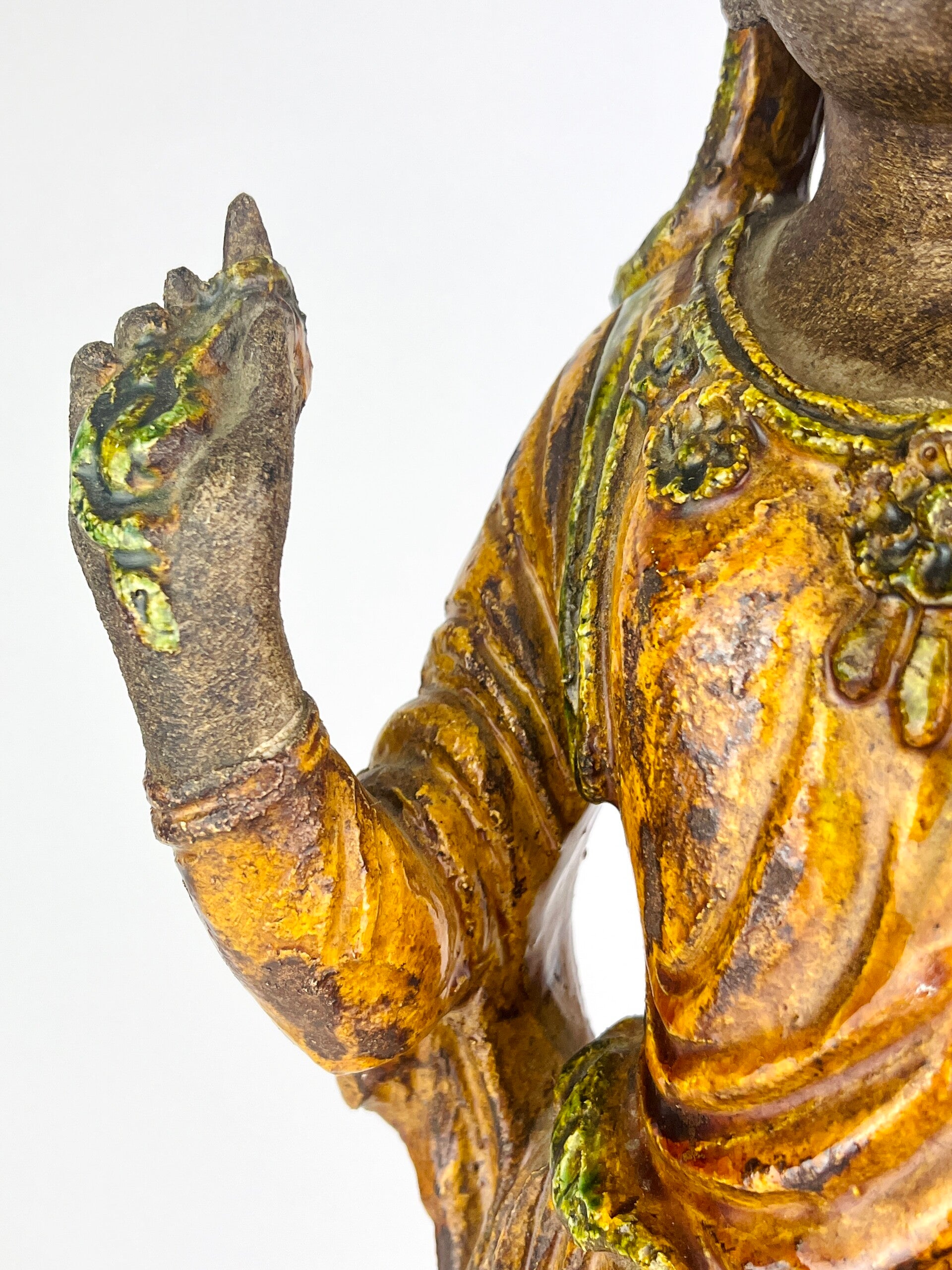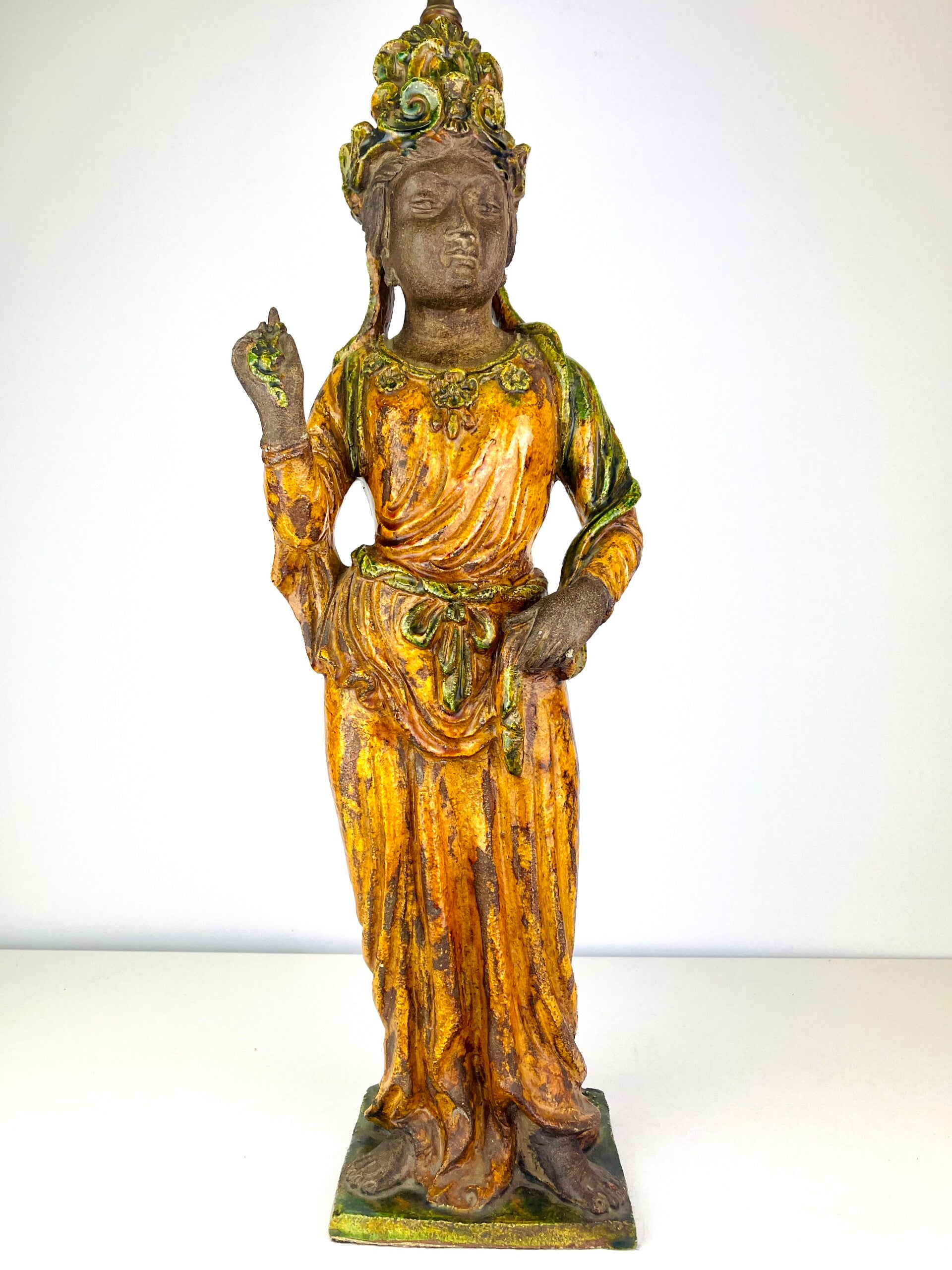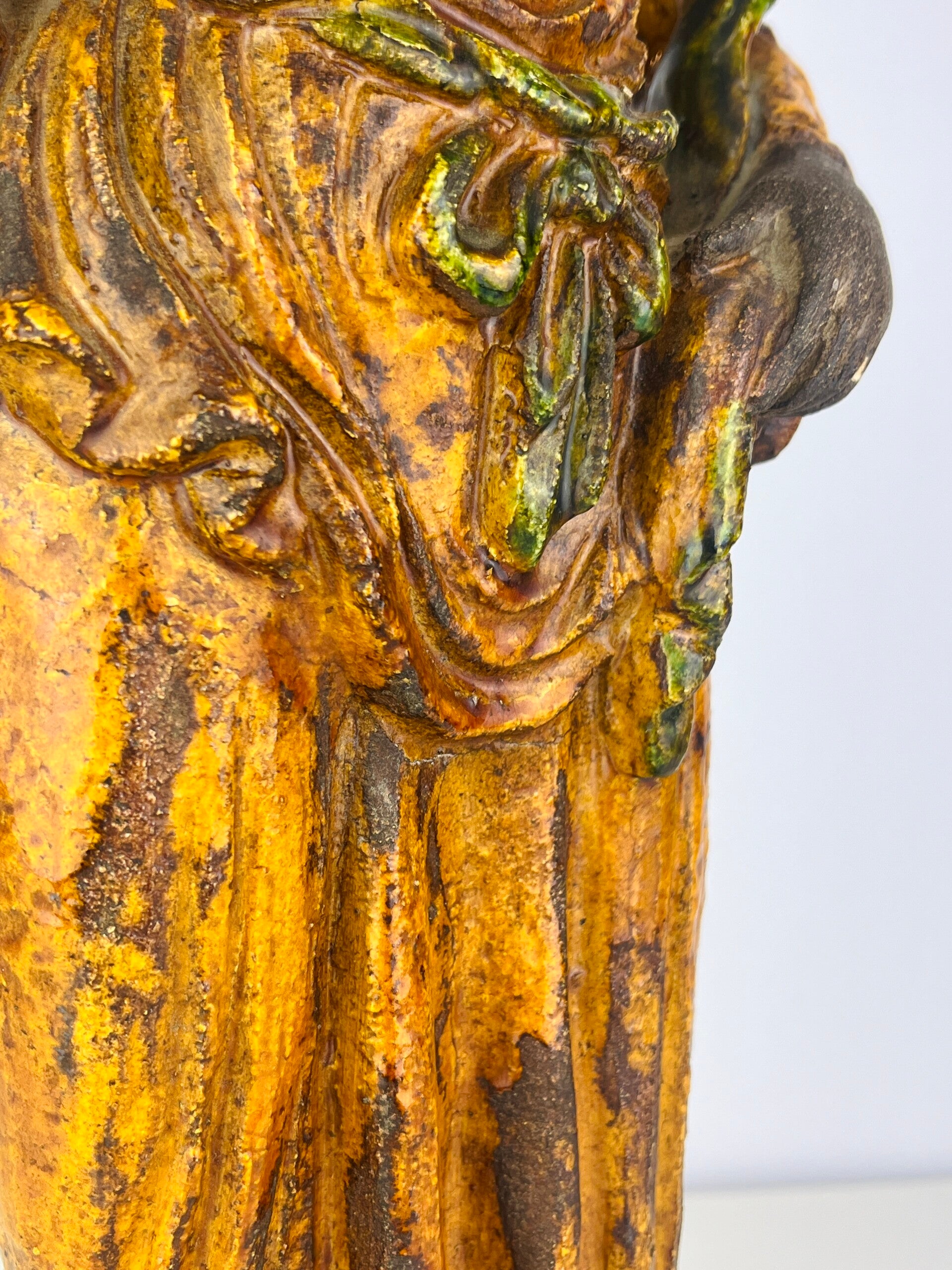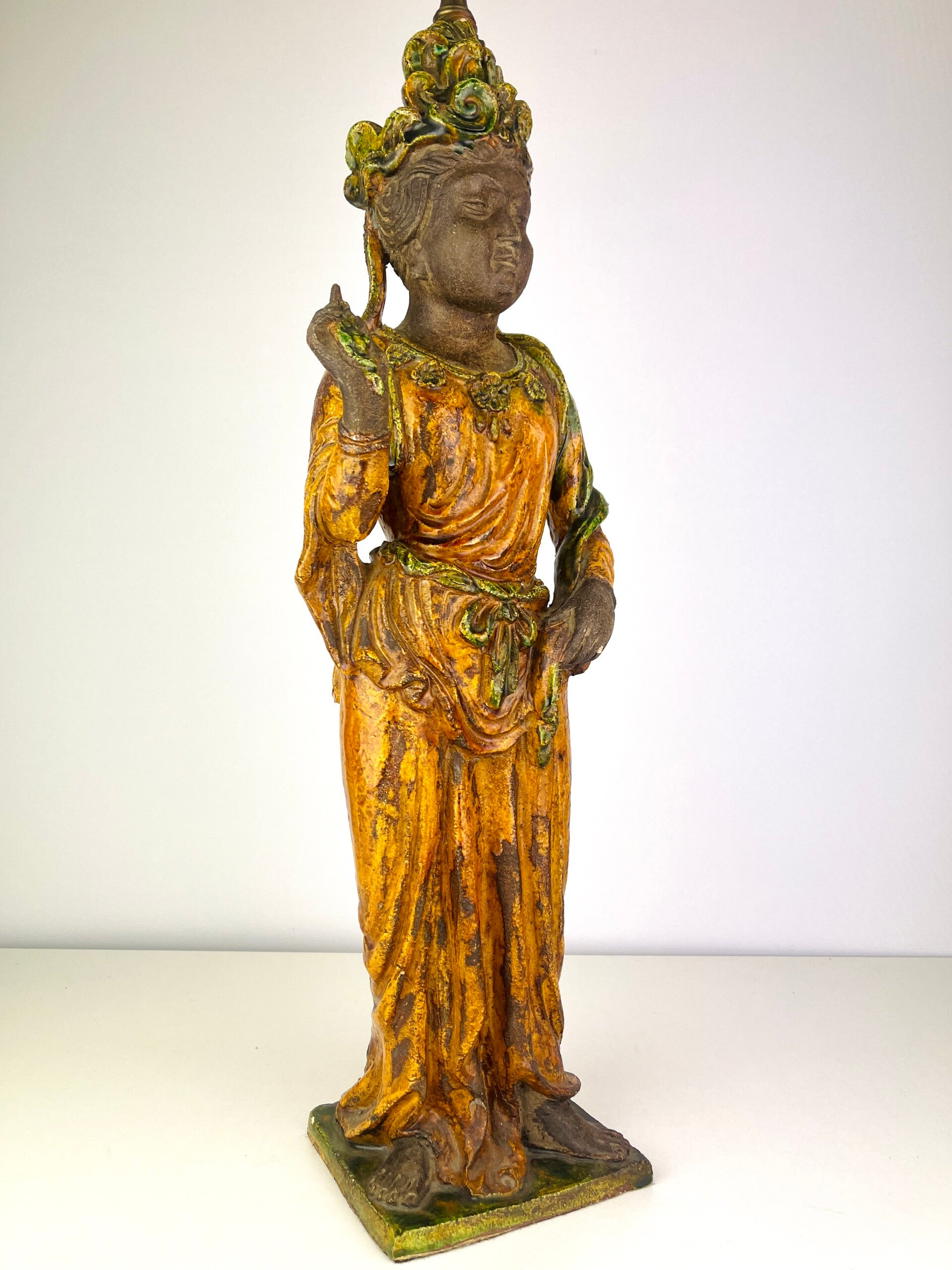 Beautiful large Guanyin in Sancia-Glazed stoneware from the 19th century. Exceptional glaze colours, orange dress with green tones, very rare. Similar pieces are very difficult to find.