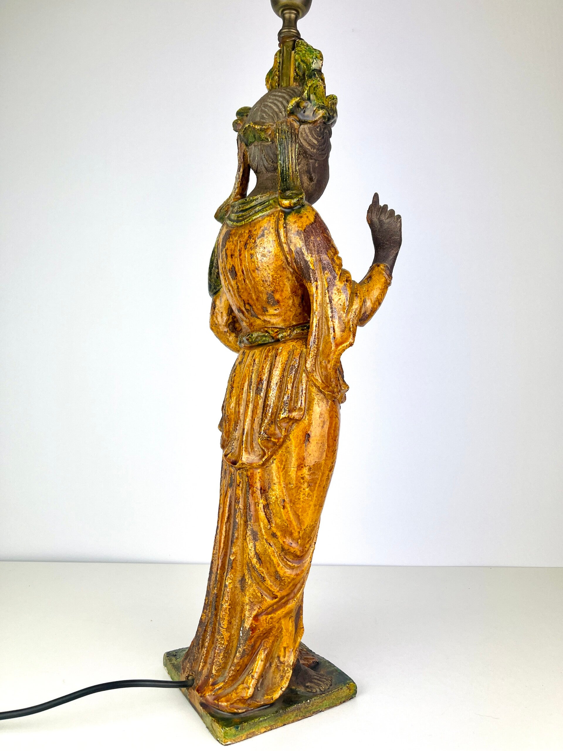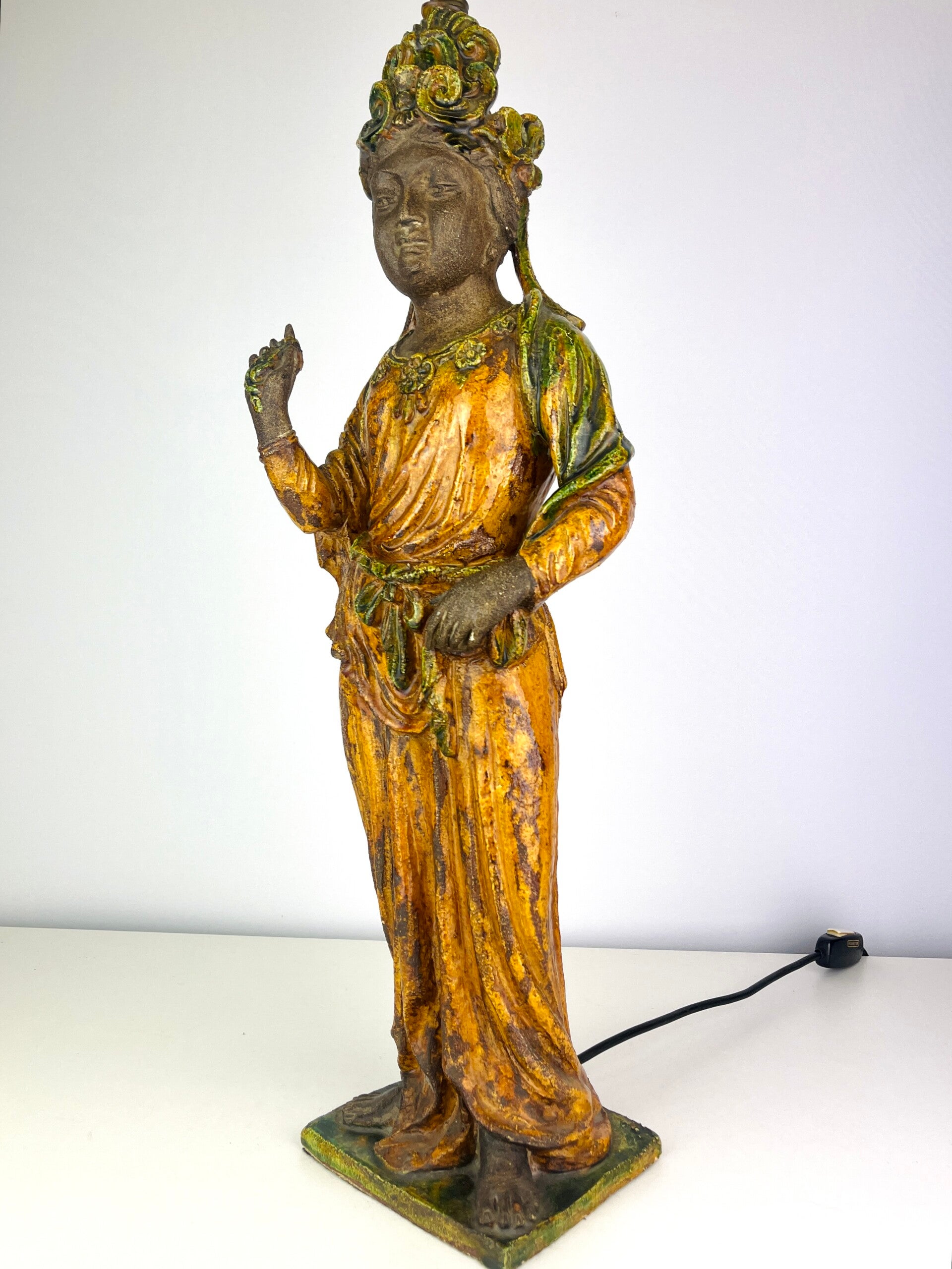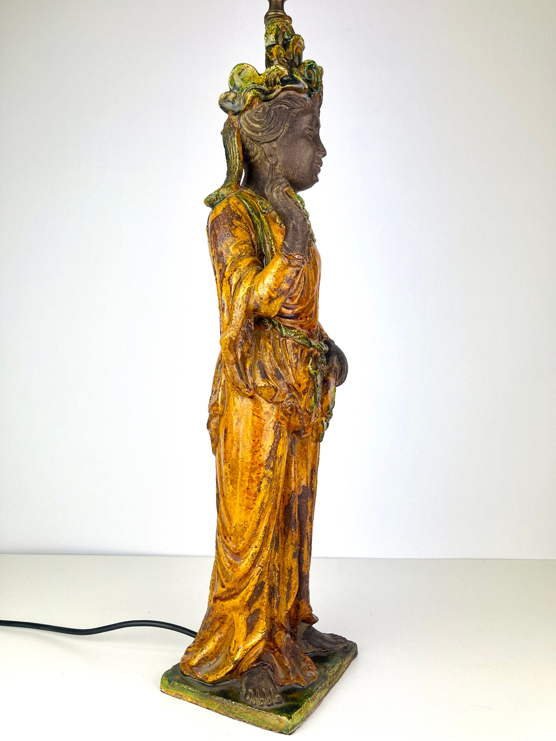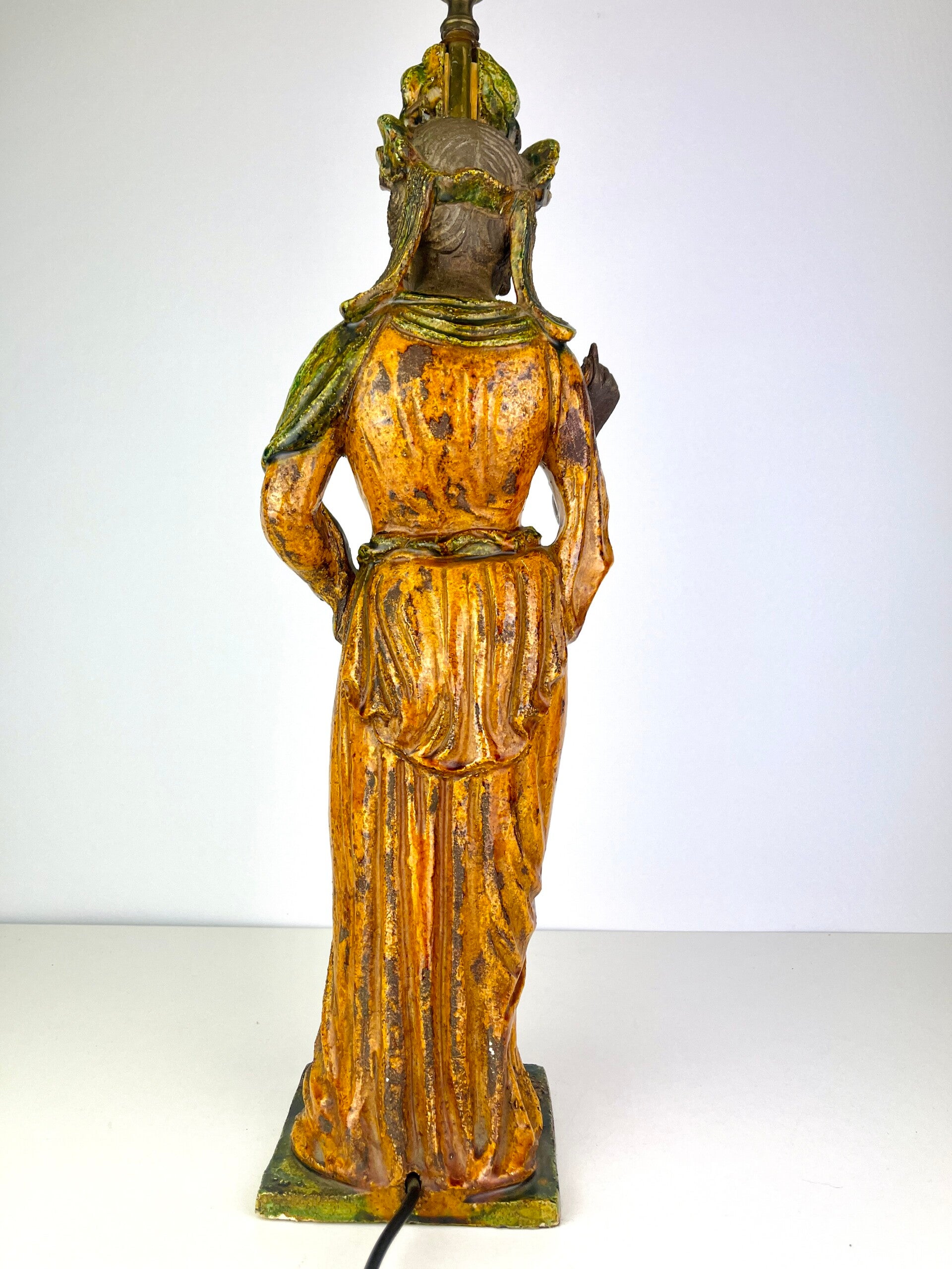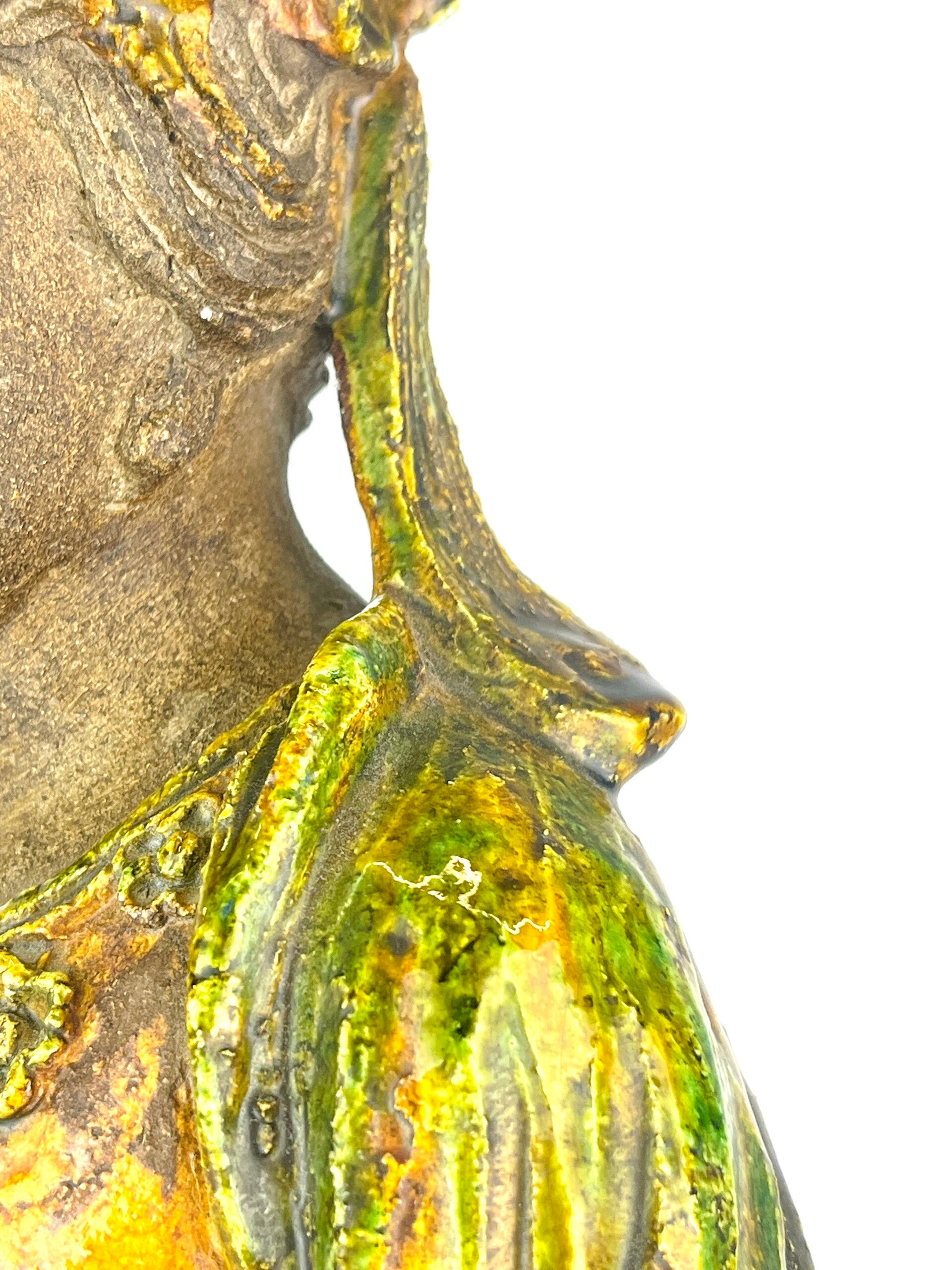 Beautiful large Guanyin in Sancia-Glazed stoneware from the 19th century. Exceptional glaze colours, orange dress with green tones, very rare. Similar pieces are very difficult to find.