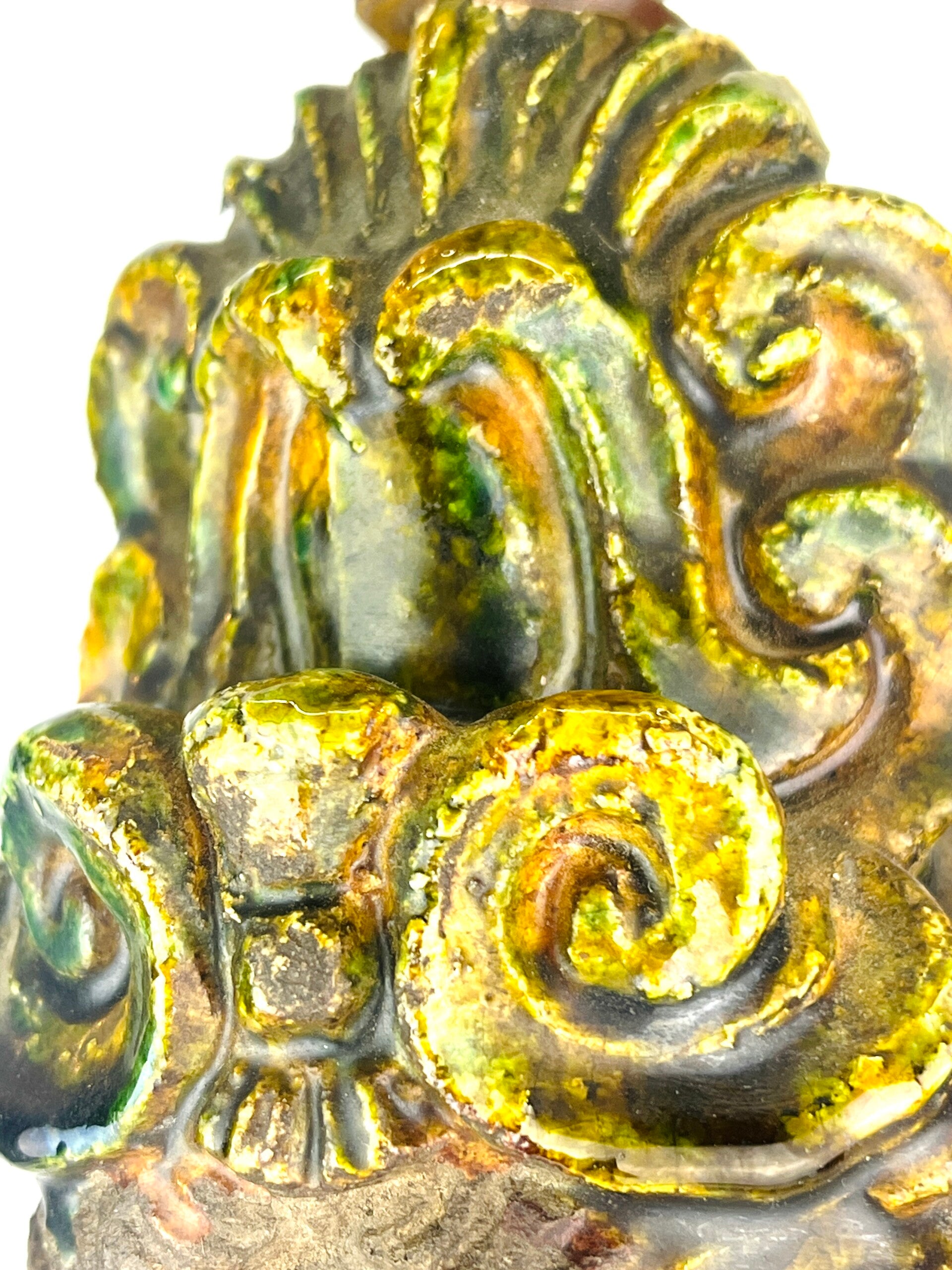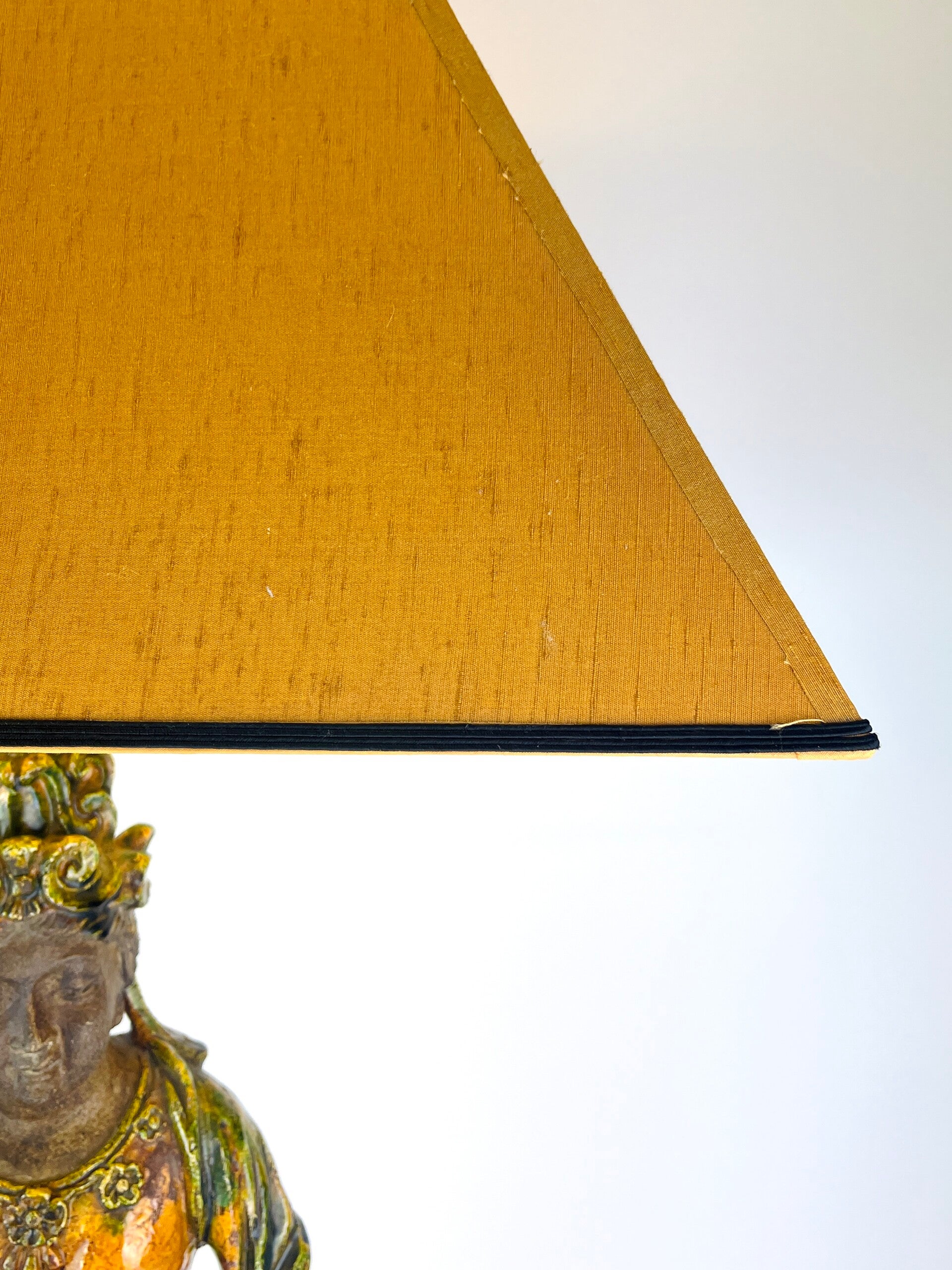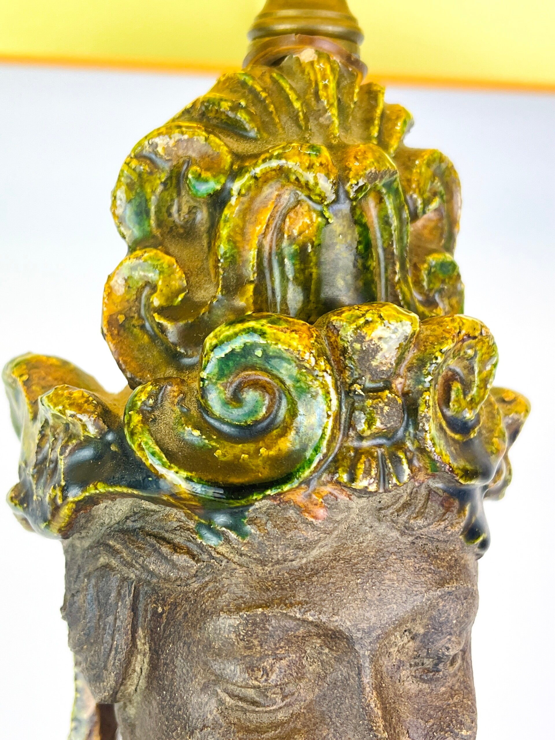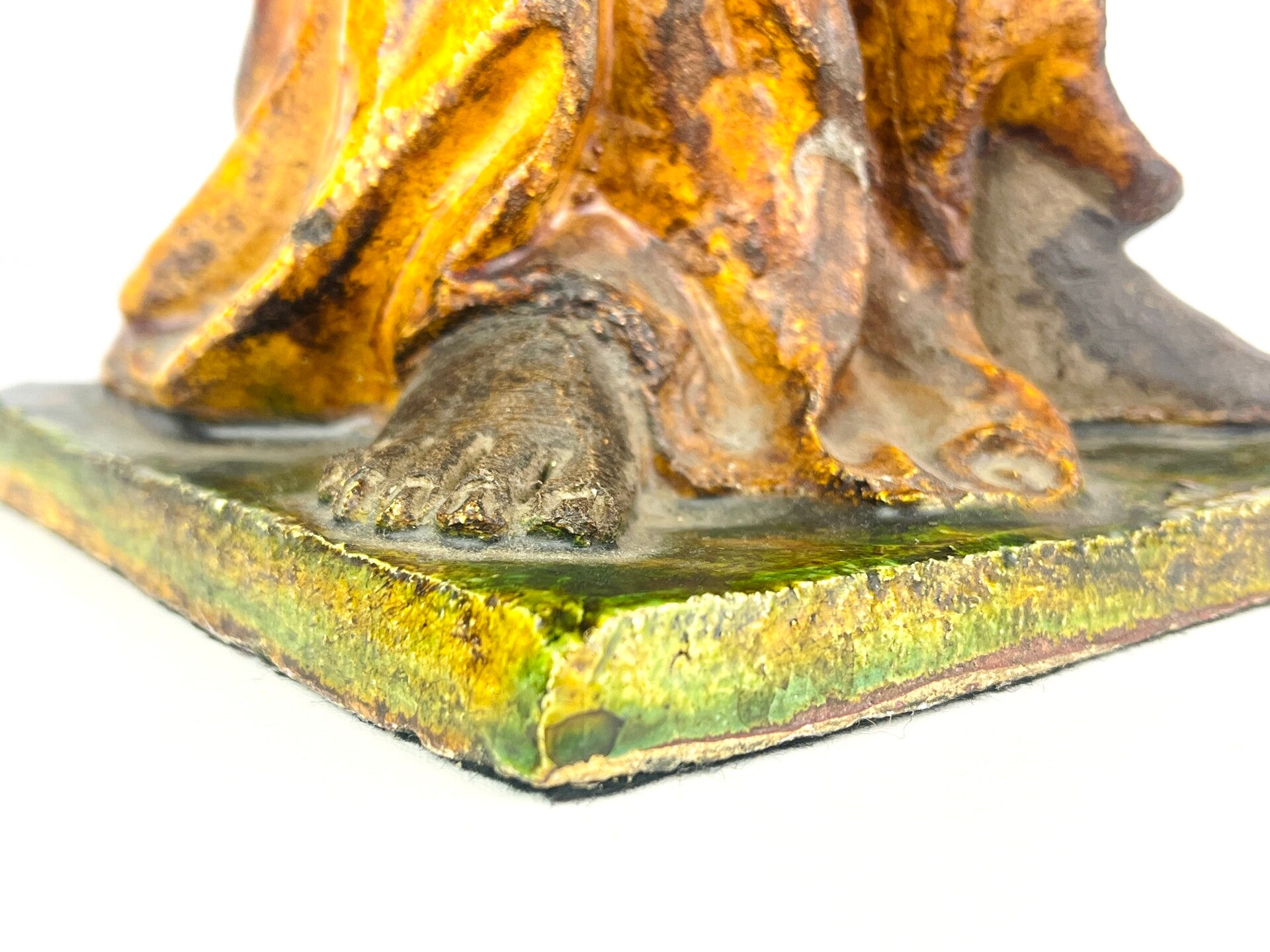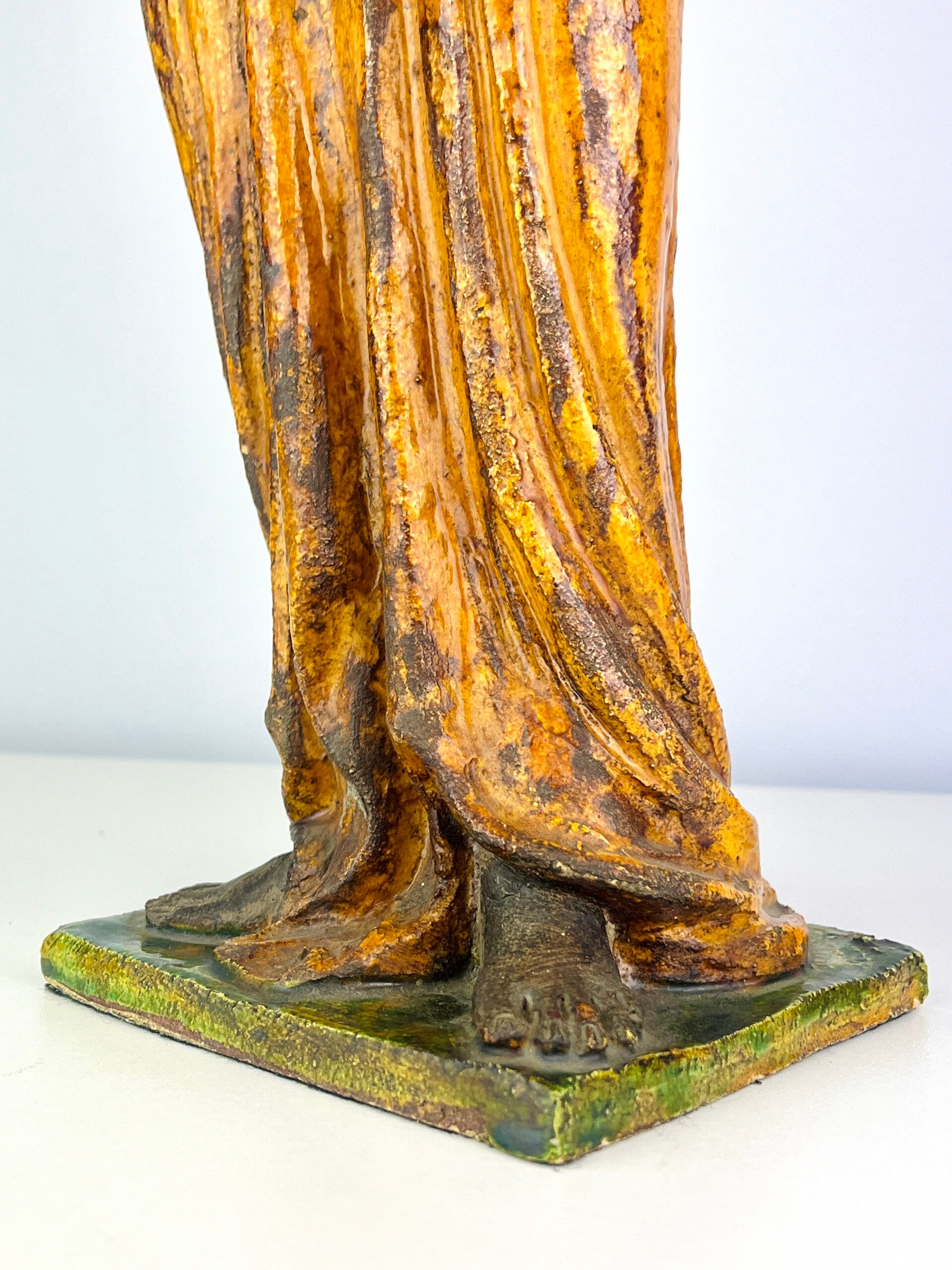 Beautiful large Guanyin in Sancia-Glazed stoneware from the 19th century. Exceptional glaze colours, orange dress with green tones, very rare. Similar pieces are very difficult to find.