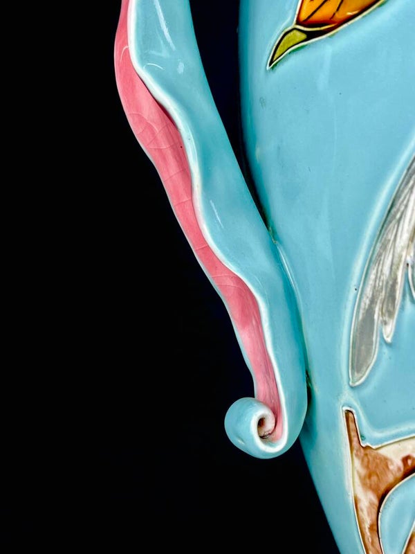 A pair of very large ceramic cockatoo vases, glazed in beautiful colours, the cockatoos are very finely detailed. As a basis, mainly blue tones are combined with soft pink tones that stand out beautifully in the whole.