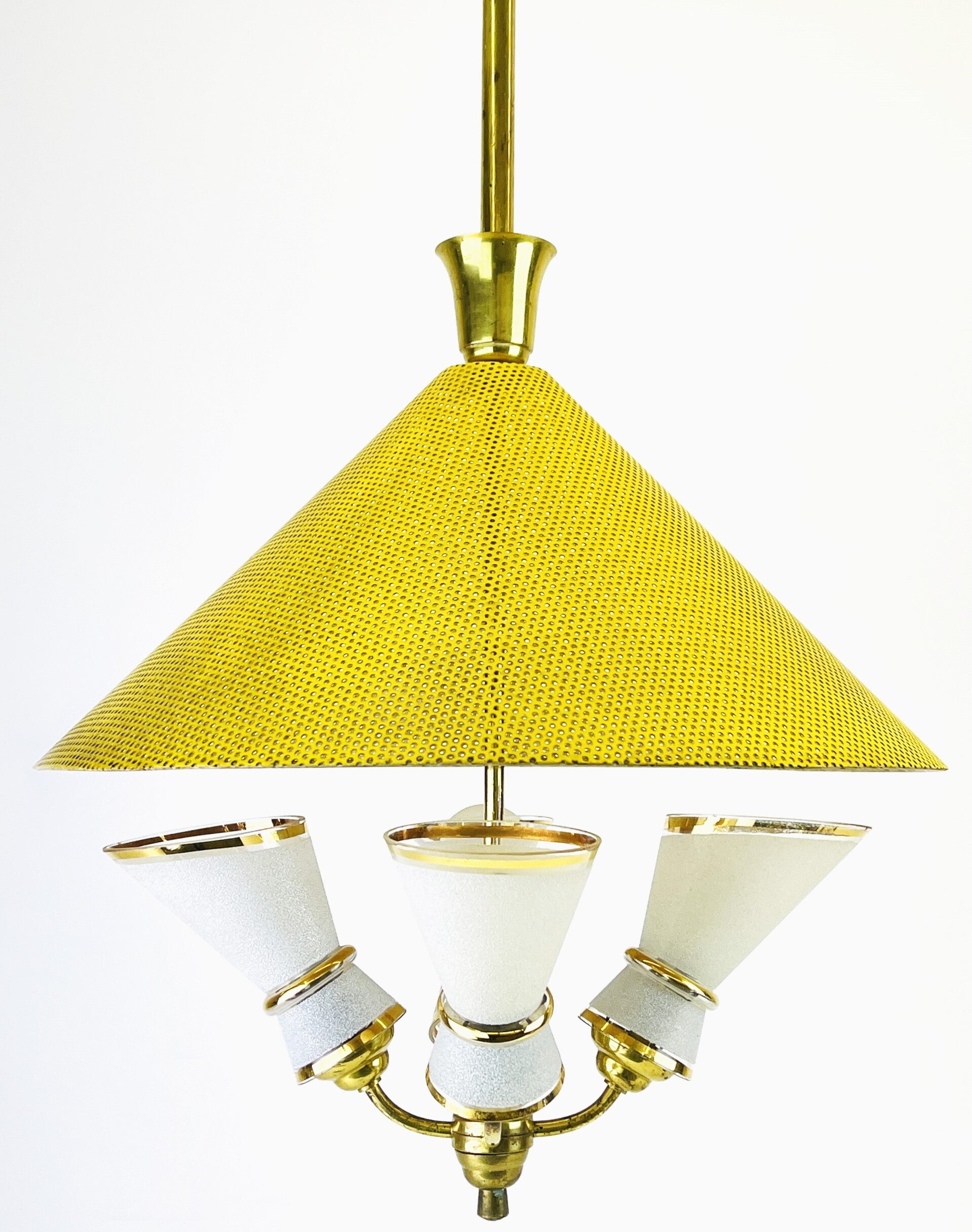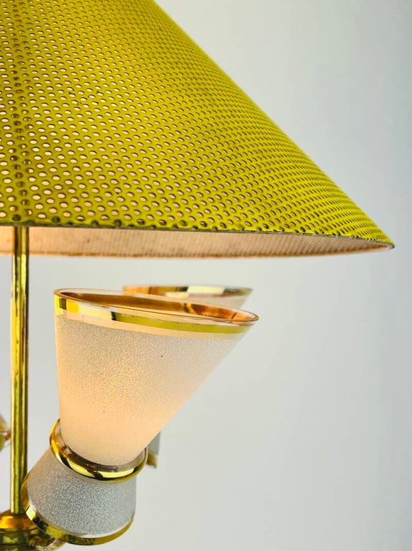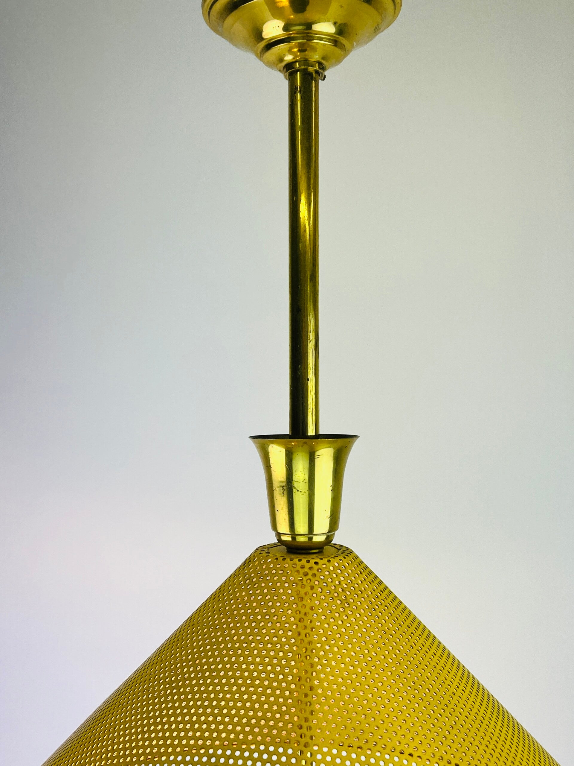 Unique French hanging lamp from the 1950s. A yellow perforated metal shade in the style of Mathieu Mategot.