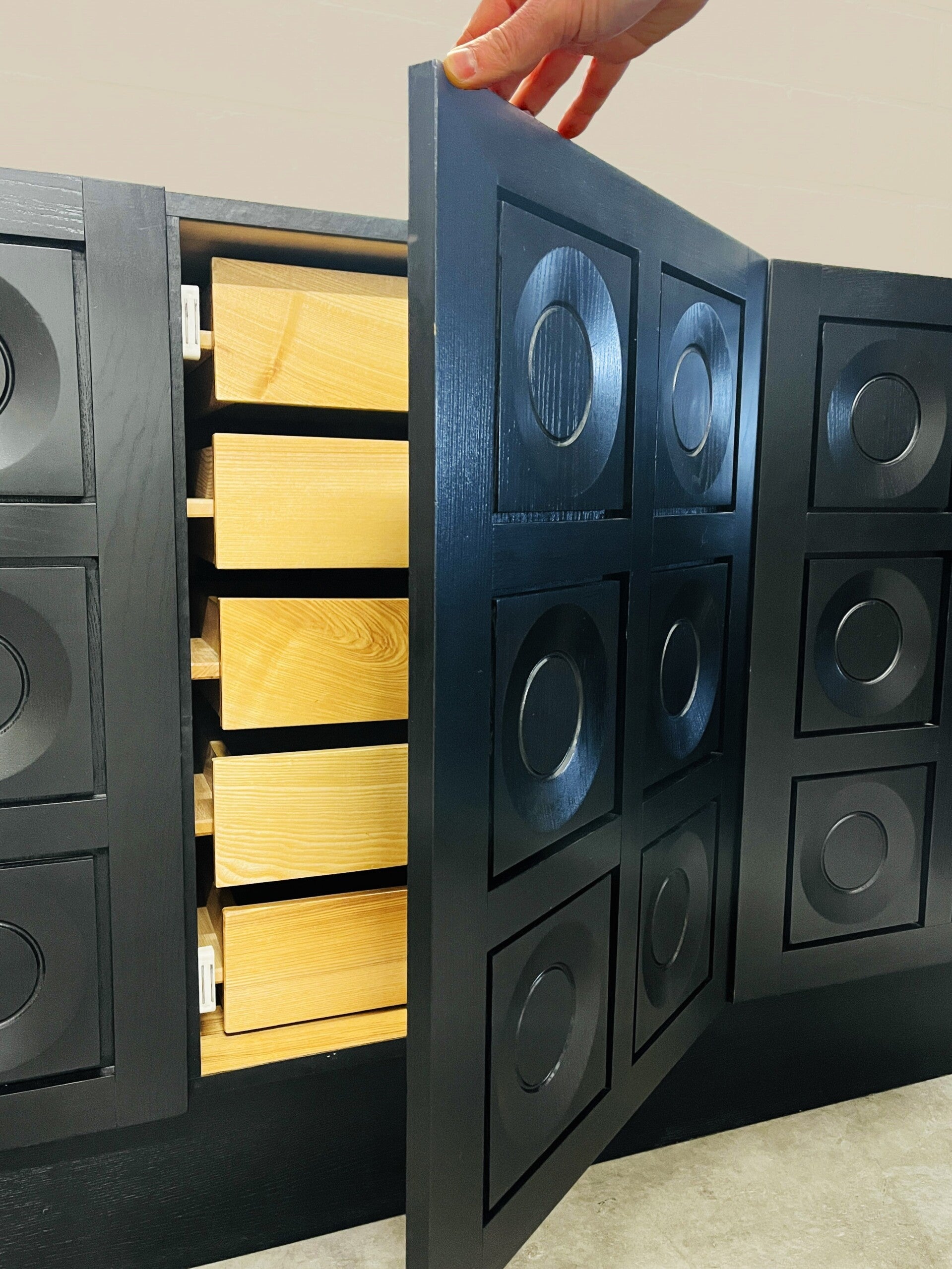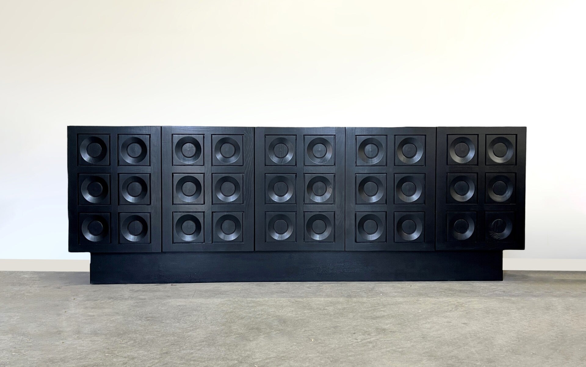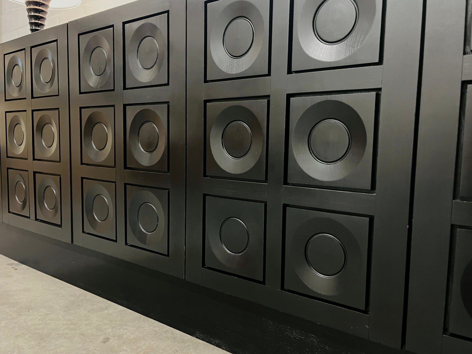 Brutalist sideboard in ebonized black with circular geometric patterned doors by Frans Defour.