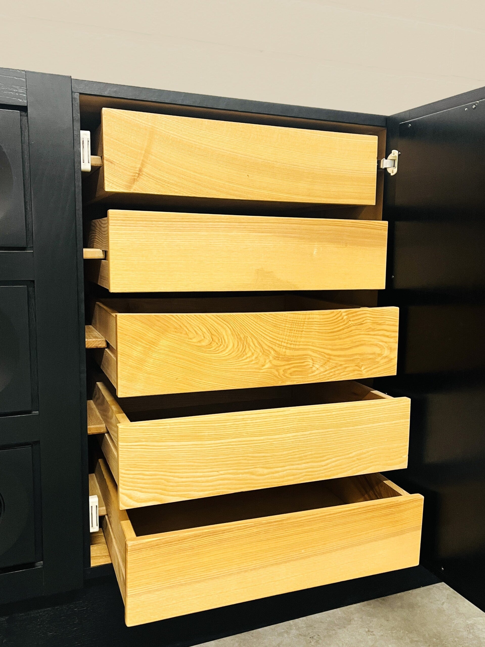 Long model with 5 doors, behind the central door there are 5 drawers. There are two shelves each on the right and left.