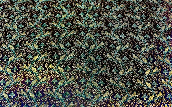 The seat was again upholstered with a green/gold fabric of birds and blossom branches.