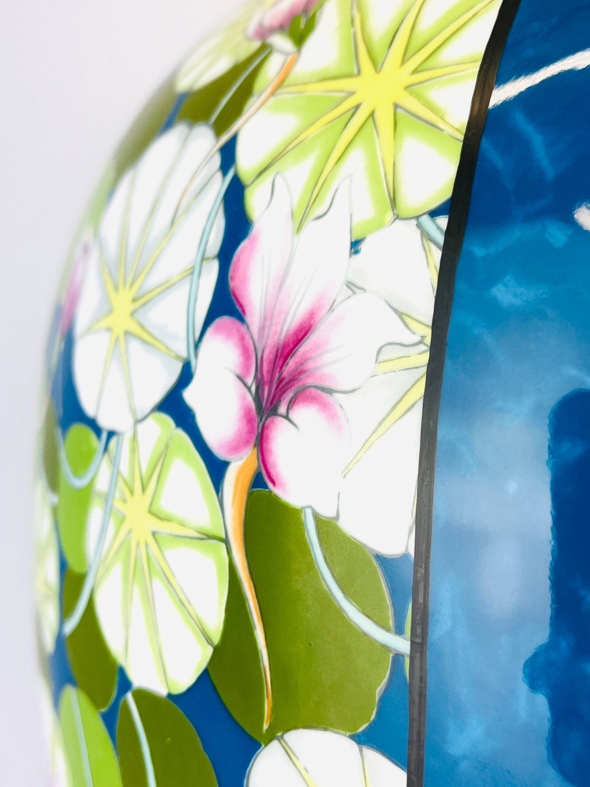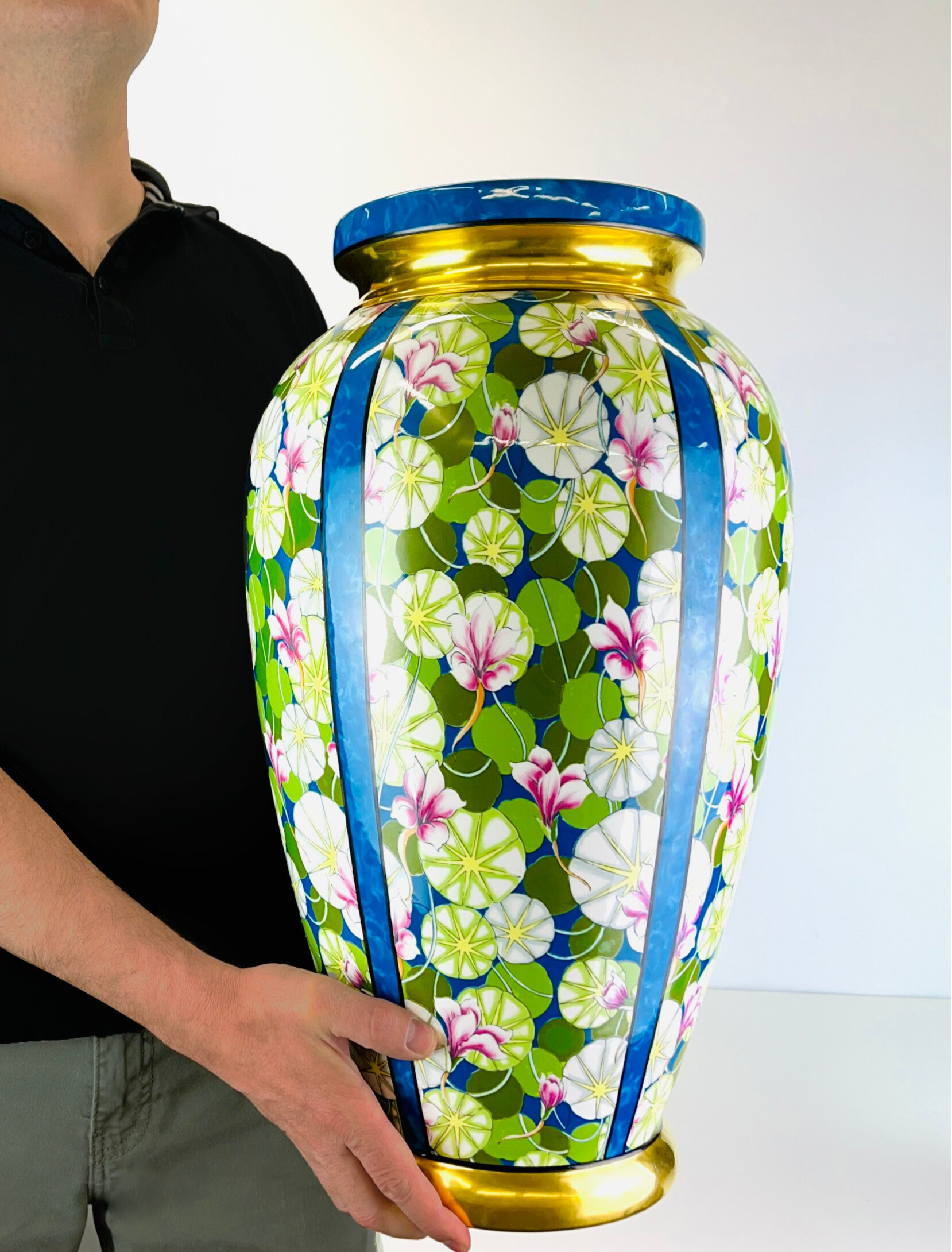 Very large vase in a beautiful decor of water lilies on a blue marbled surface finished with gold mirror gloss paint. A work from the porcelain factory Le Porcellane in Firenze, Italy. This piece is painted by hand.