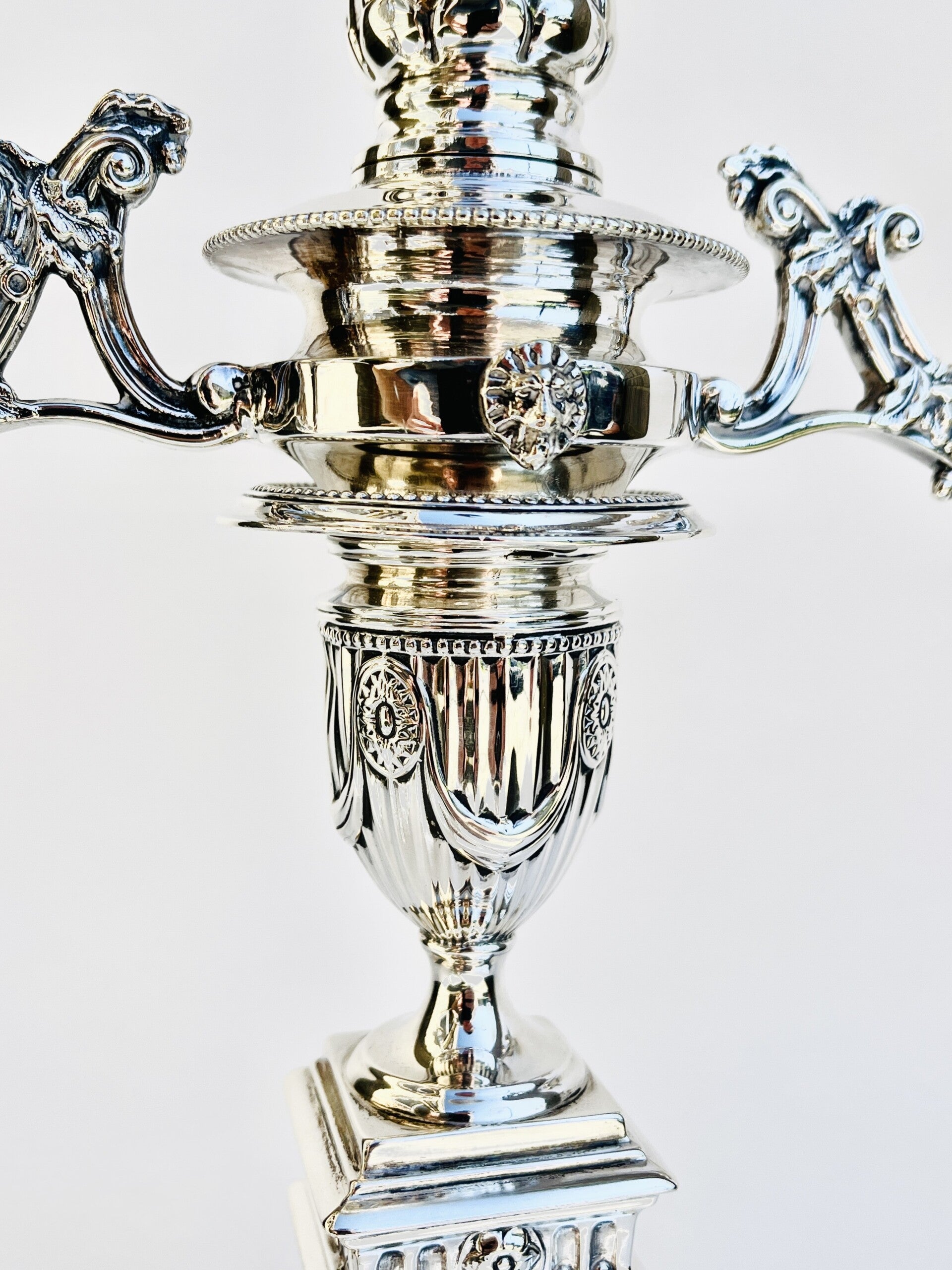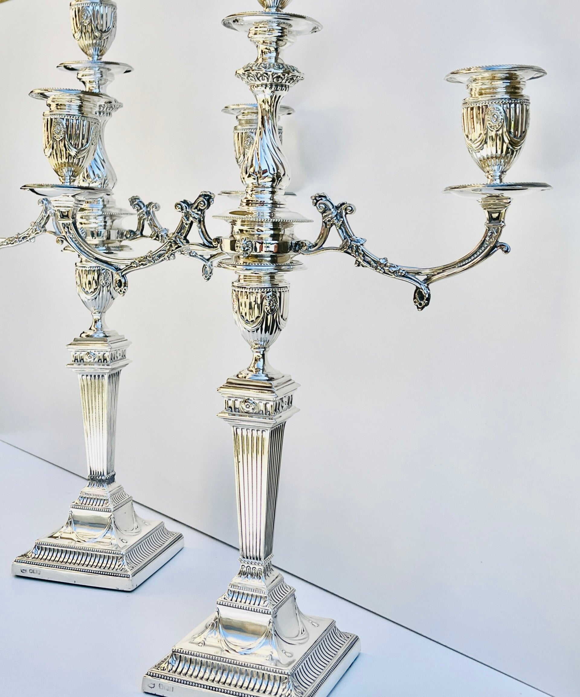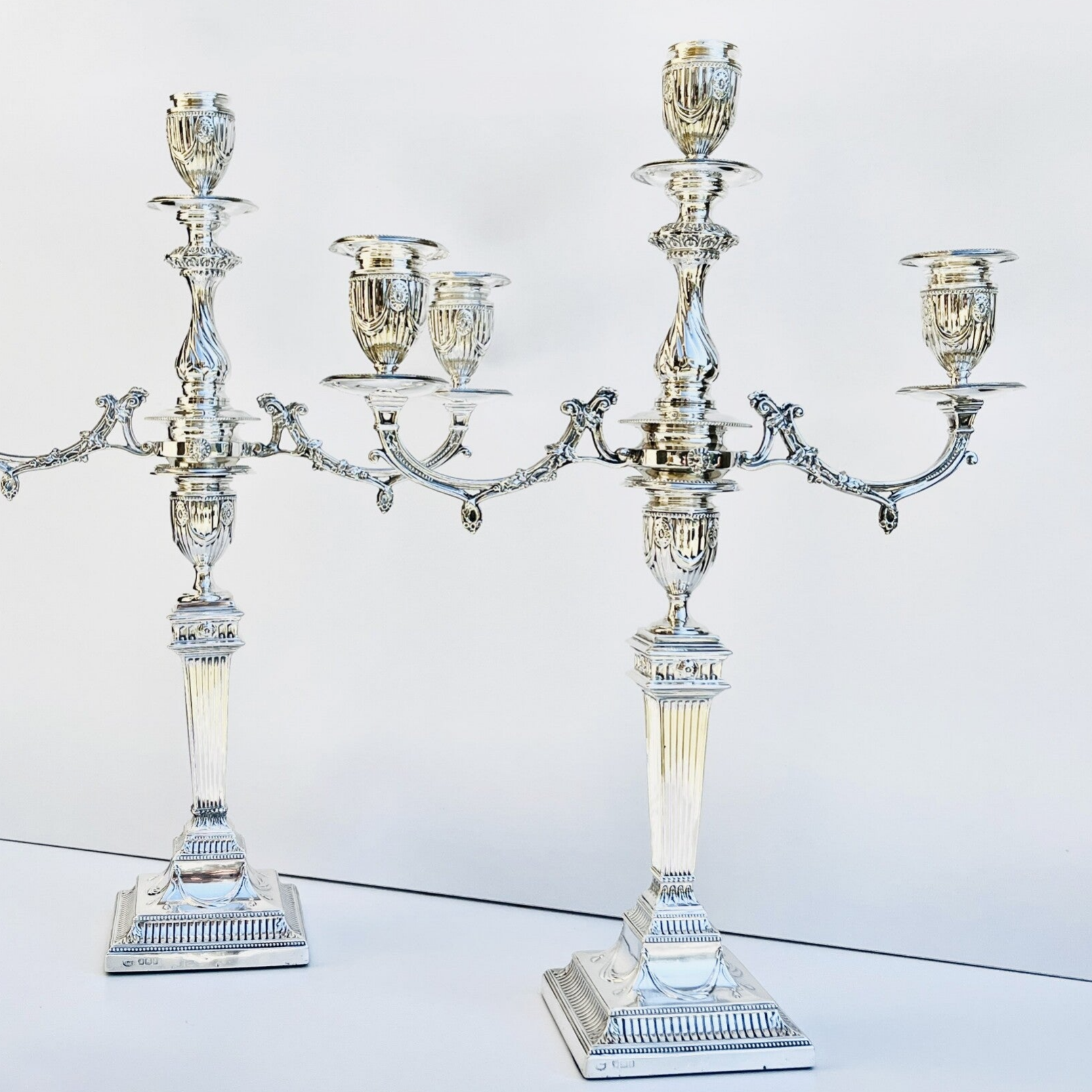 A pair of antique Victorian sterling silver 3-light candlesticks from the 19th Century.