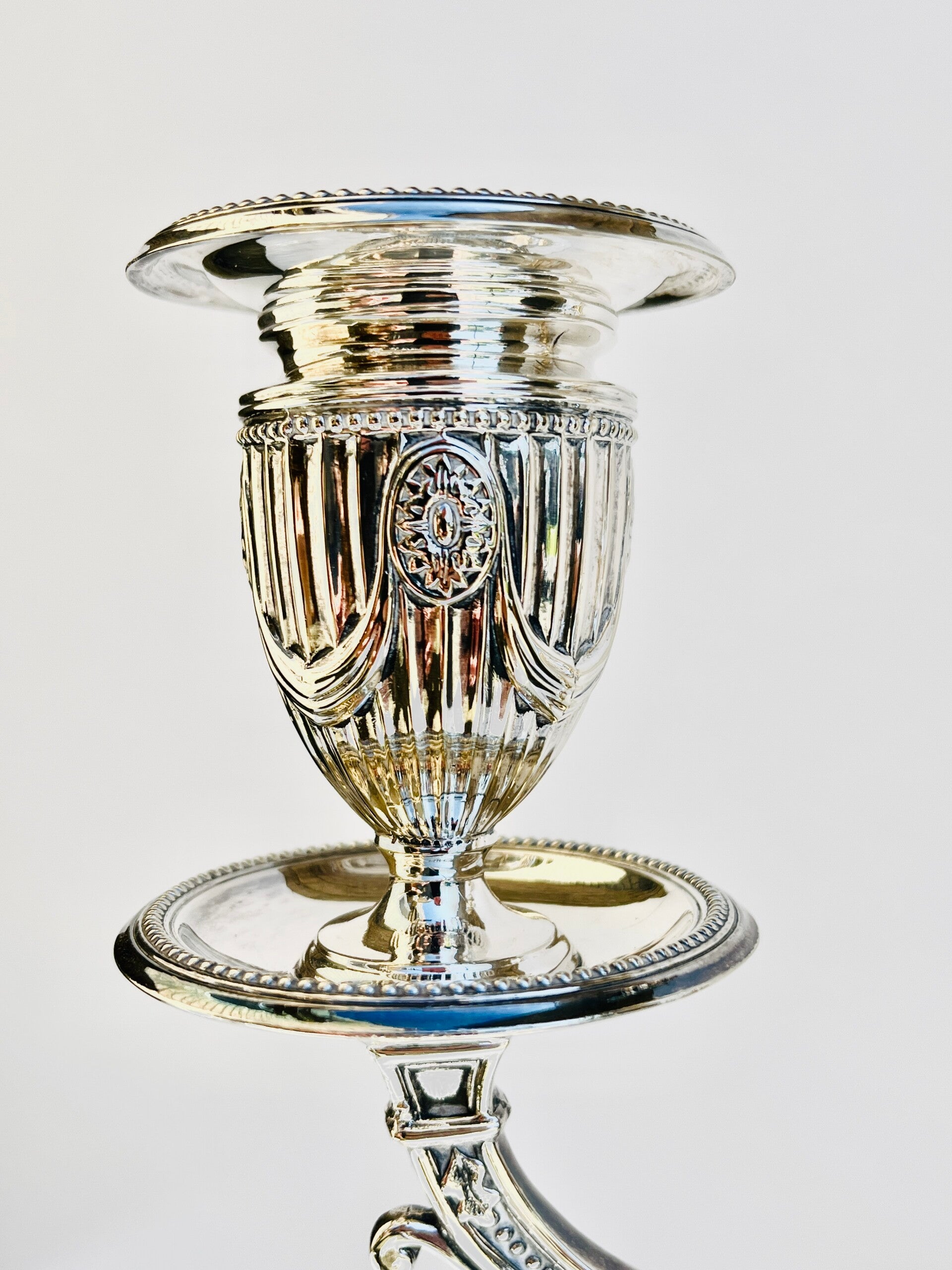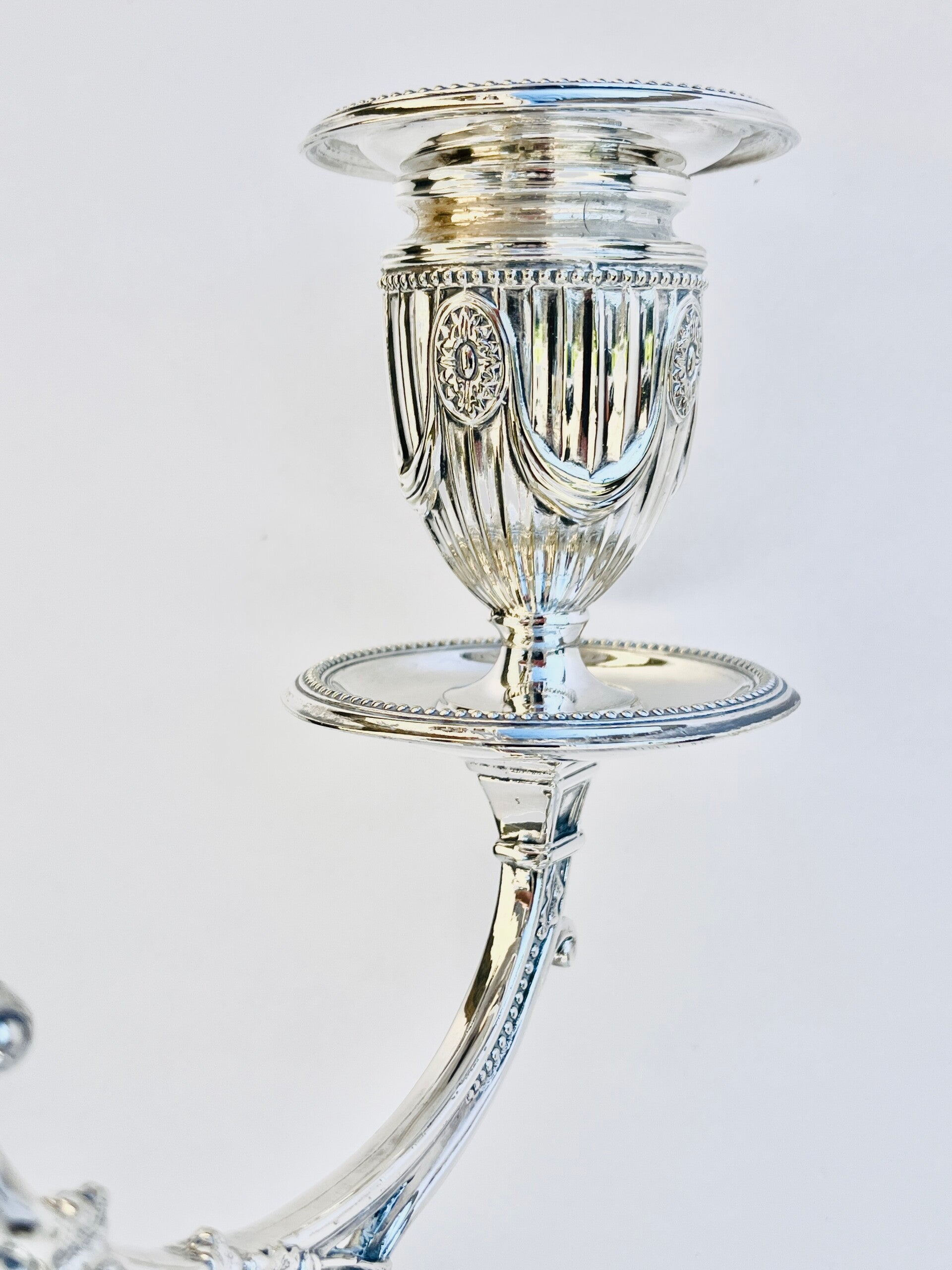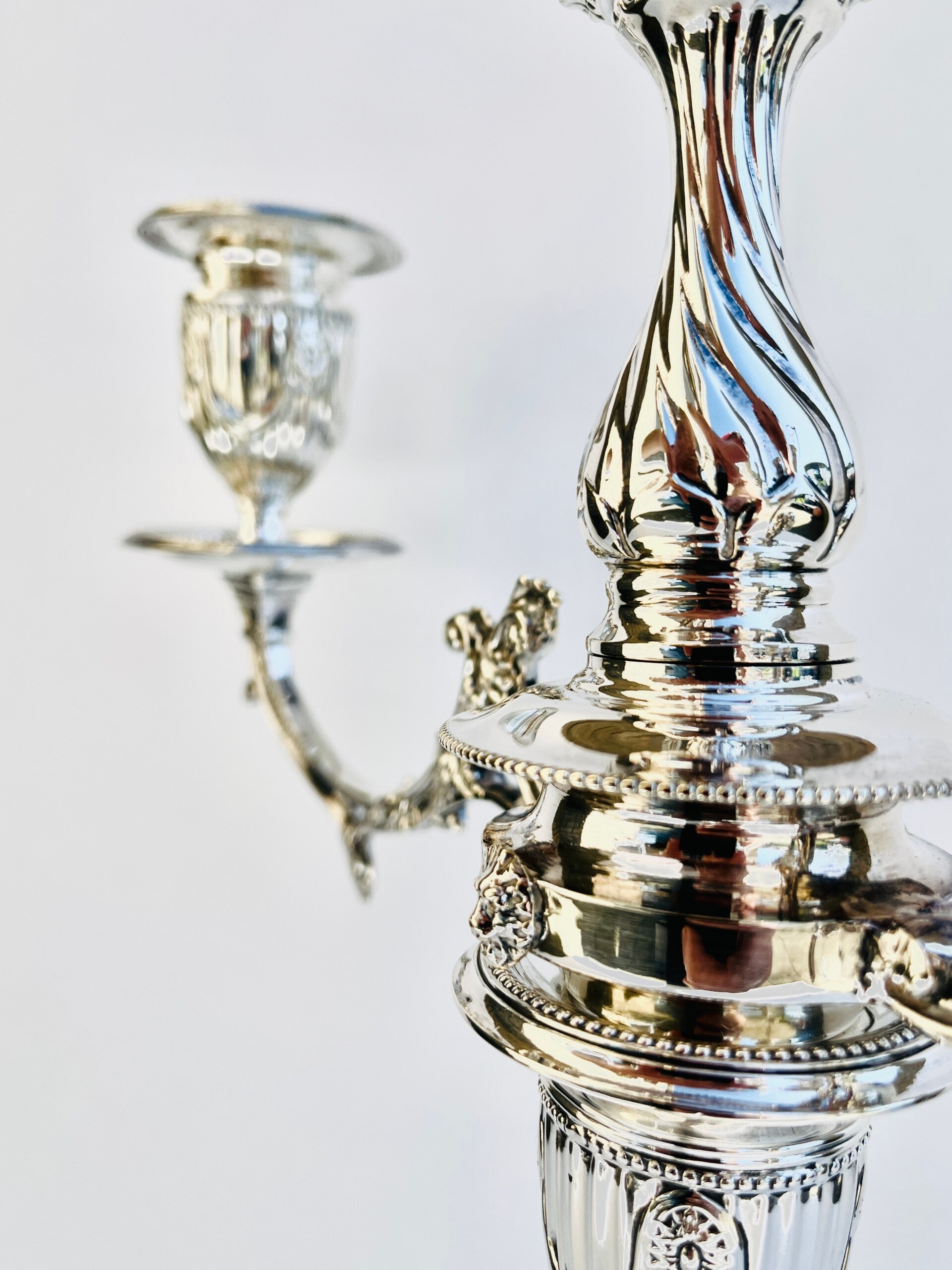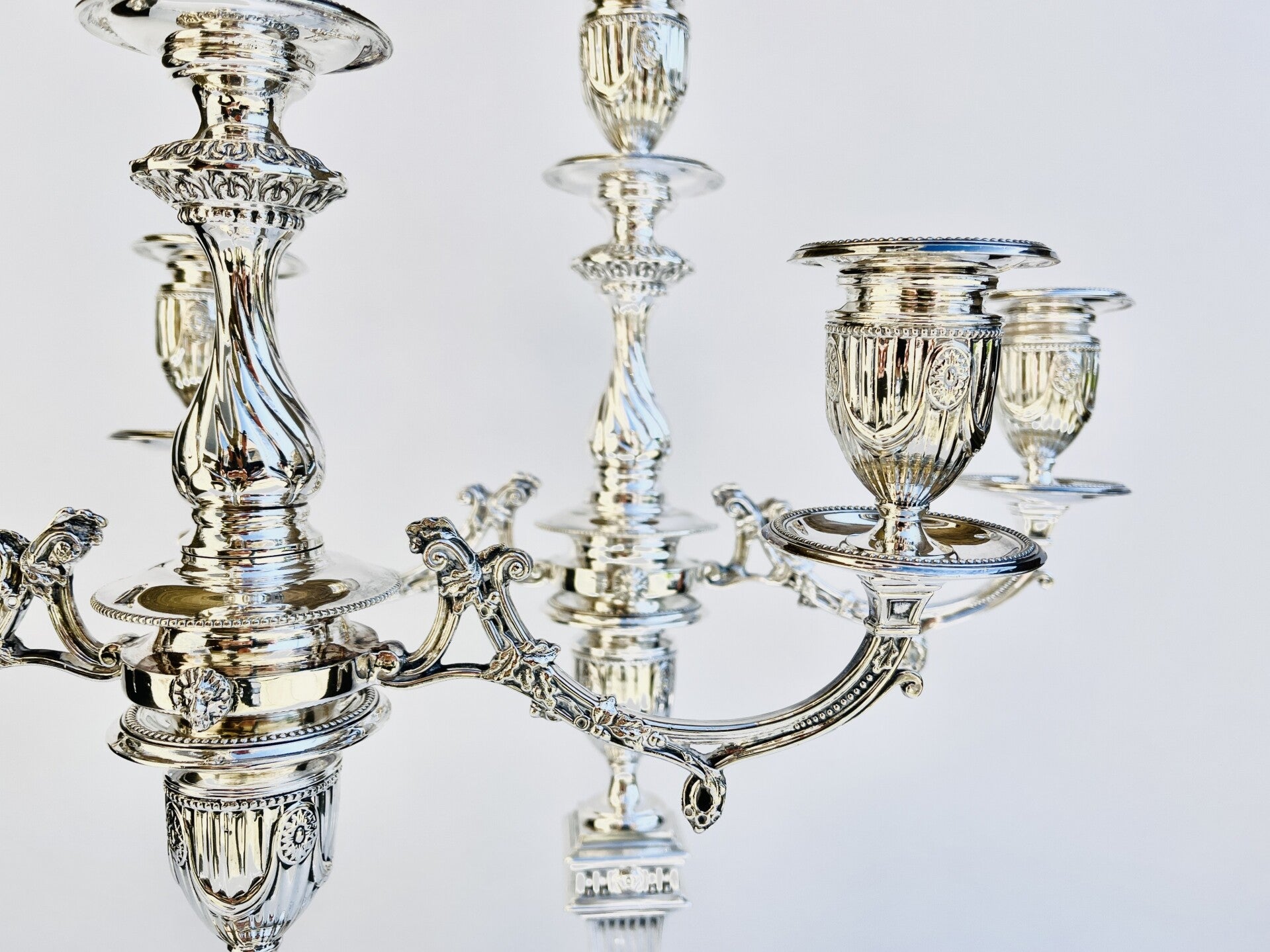 A pair of antique Victorian sterling silver 3-light candlesticks from the 19th Century.